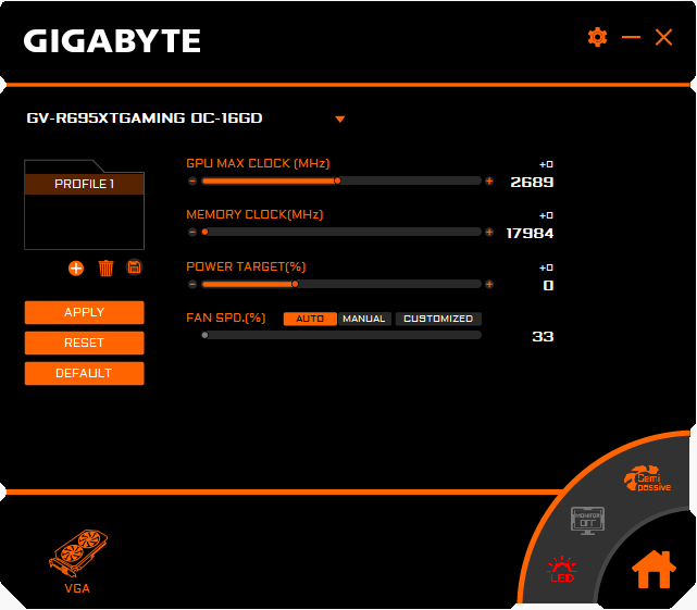 Штатная частота памяти у карты Gigabyte равна референсному значению. Частота работы ядра в режиме OC mode повышена в Boost-режиме совсем чуть-чуть, всего на 0,5% относительно референсной величины, а вот максимальная частота выше референсного максимума на 4%, поэтому суммарно прирост производительности оказался около 3,2% (при энергопотреблении около 290 Вт). При ручном разгоне потребление можно поднять до 109%, и карта стабильно работала при разгоне по ядру до максимальных 2855 МГц, а памяти — до 19200 МГц. Это примерно на 7% выше референсных величин, что дало прирост производительности примерно на 5%. Энергопотребление при этом доходило до 295 Вт.
