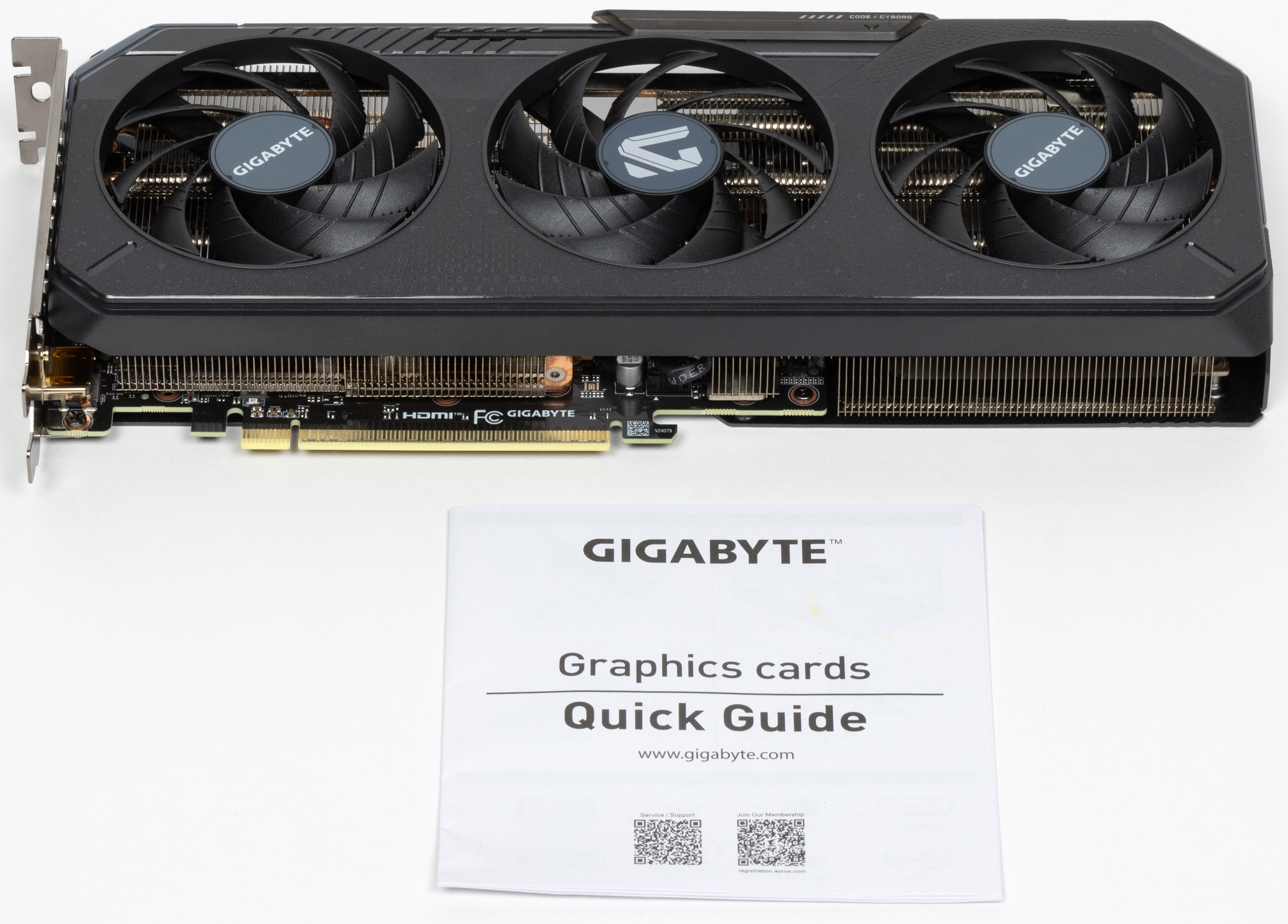 Поверх радиатора установлен кожух с тремя вентиляторами ∅90 мм, имеющими по 9 лопастей и работающими на единой частоте вращения (по умолчанию, но через программу Gigabyte Control Center можно настроить работу отдельно каждого вентилятора).