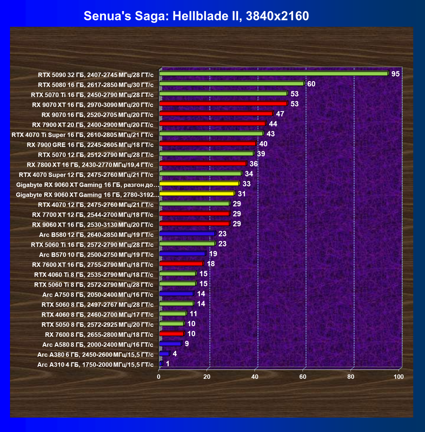 | 16 | RX 9060 XT 16 ГБ, 2530—3130 МГц/20 ГТ/с | 2423 | 539 | 45 000 |
