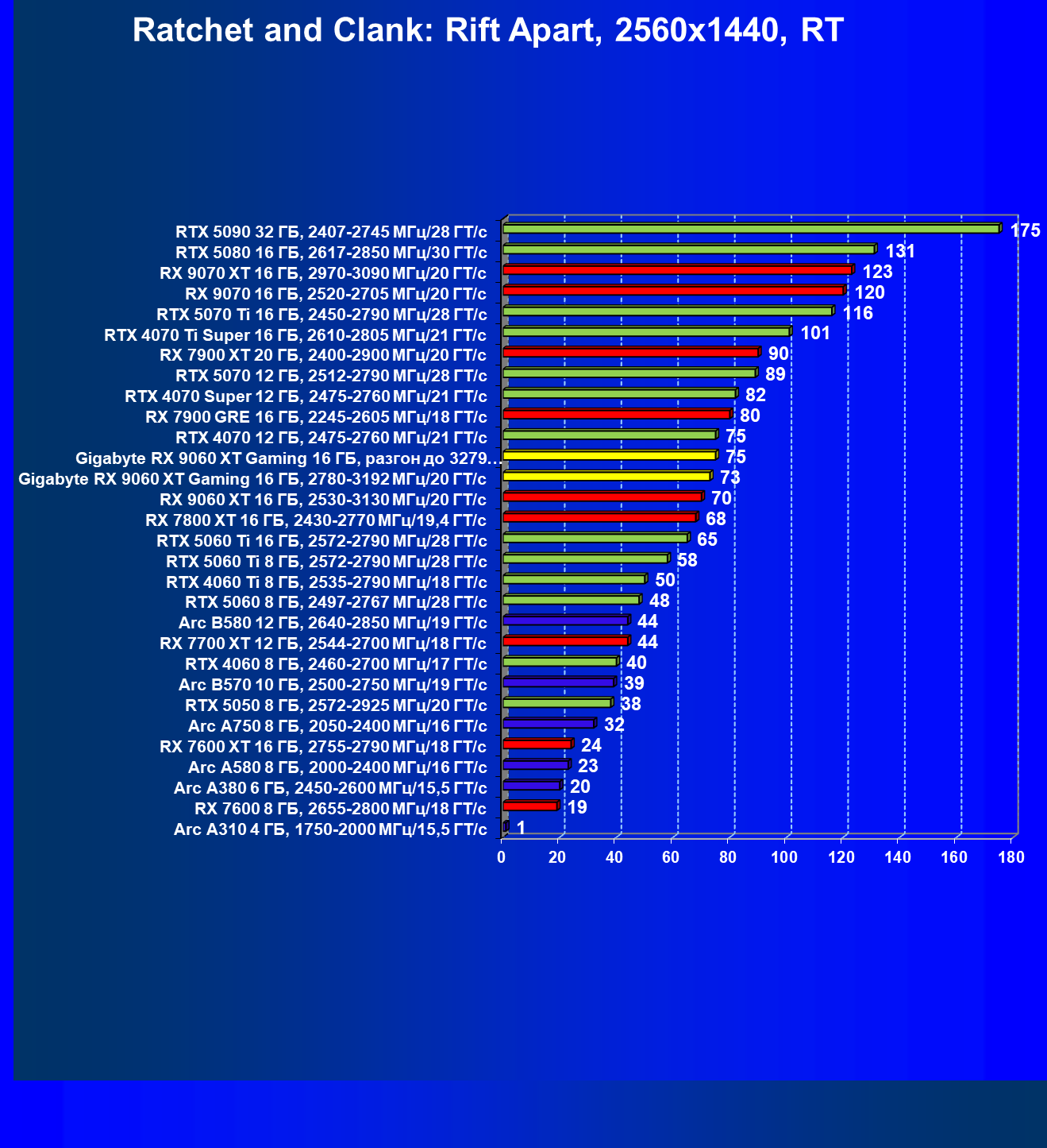 | 10 | RX 9060 XT 16 ГБ, 2530—3130 МГц/20 ГТ/с | 289 | 1302 | 45 000 |