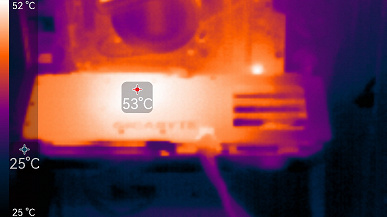 В режиме максимальной нагрузки в 3D температура достигала 55/82/82 °C (ядро/hot spot/память). Вентиляторы при этом раскручивались до 1968 оборотов в минуту, шум вырастал до 27,4 дБА: это тихо.