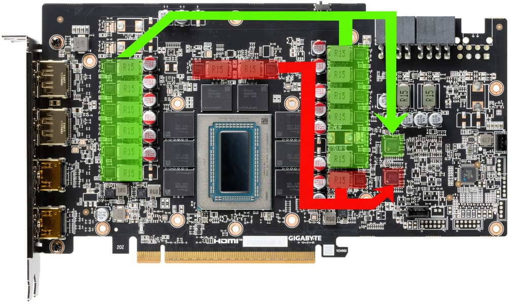 Зеленым цветом отмечена схема питания ядра (11 фаз), красным — памяти (3 фазы).