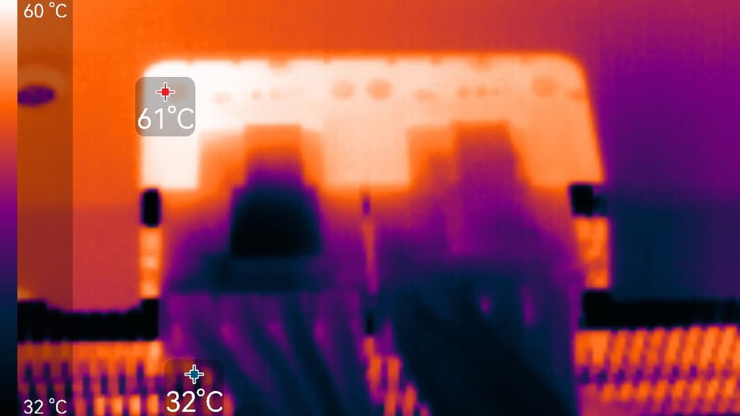Максимальный нагрев наблюдался в центральной части PCB и у разъемов питания.