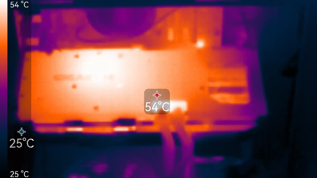 В режиме максимальной нагрузки в 3D температура достигала 63/84/94 °C (ядро/hot spot/память). Вентиляторы при этом раскручивались до 1365 оборотов в минуту, шум вырастал до 21,8 дБА: это также очень тихо.