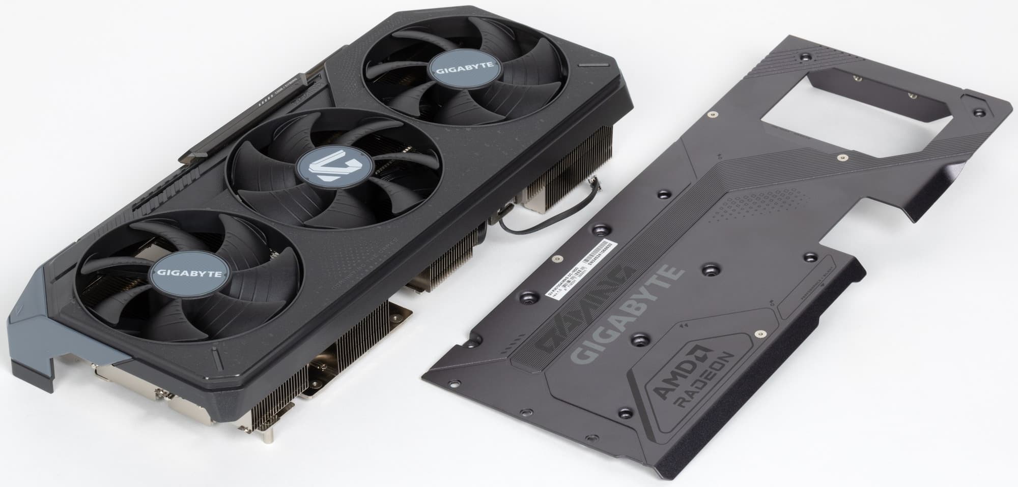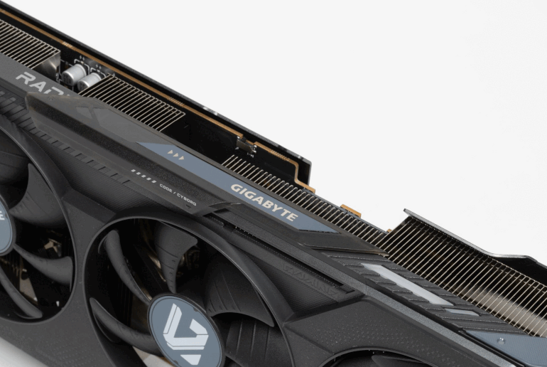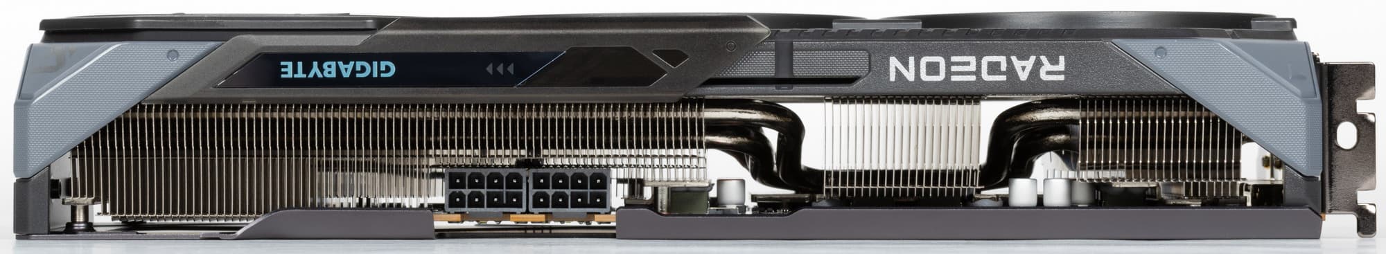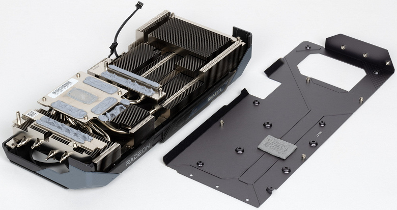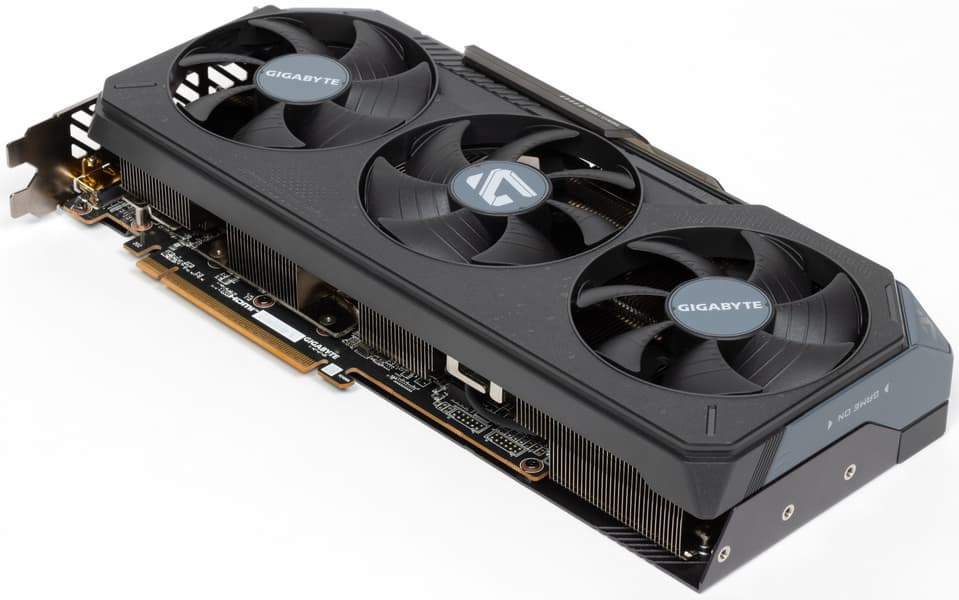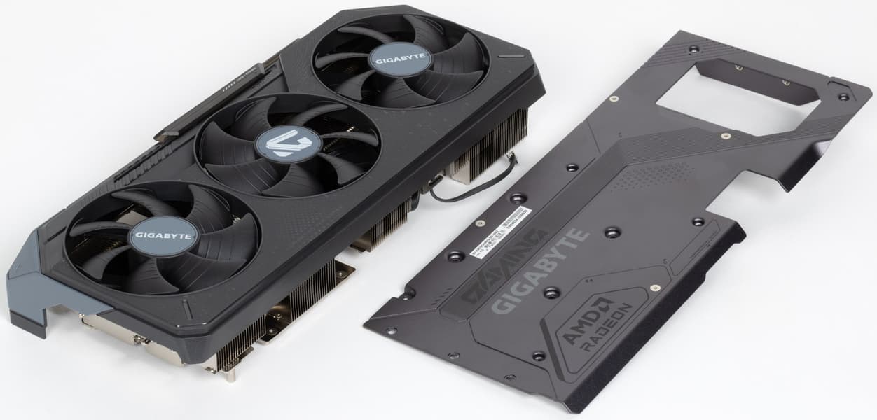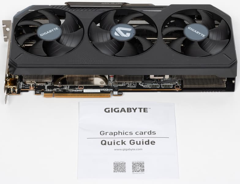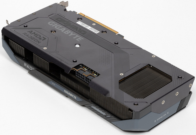 Система охлаждения крайне мощная, высокоэффективная и тихая. При этом карта имеет стандартные размеры: 29 см в длину и 13 см в высоту, а по толщине видеокарта занимает 3 слота в корпусе. Карта обладает простой подсветкой, которую можно синхронизировать с материнскими платами Gigabyte через приложение GCC. Карта может потреблять до 245 Вт (официальный лимит AMD — 250 Вт) и имеет два 8-контактных разъема питания. У нее 4 видеовыхода: 2 HDMI 2.1b и 2 DisplayPort 2.1a.