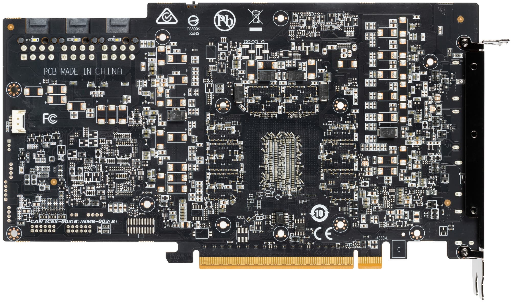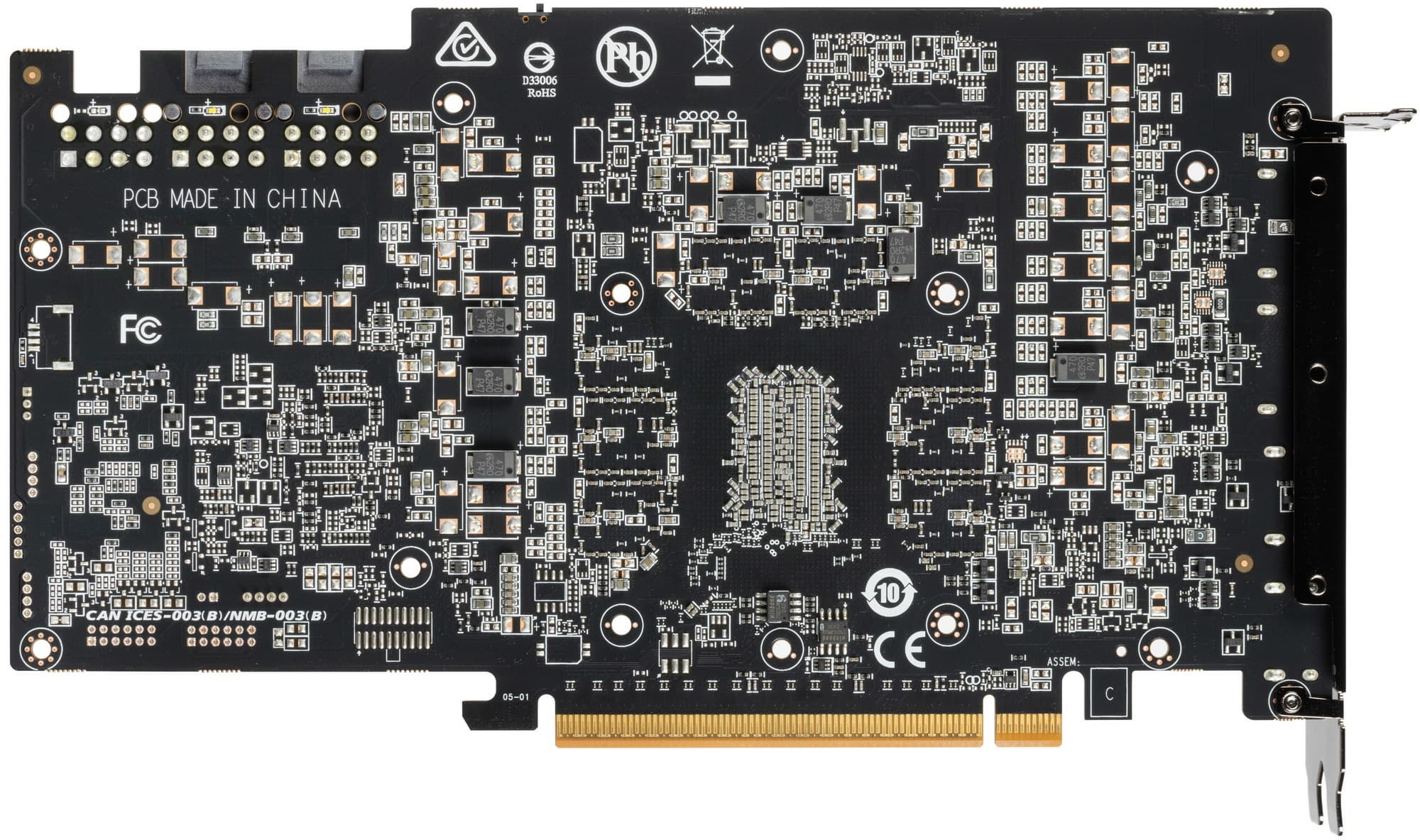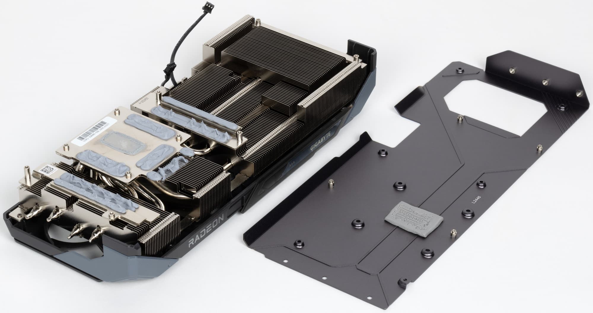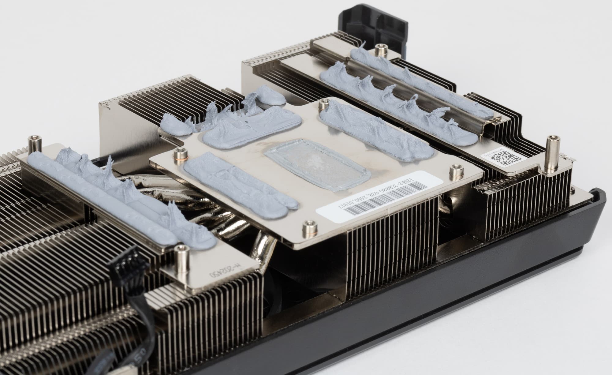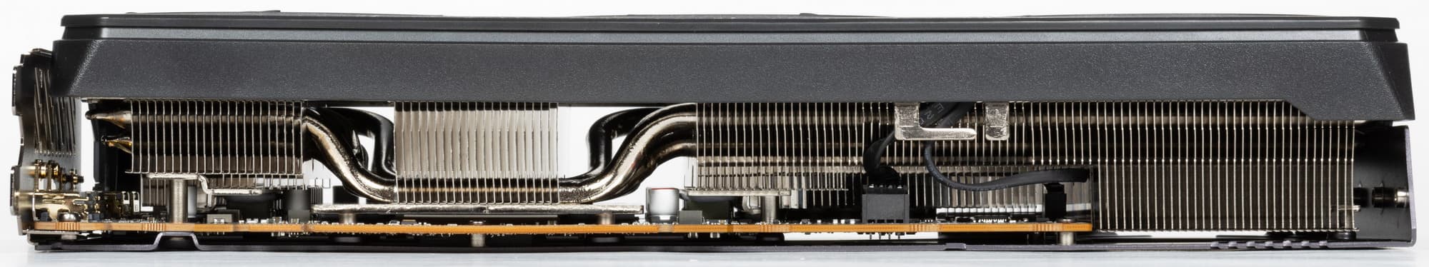 8 трубок припаяны к большой медной никелированной пластине, которая охлаждает как ядро, так и микросхемы памяти. Для охлаждения преобразователей питания VRM имеются свои подошвы на радиаторе. Задняя пластина не только служит элементом защиты PCB, но и участвует в охлаждении тыльной стороны PCB в области ядра через термопрокладки.