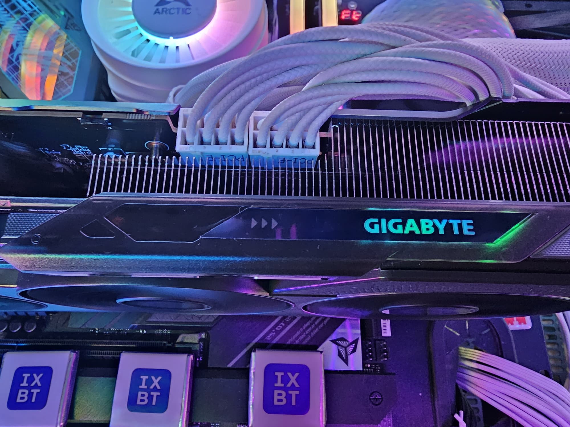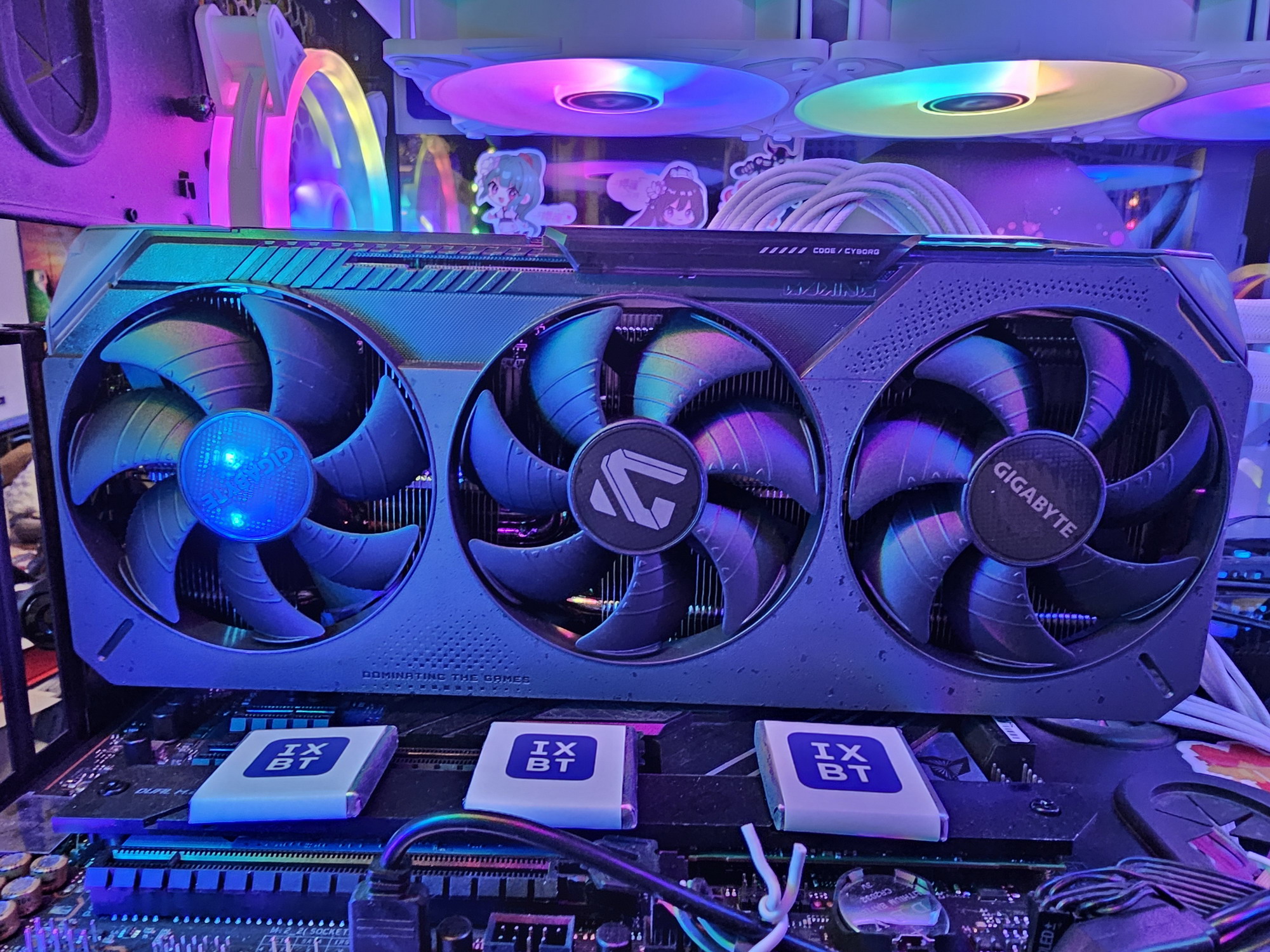 В традициях карт Gigabyte, средний вентилятор вращается в противоположную сторону, образуя с крайними вентиляторами «эффект шестеренок», помогающий бороться с турбулентностью воздушных потоков.