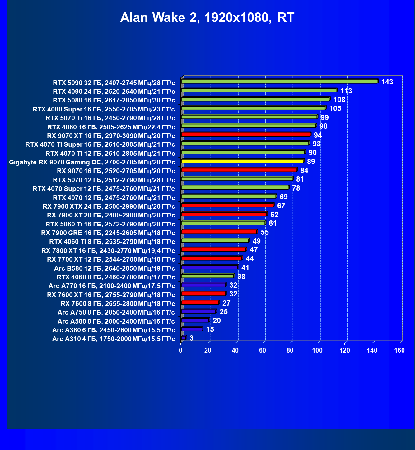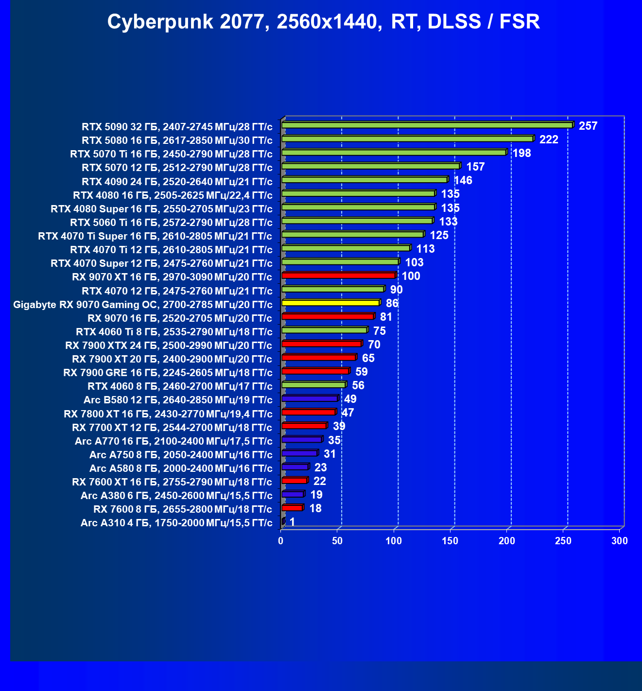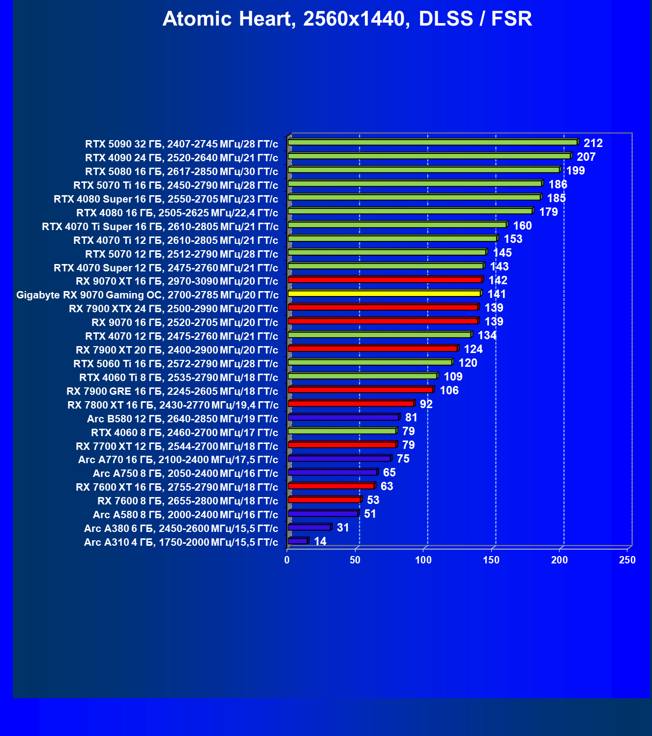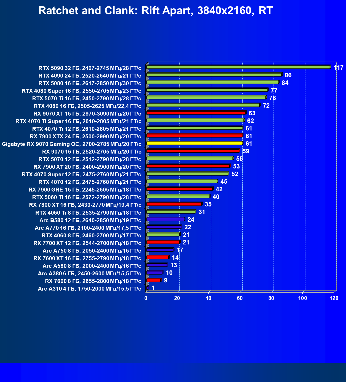 | 09 | Gigabyte RX 9070 Gaming OC, 2700—2785 МГц/20 ГТ/с | 2142 | 261 | 82 000 |
