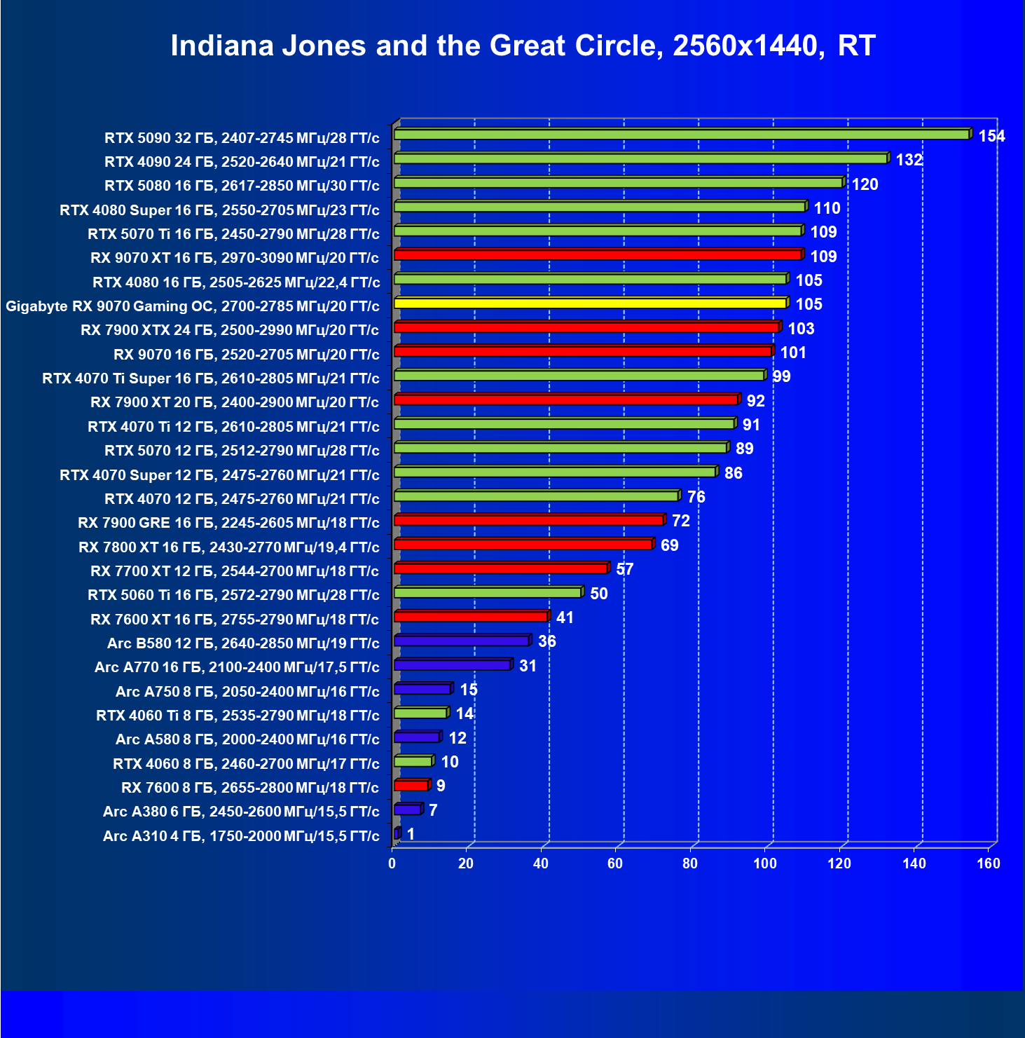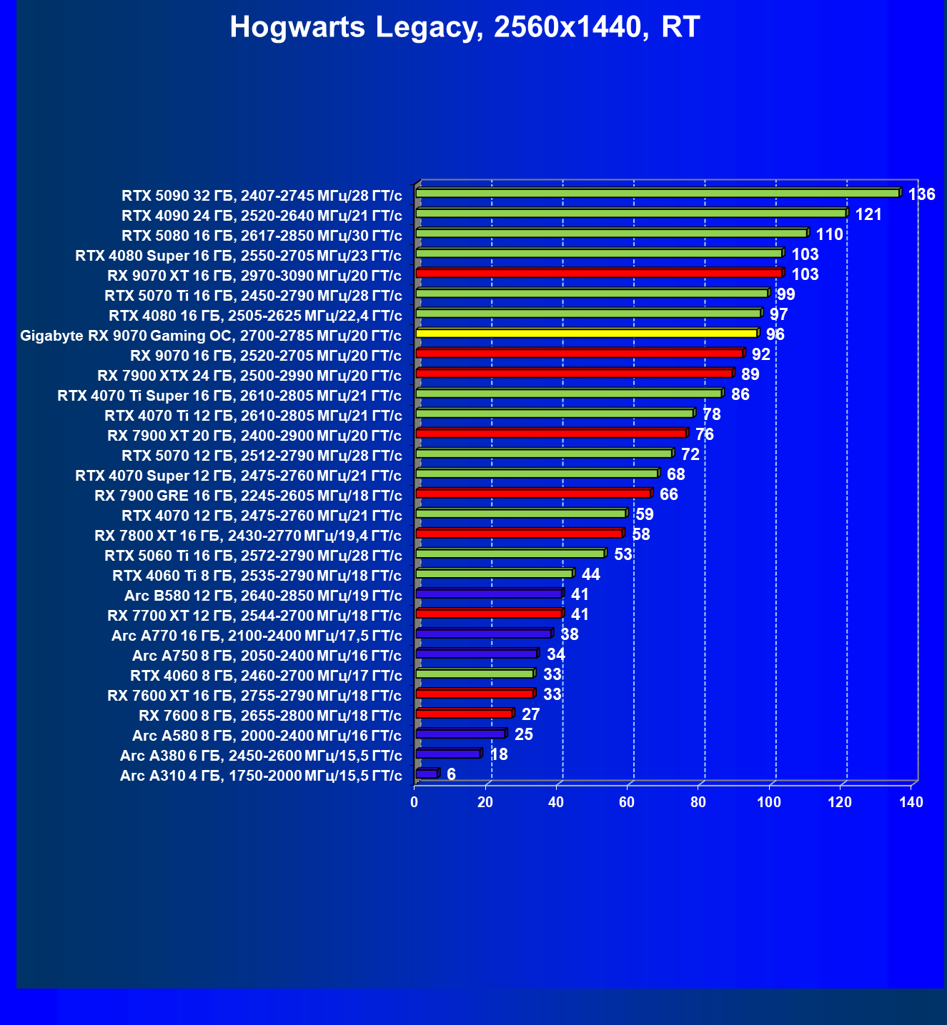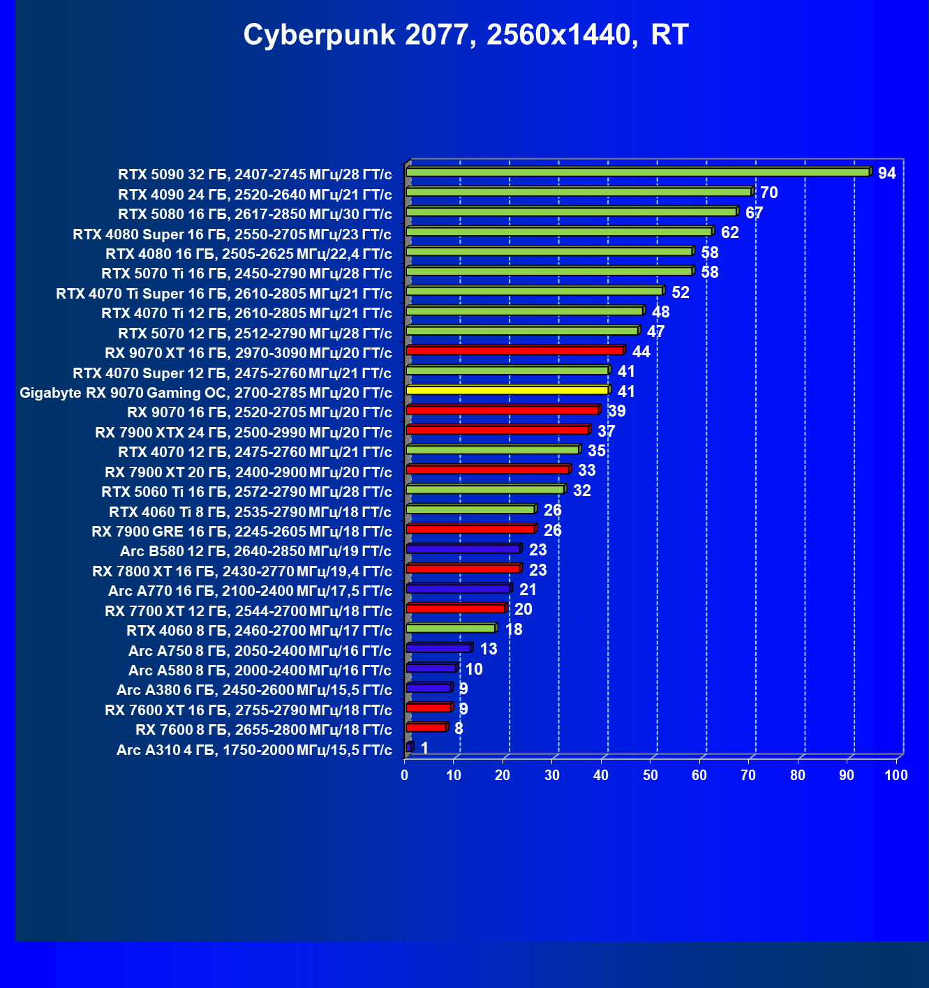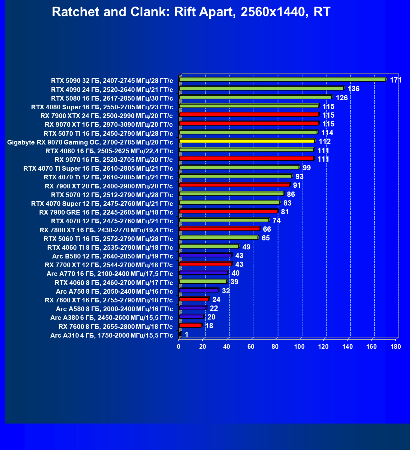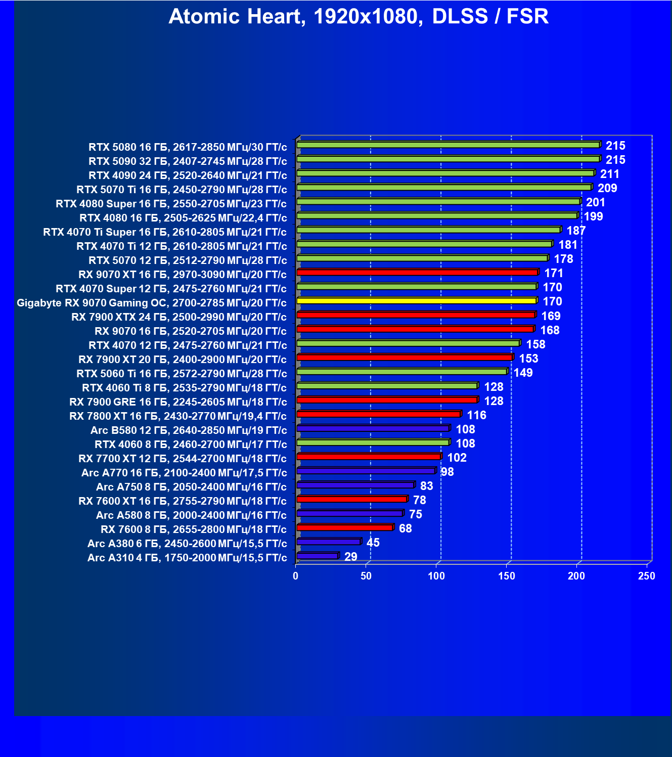 | 09 | Gigabyte RX 9070 Gaming OC, 2700—2785 МГц/20 ГТ/с | 2142 | 261 | 82 000 |
