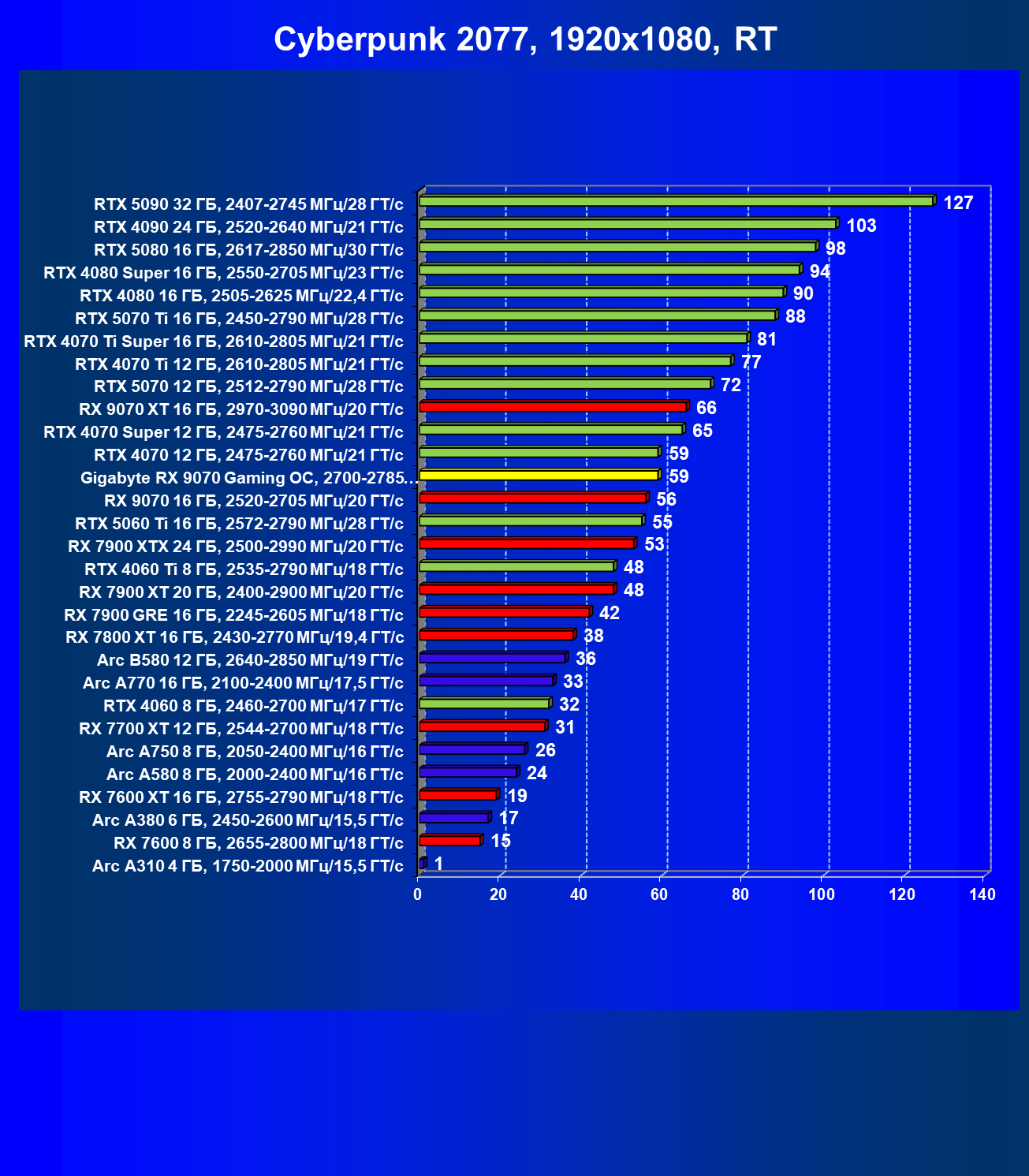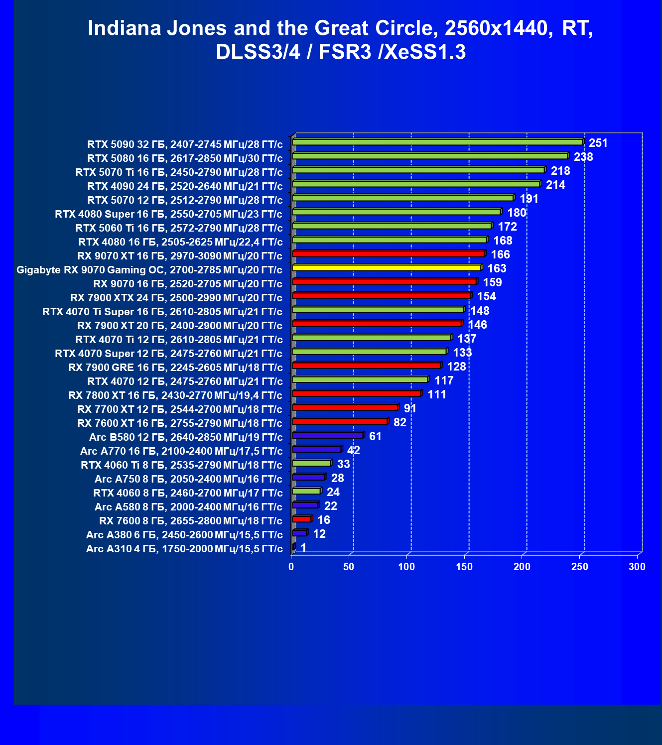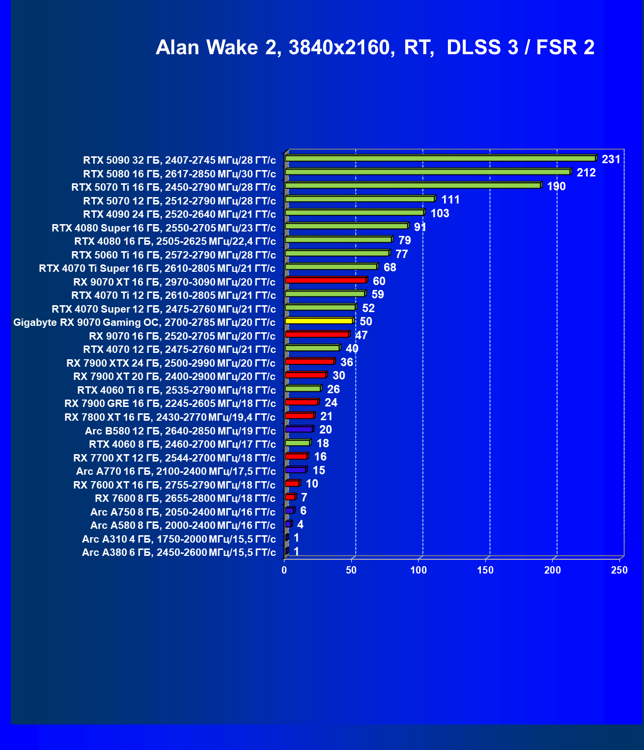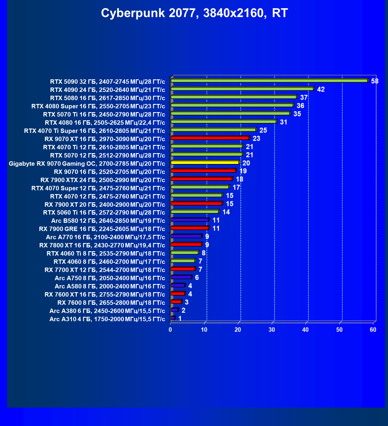 | 09 | Gigabyte RX 9070 Gaming OC, 2700—2785 МГц/20 ГТ/с | 2142 | 261 | 82 000 |