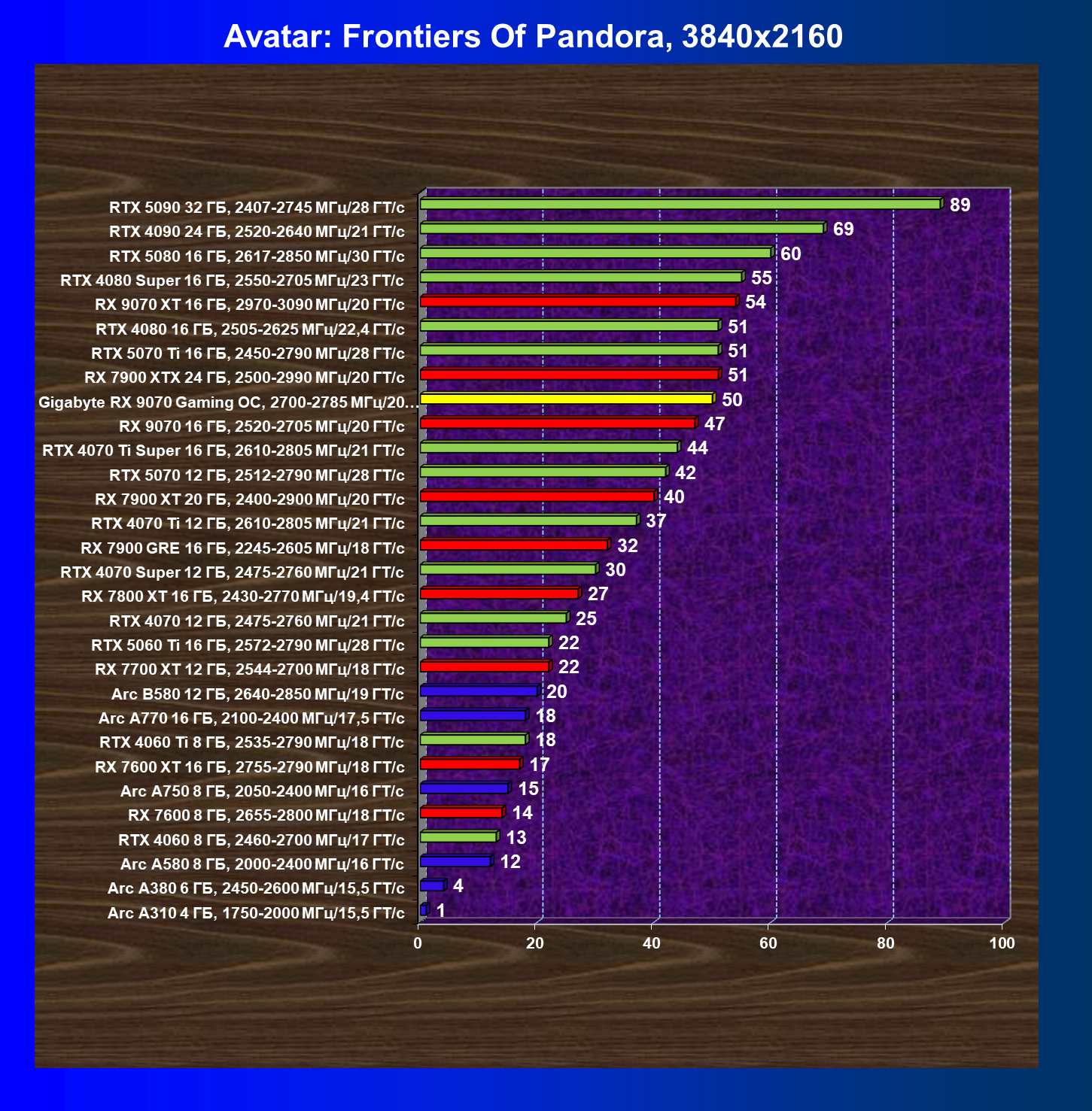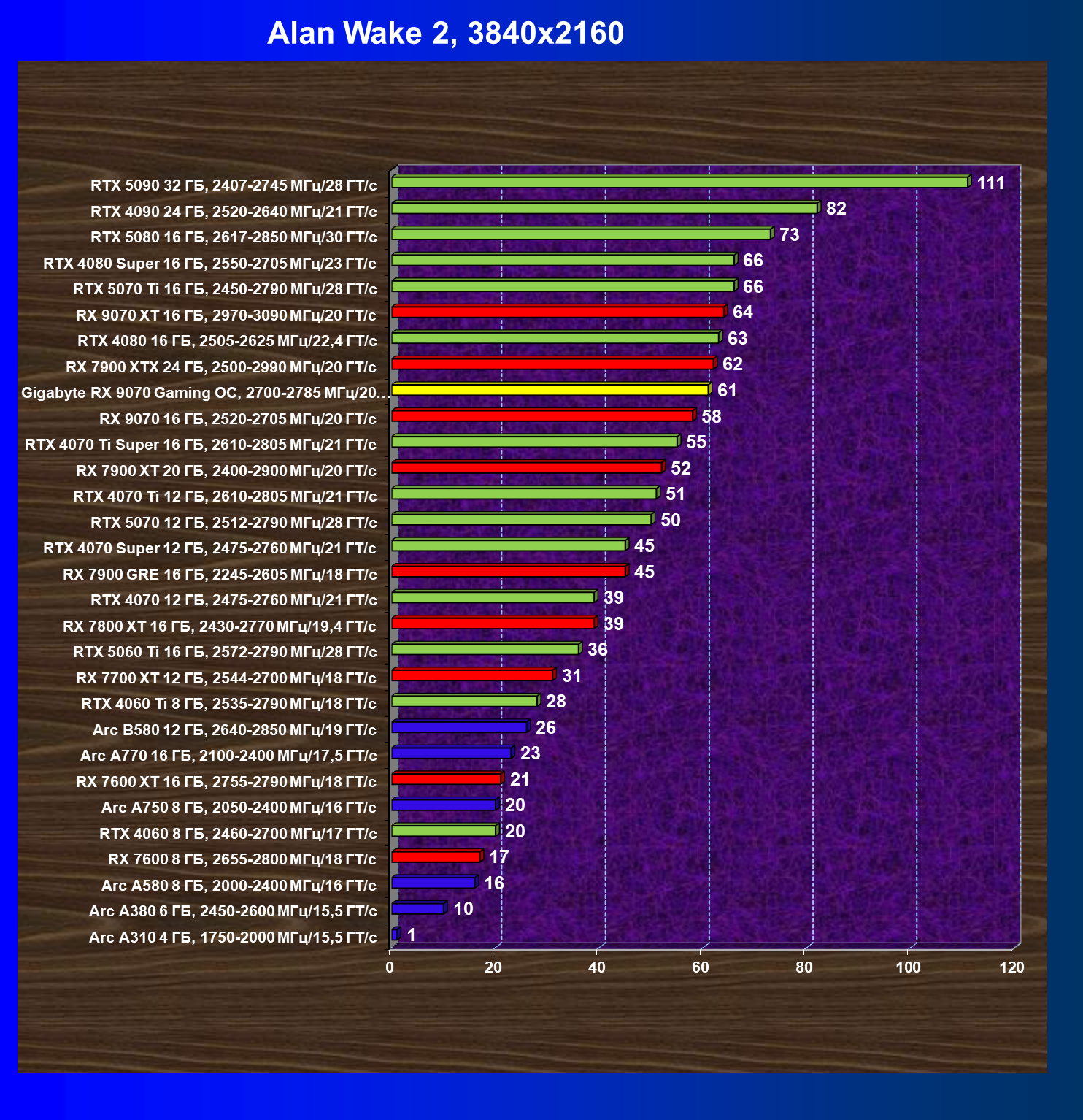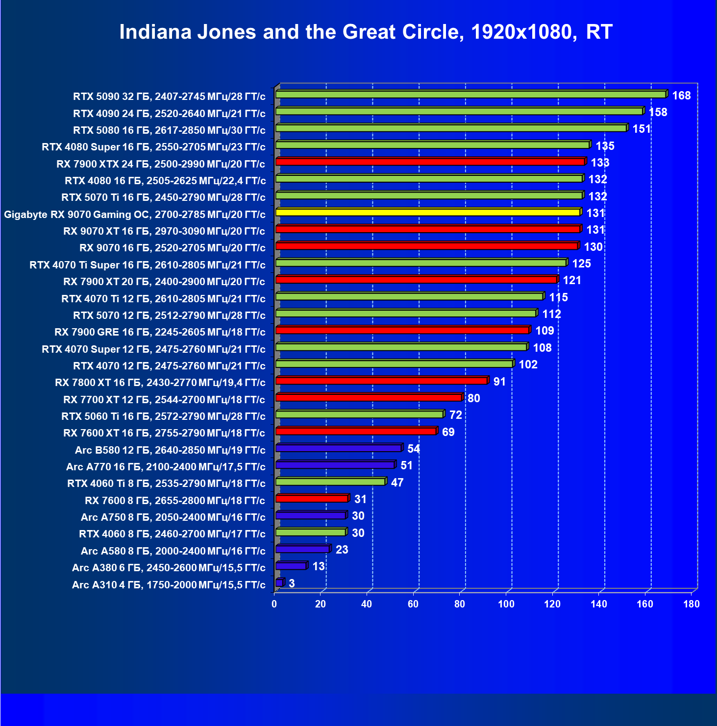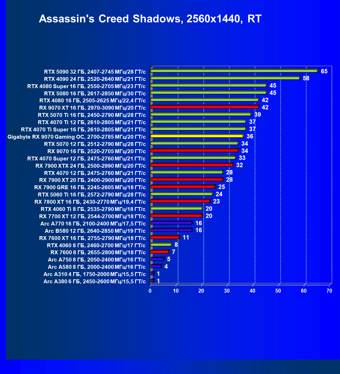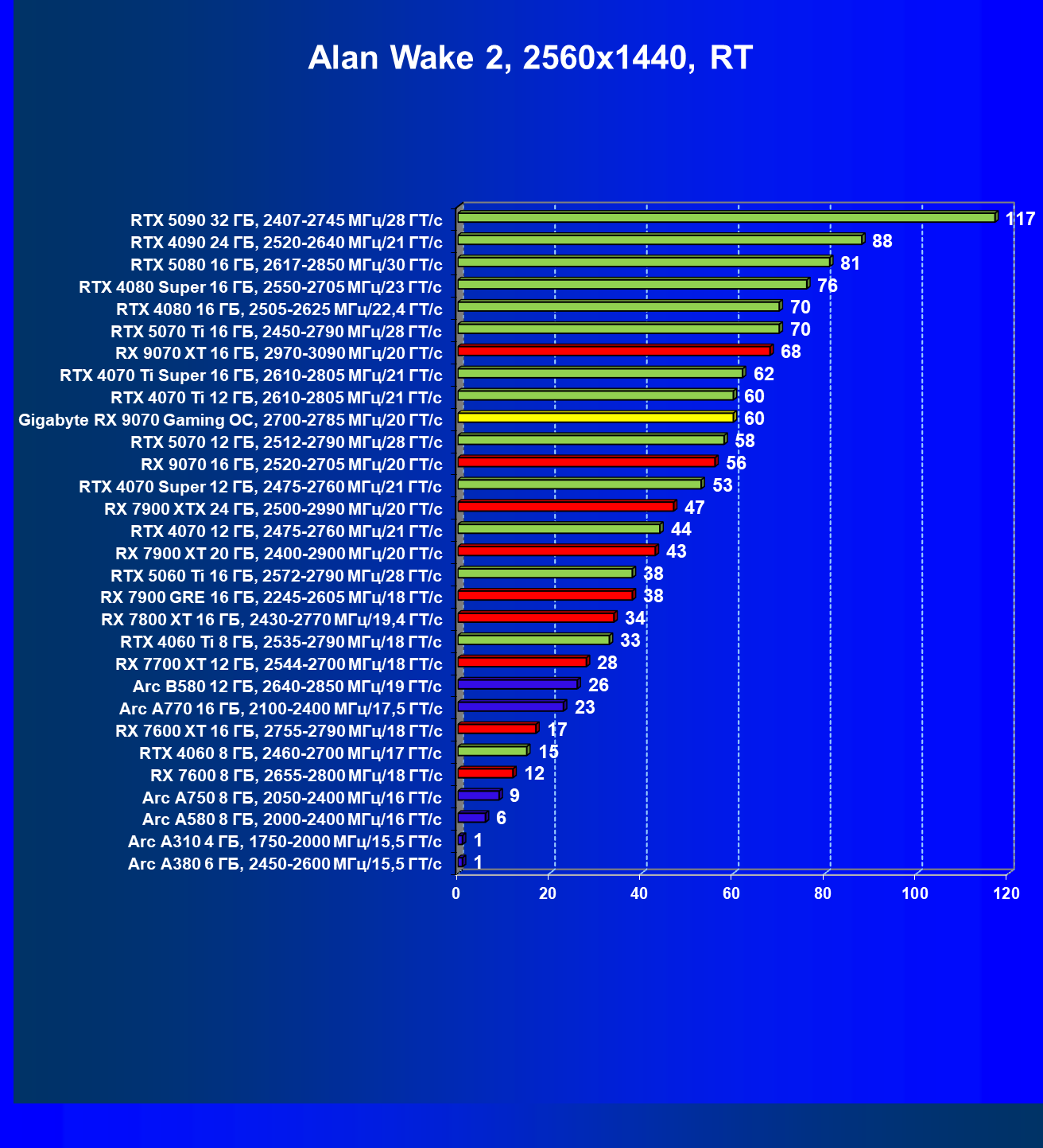| 09 | Gigabyte RX 9070 Gaming OC, 2700—2785 МГц/20 ГТ/с | 2142 | 261 | 82 000 |