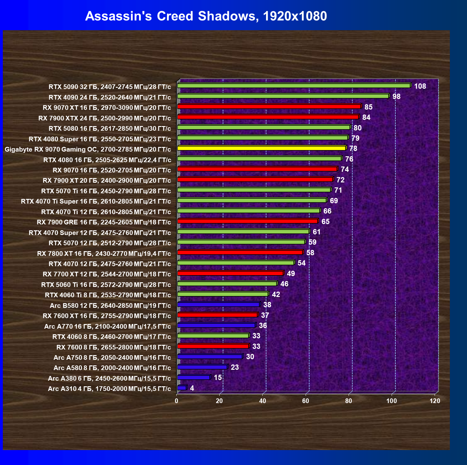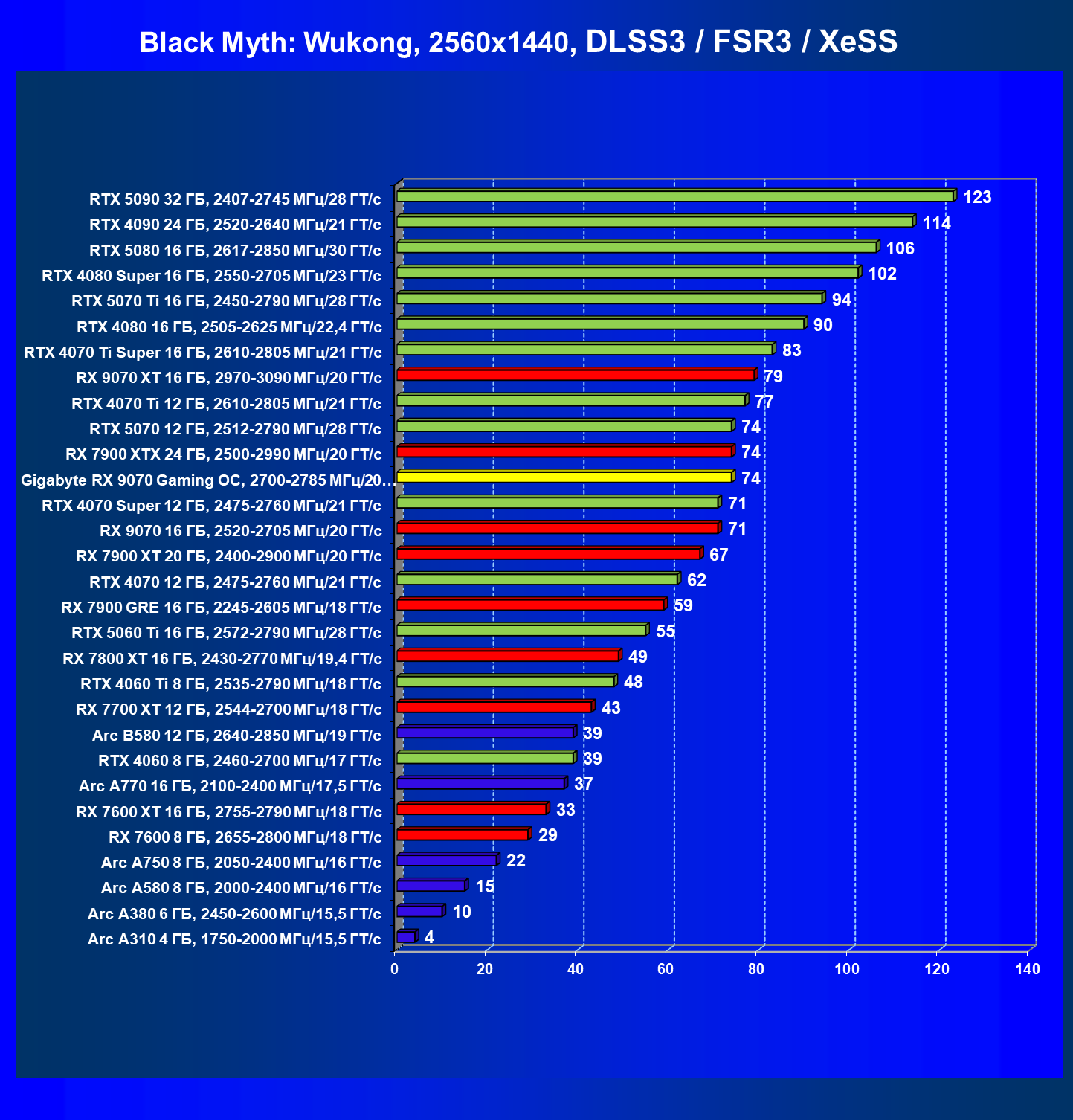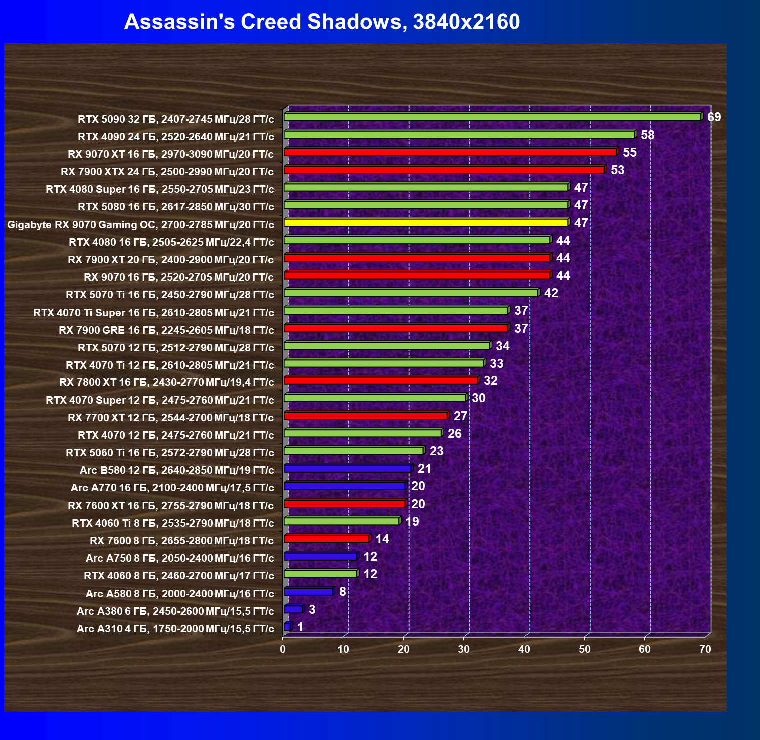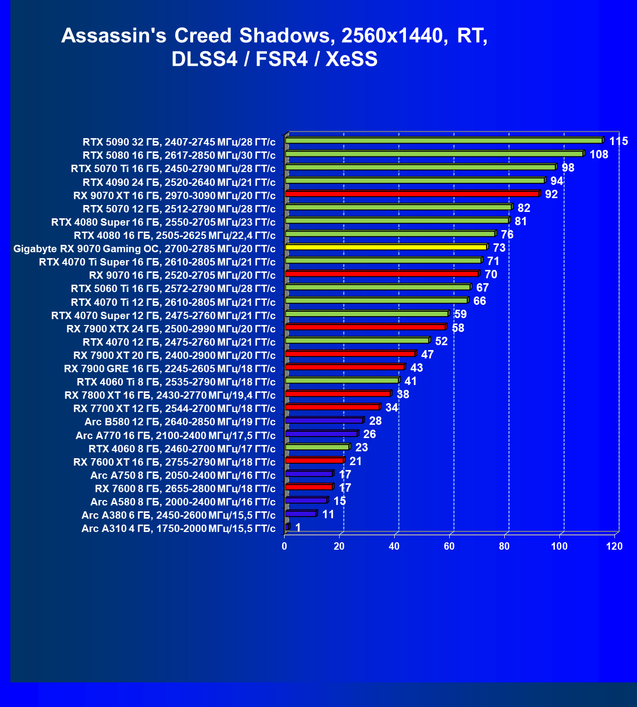 | 09 | Gigabyte RX 9070 Gaming OC, 2700—2785 МГц/20 ГТ/с | 2142 | 261 | 82 000 |