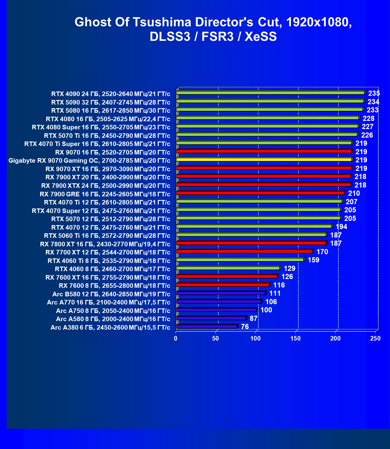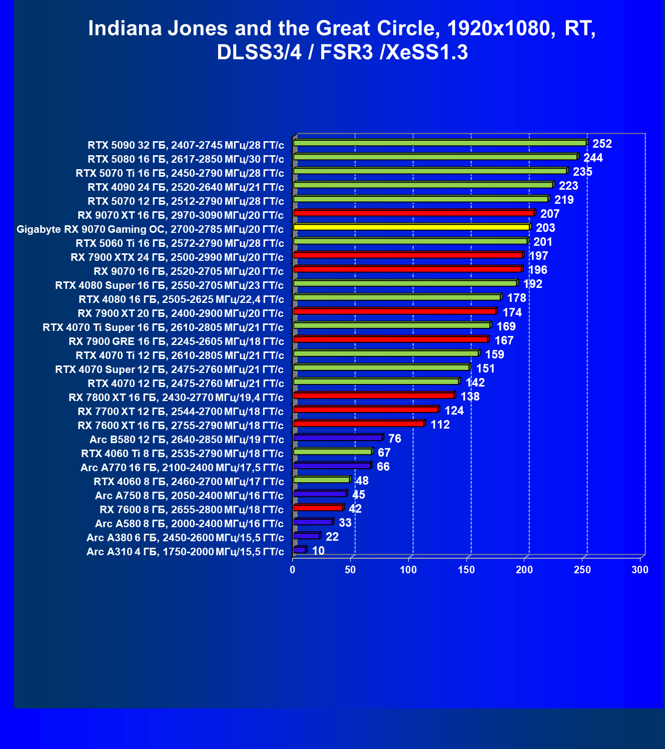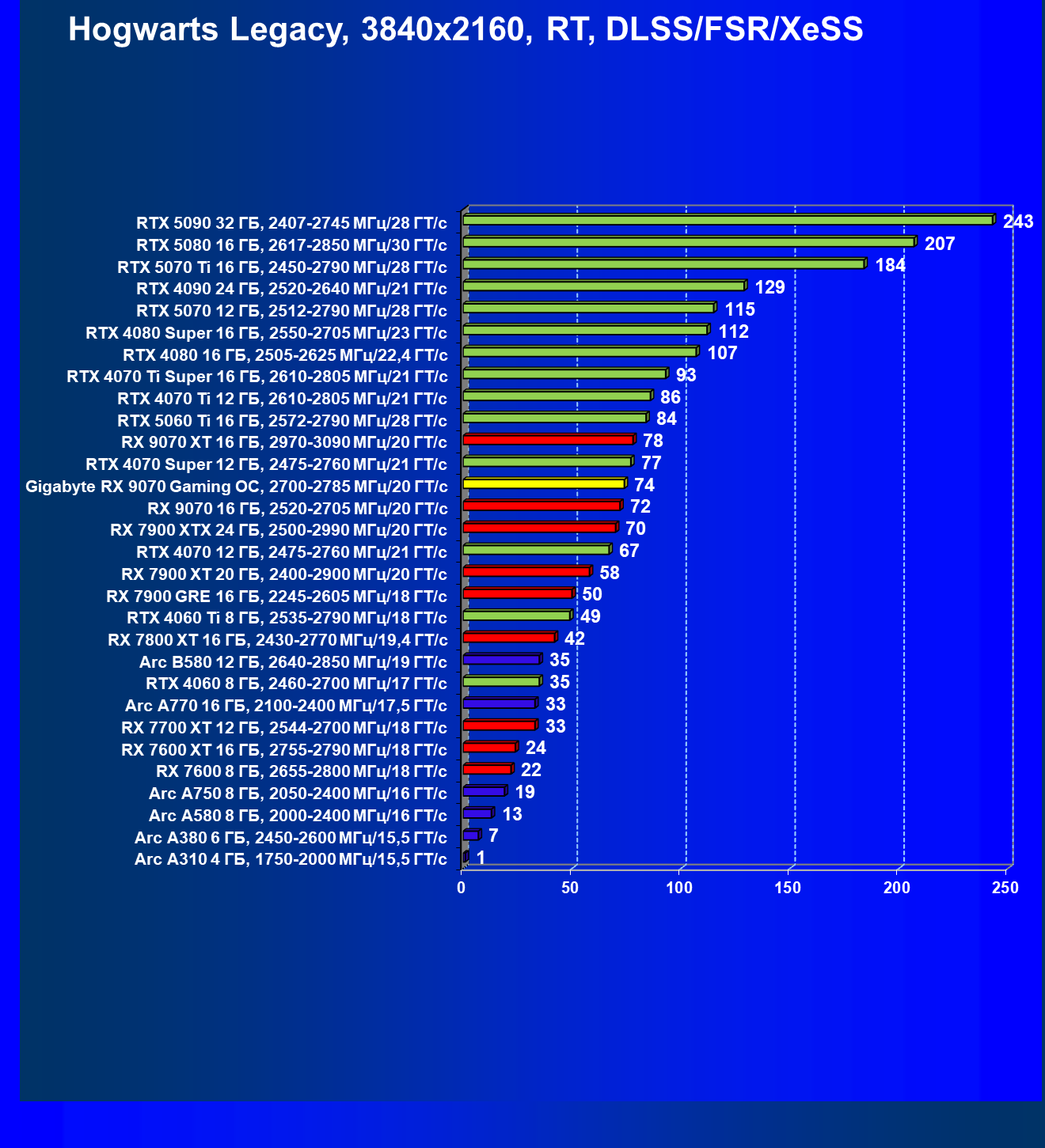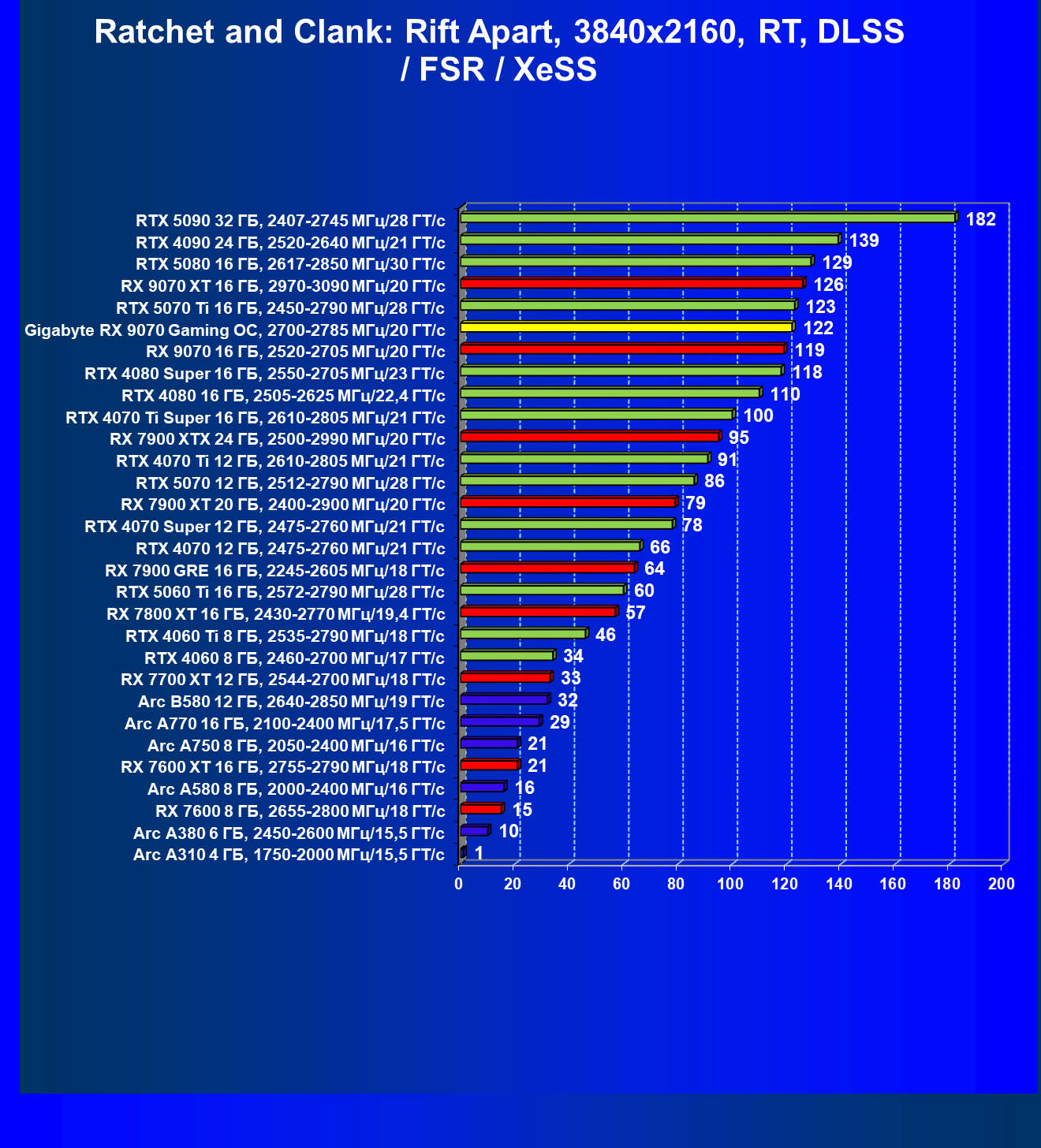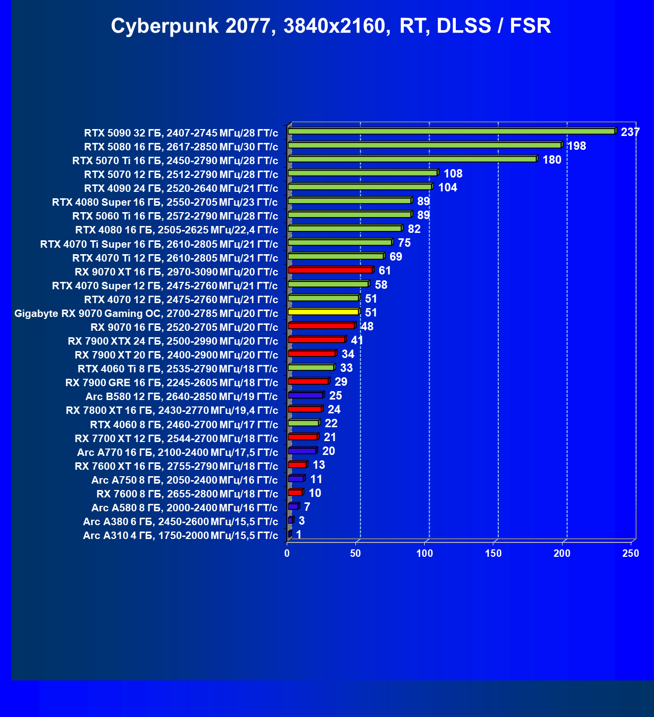 | 09 | RX 9070 16 ГБ, 2520—2705 МГц/20 ГТ/с | 249 | 2045 | 82 000 |