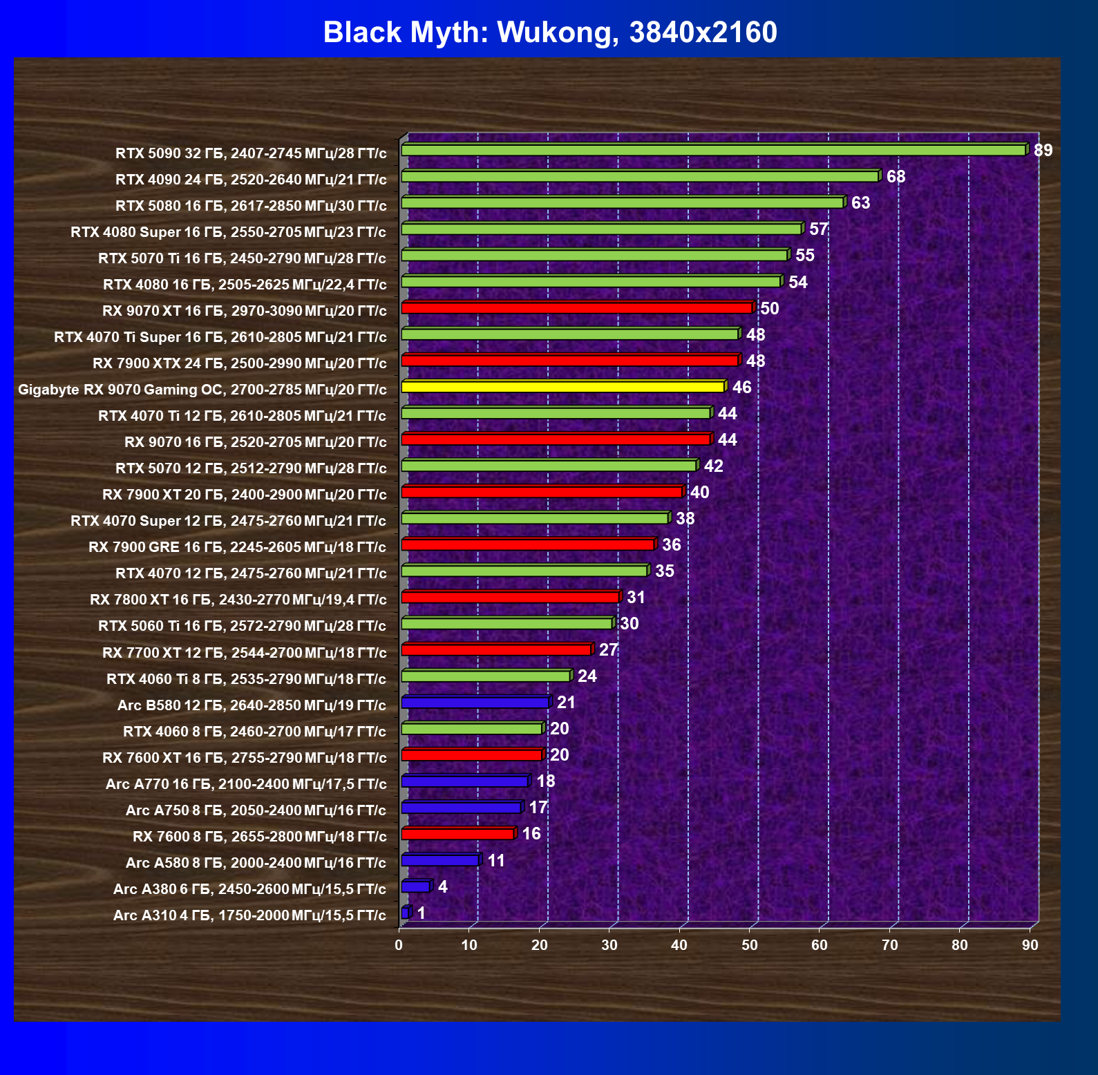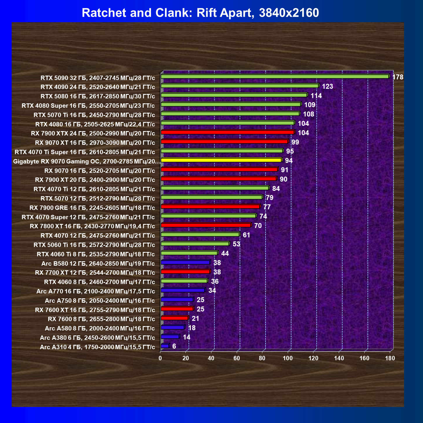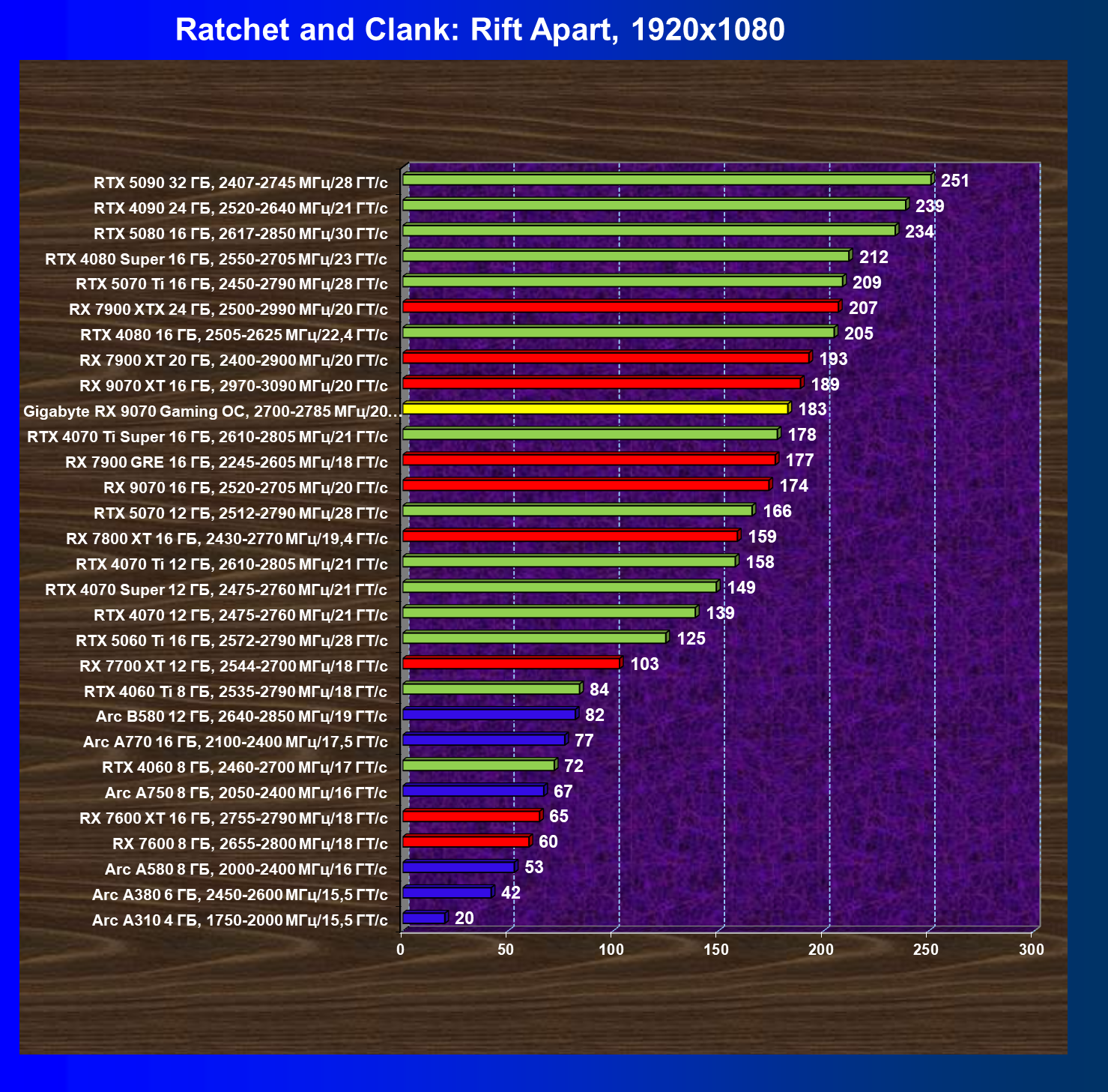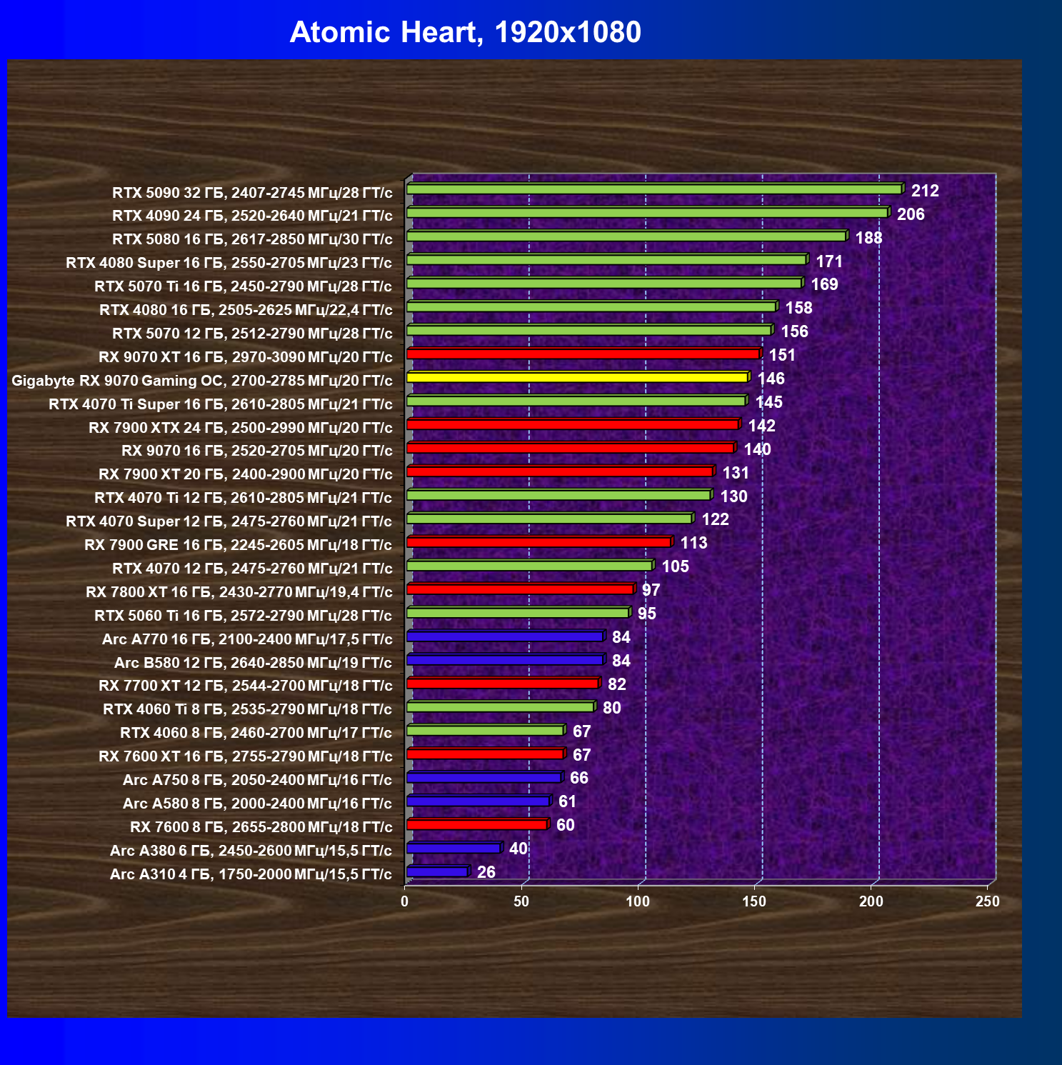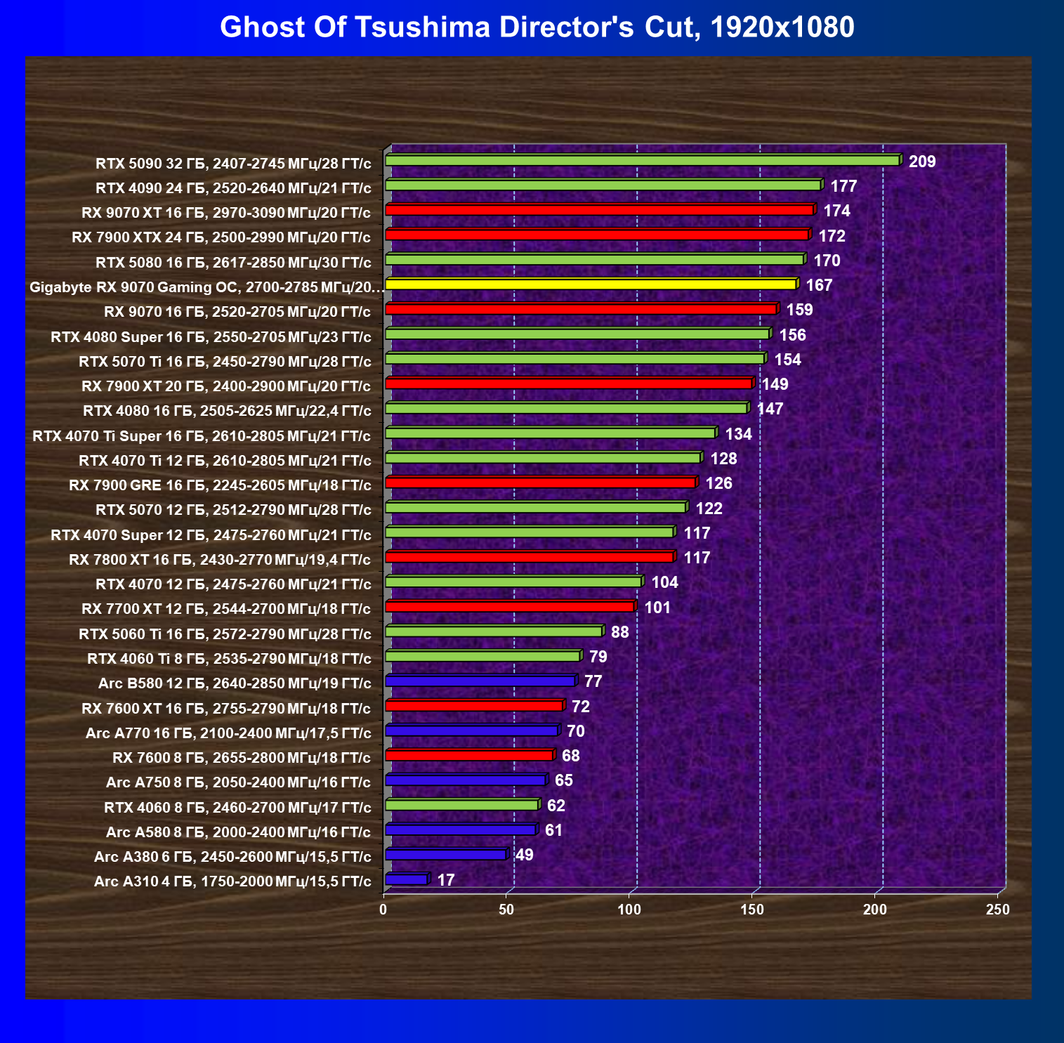 | 09 | RX 9070 16 ГБ, 2520—2705 МГц/20 ГТ/с | 249 | 2045 | 82 000 |