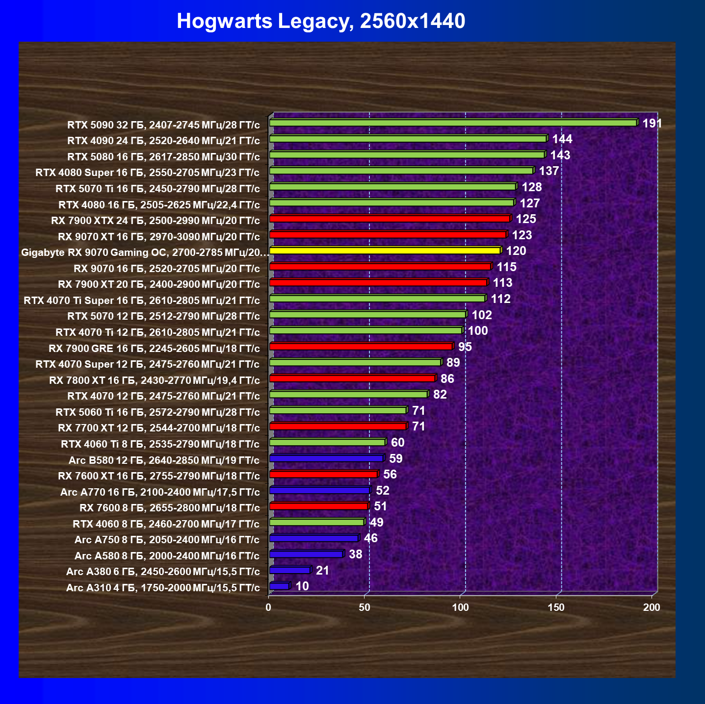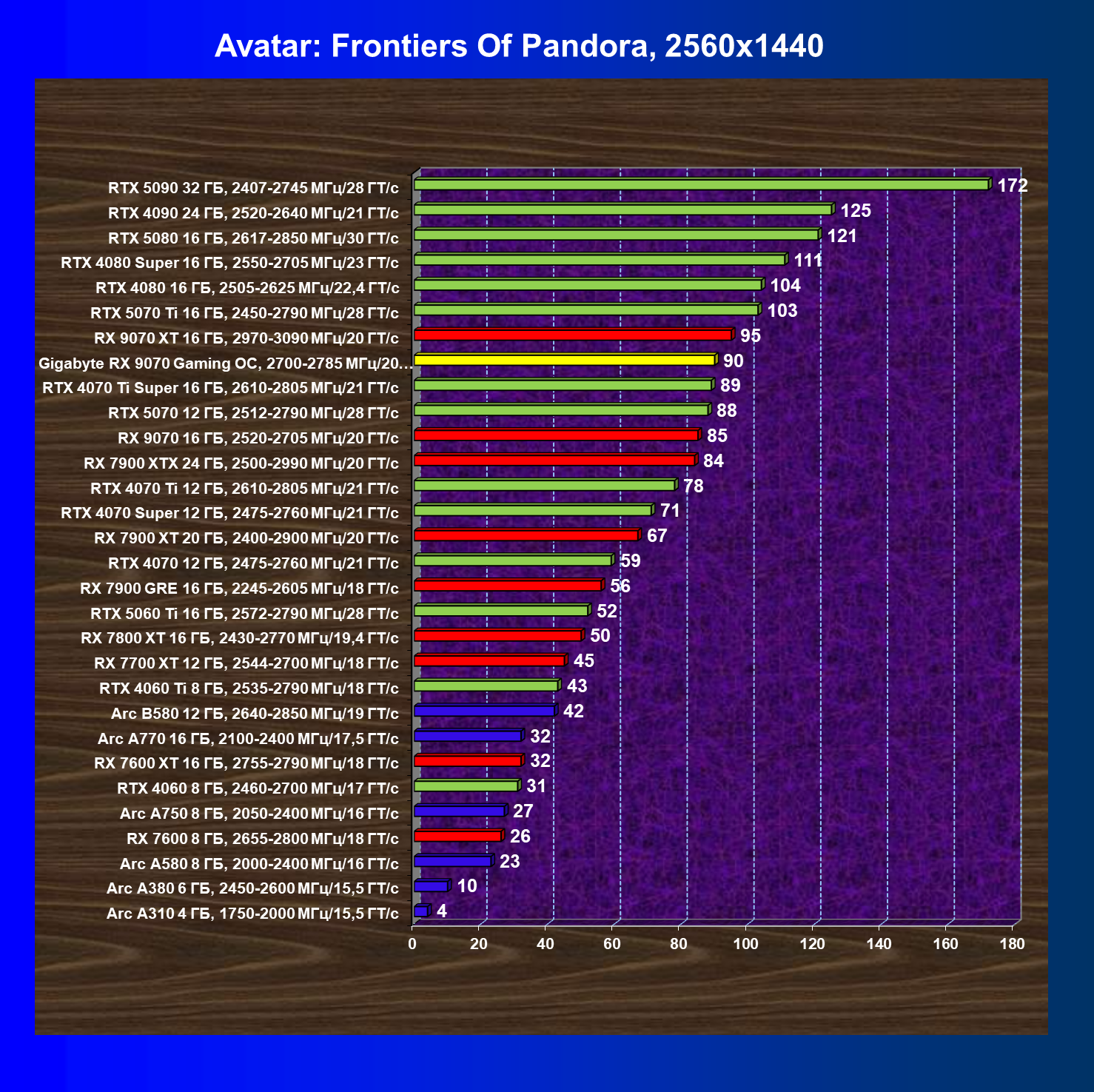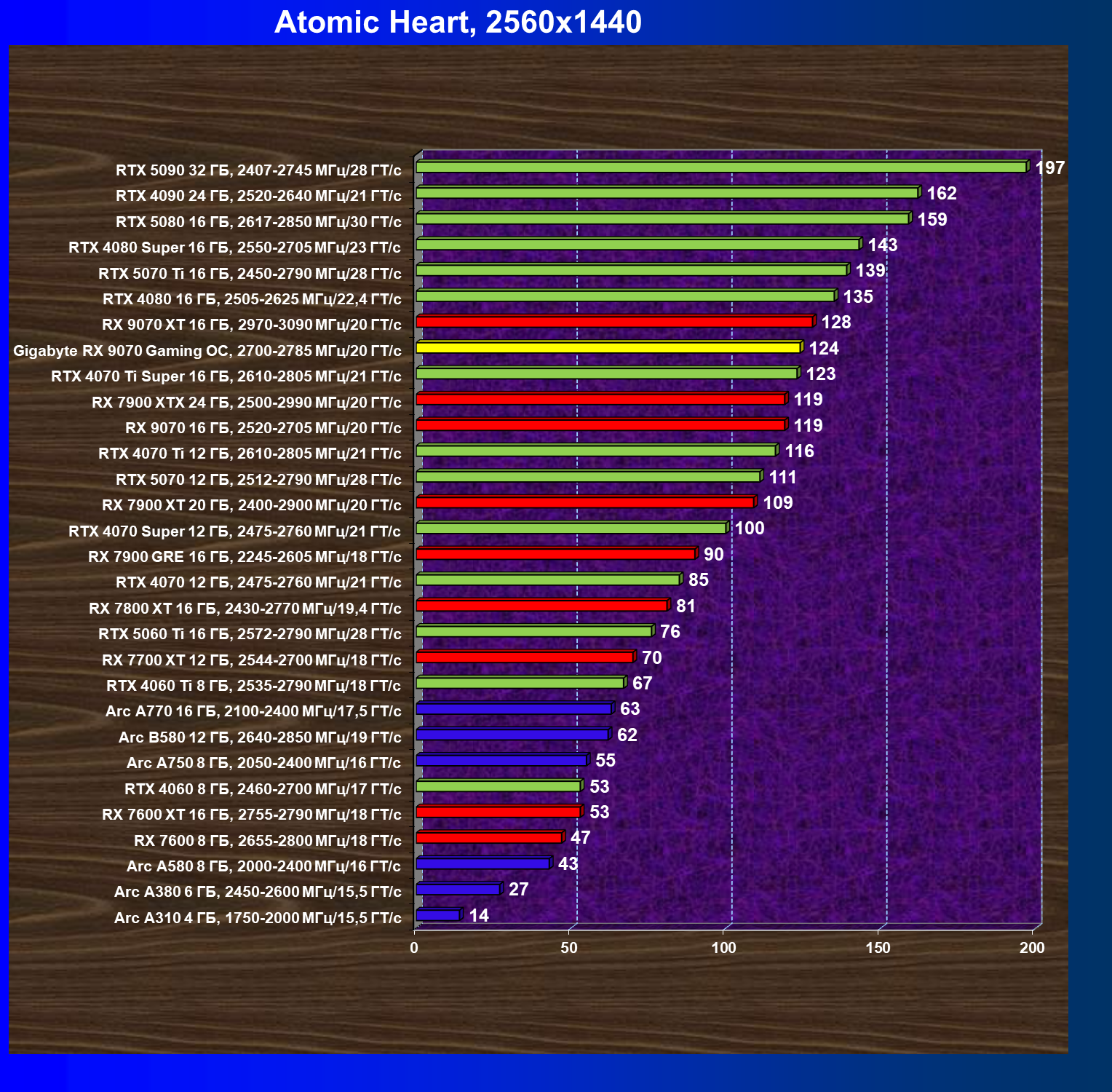 | 10 | RX 9070 16 ГБ, 2520—2705 МГц/20 ГТ/с | 2045 | 249 | 82 000 |