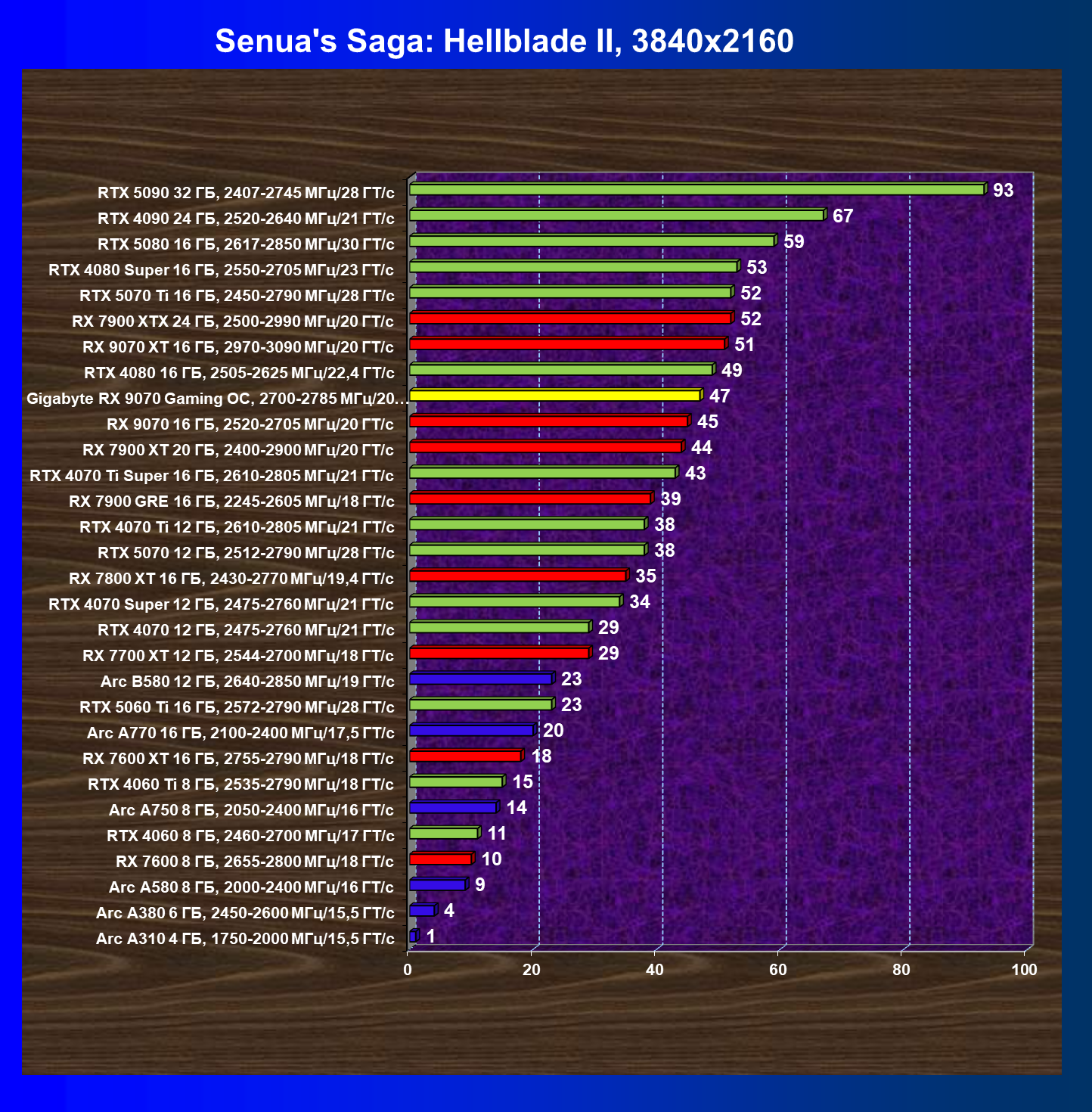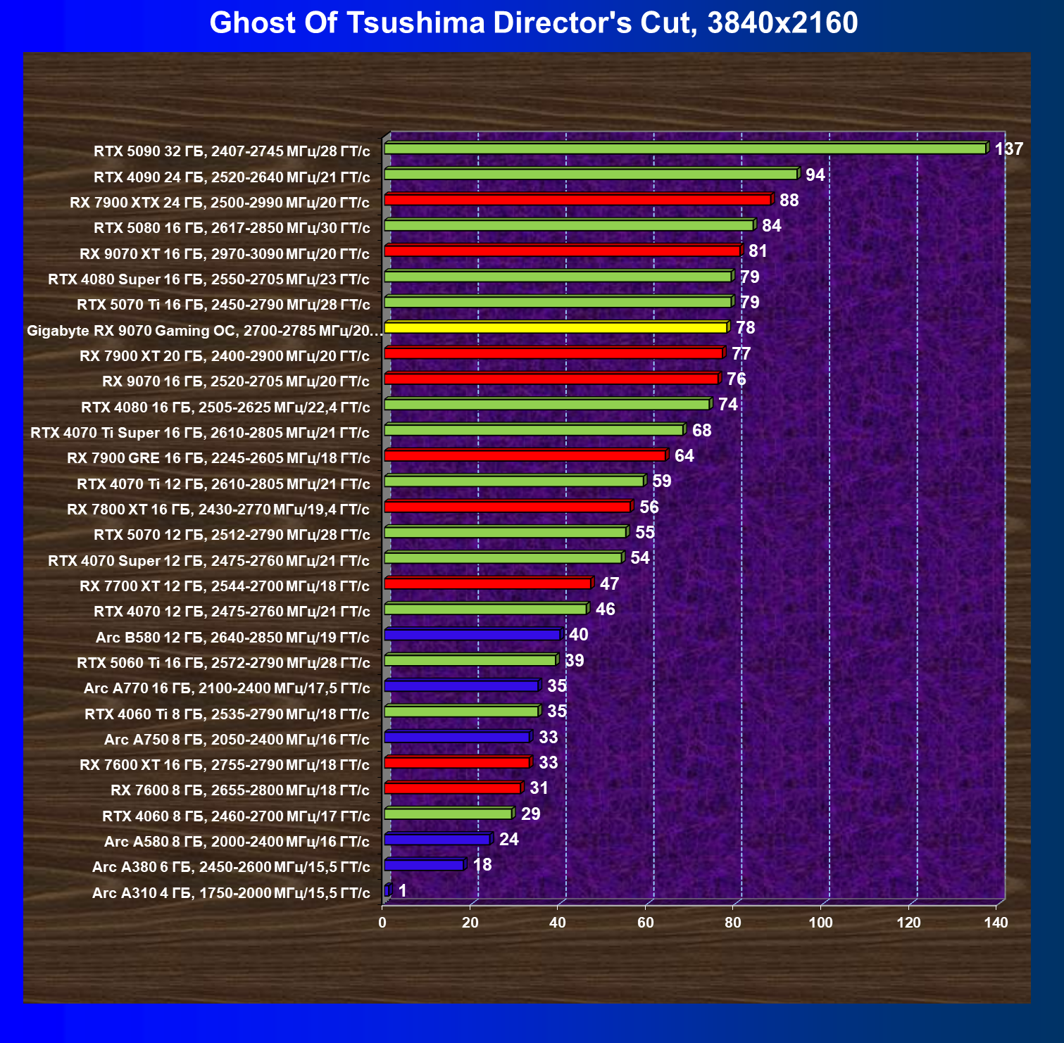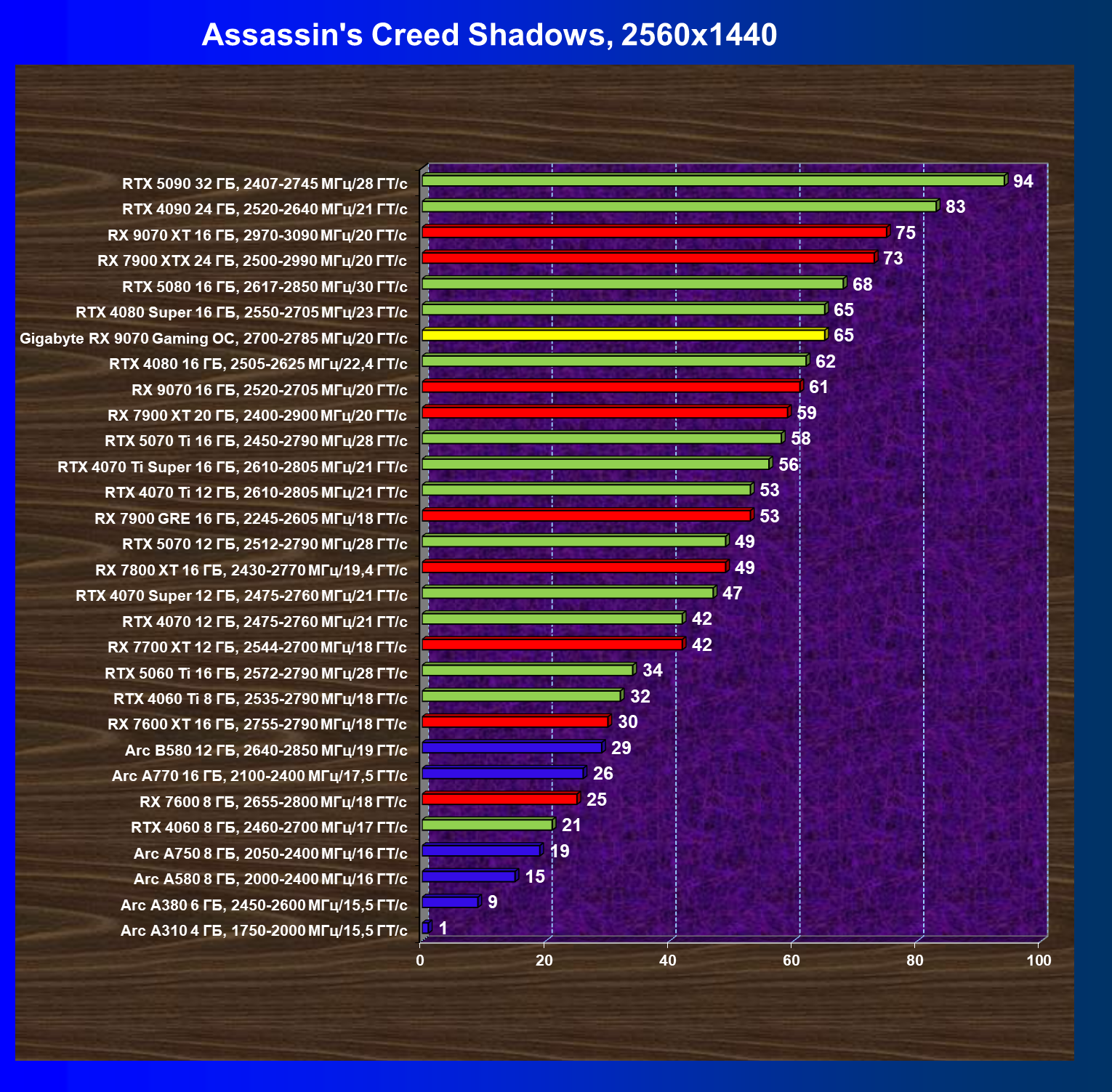 | 10 | RX 9070 16 ГБ, 2520—2705 МГц/20 ГТ/с | 2045 | 249 | 82 000 |