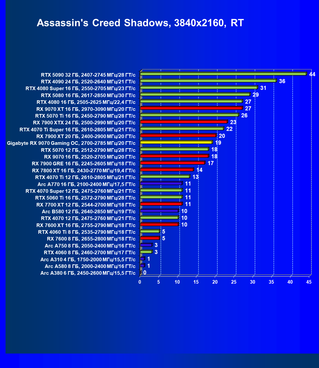 | 12 | RX 9070 16 ГБ, 2520—2705 МГц/20 ГТ/с | 3593 | 438 | 82 000 |