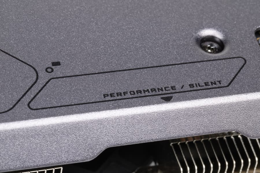 Карта имеет два режима работы, они заложены в двух вариантах BIOS, которые переключаются с помощью переключателя на переднем торце карты: P (performance / производительный) и S (silent / тихий). Разница между режимами заключается, по сути, только в оборотах вентиляторов, предел энергопотребления в обоих случаях составляет 250 Вт.