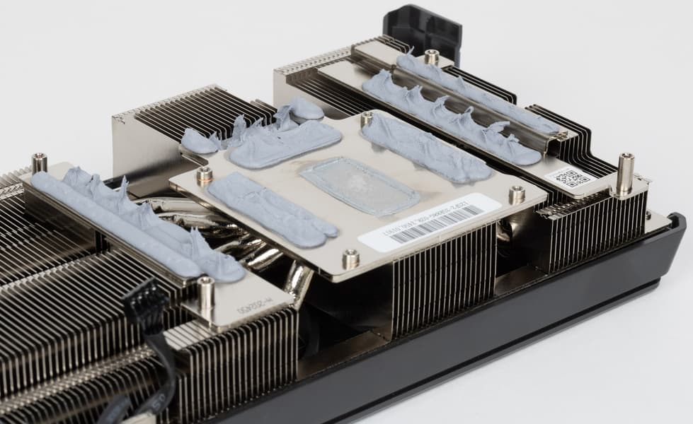 В качестве термоинтерфейса для охлаждения микросхем памяти и преобразователей питания VRM используются так называемые жидкие термопрокладки (термогель). Это, по сути, одноразовый интерфейс, его можно использовать вторично, но потребуется ювелирная работа по формированию требуемых поверхностей для равномерного распределения.