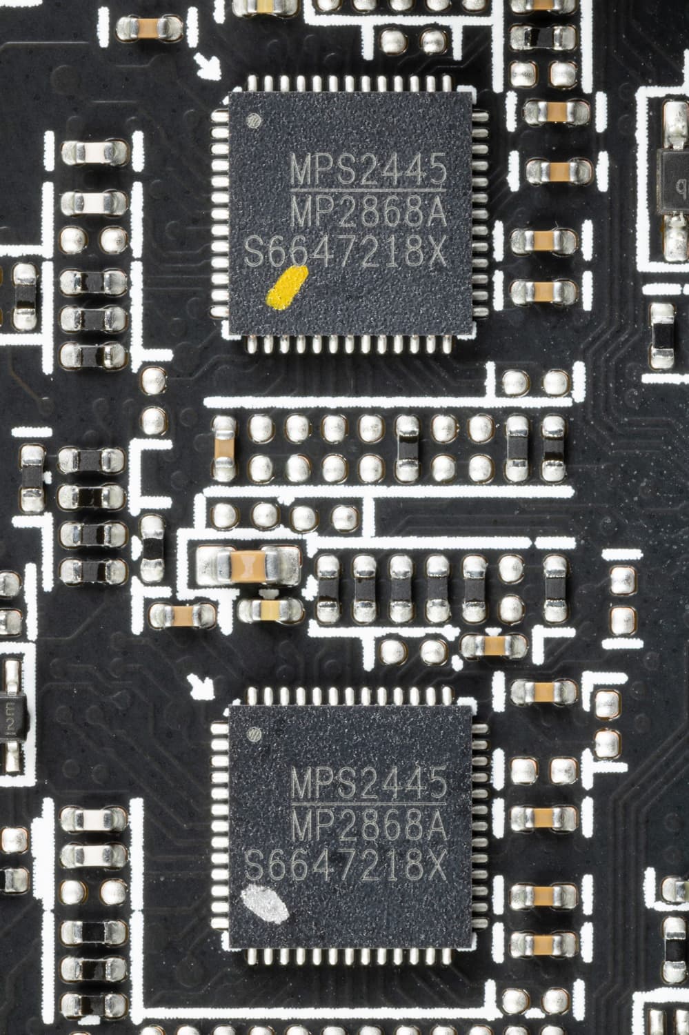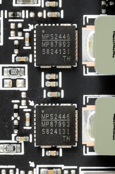У карты имеется два ШИМ-контроллера Monolithic Power Systems MP2868, они работают в паре и управляют обеими схемами питания.