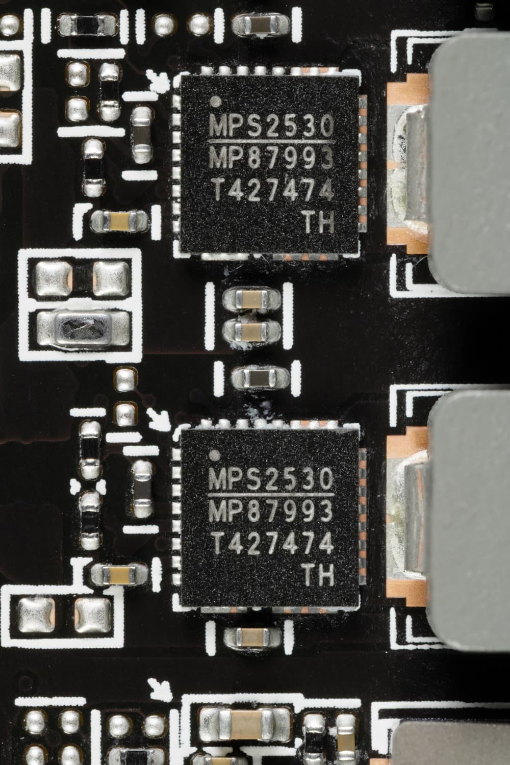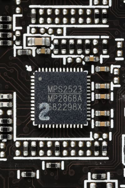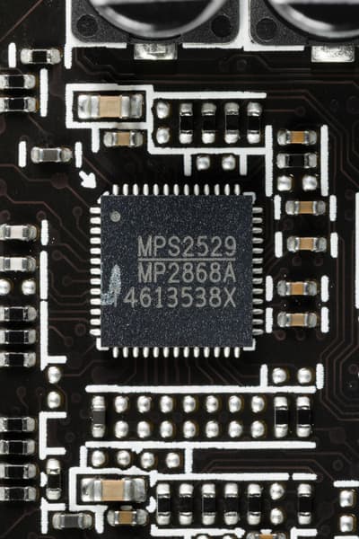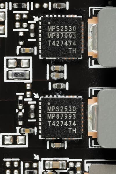 У карты имеется два ШИМ-контроллера Monolithic Power Systems MP2868, они работают в паре и управляют обеими схемами питания.