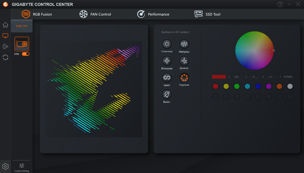 Управление режимами подсветки, в том числе и ее отключением, осуществляется той же утилитой Gigabyte Control Center. Синхронизация работы подсветки возможна только с материнскими платами Gigabyte и только через Control Center.