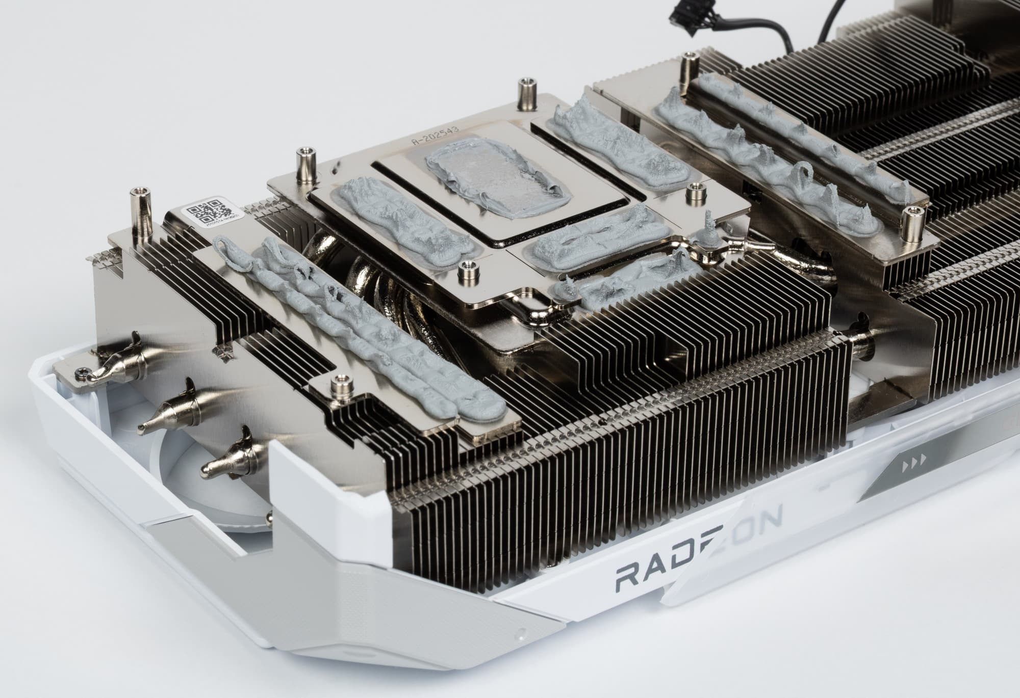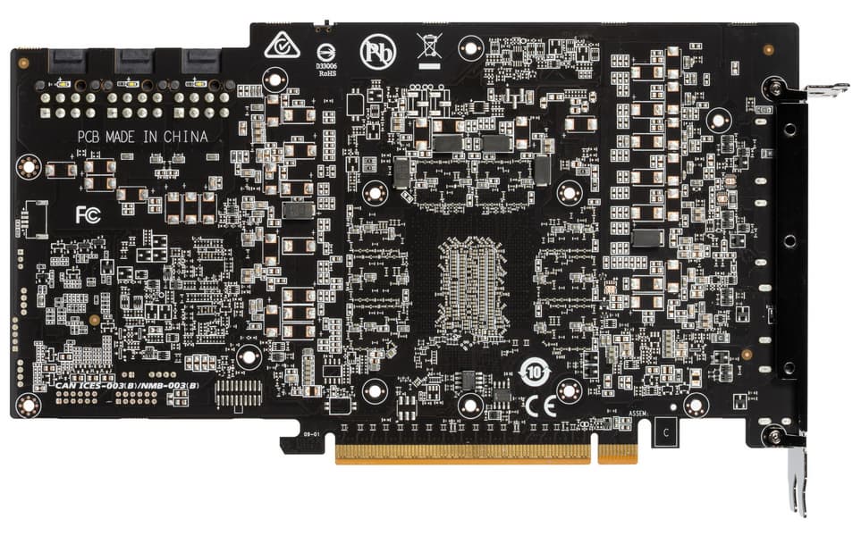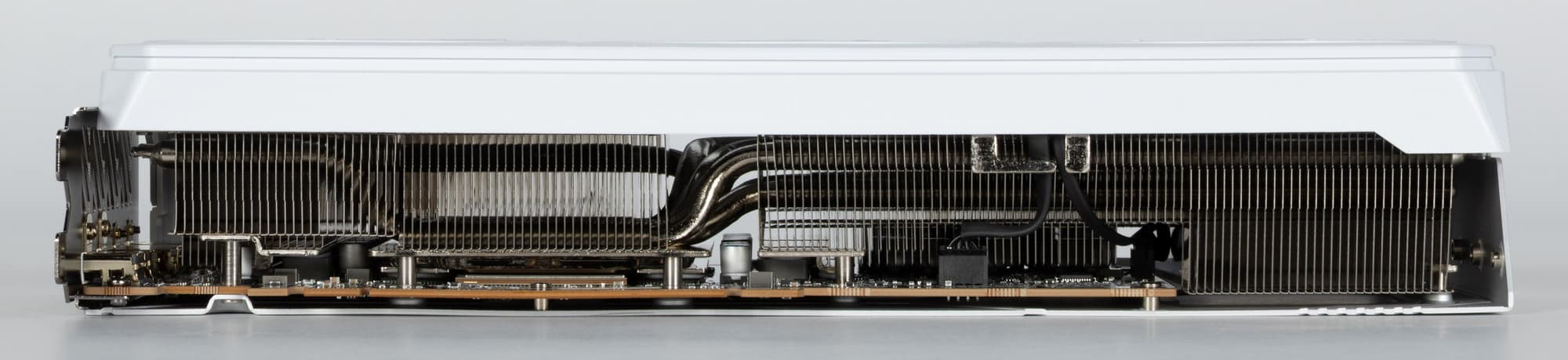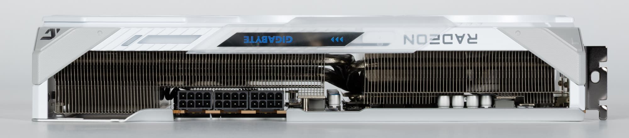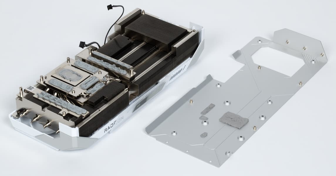 8 трубок припаяны к большой испарительной камере, которая напрямую охлаждает ядро, а через дополнительную пластину и микросхемы памяти. Для охлаждения преобразователей питания VRM имеются свои подошвы на радиаторе. Задняя пластина не только служит элементом защиты PCB, но и участвует в охлаждении тыльной стороны PCB через термопрокладки.