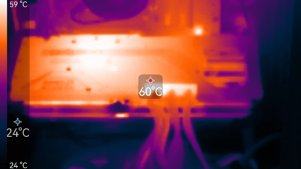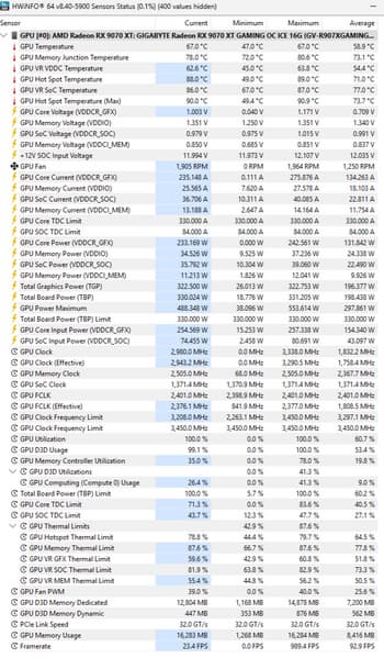 После прогона под нагрузкой максимальная температура ядра не превысила 67 градусов (hot spot — 89 °C; допускается нагрев до 110 градусов), а микросхем памяти — 80 °C, что является хорошим результатом. Энергопотребление карты доходило до 331 Вт.