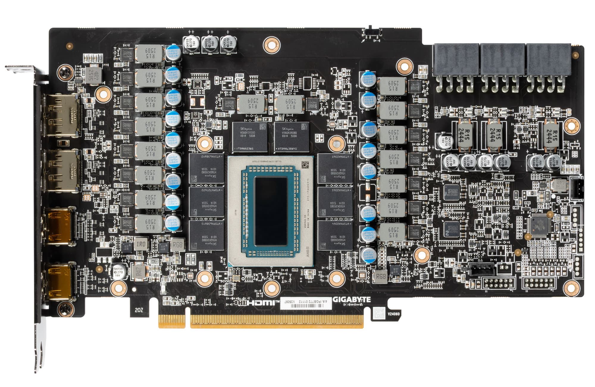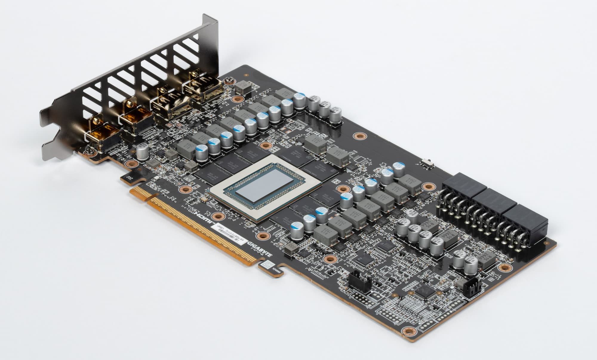Питание на карту Gigabyte подается через три 8-контактных разъема питания стандарта PCIe 2.0.