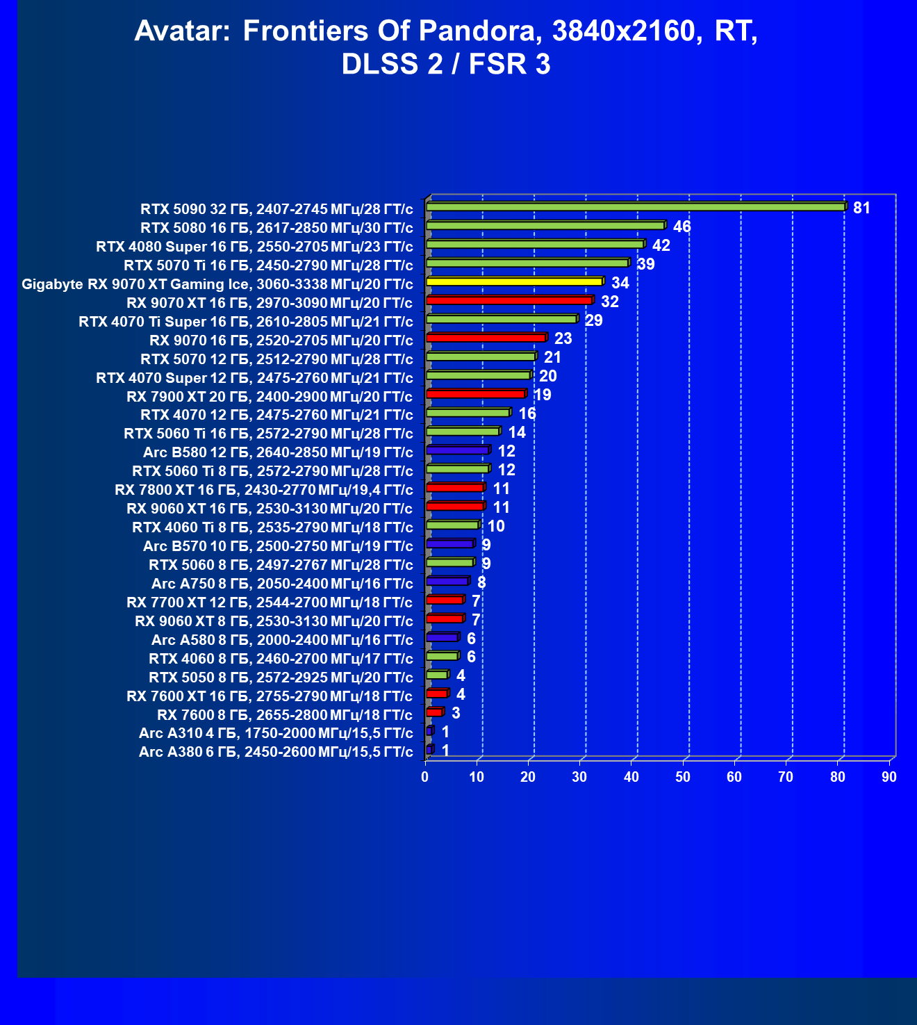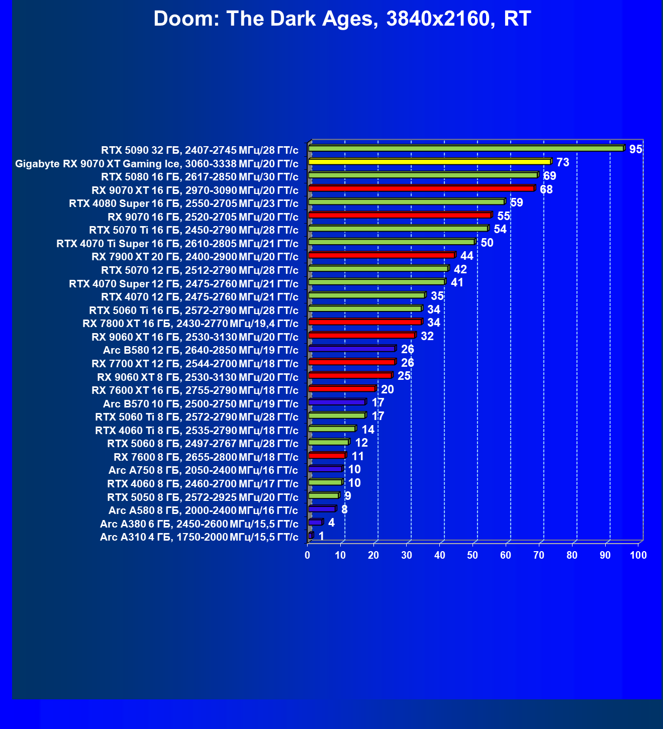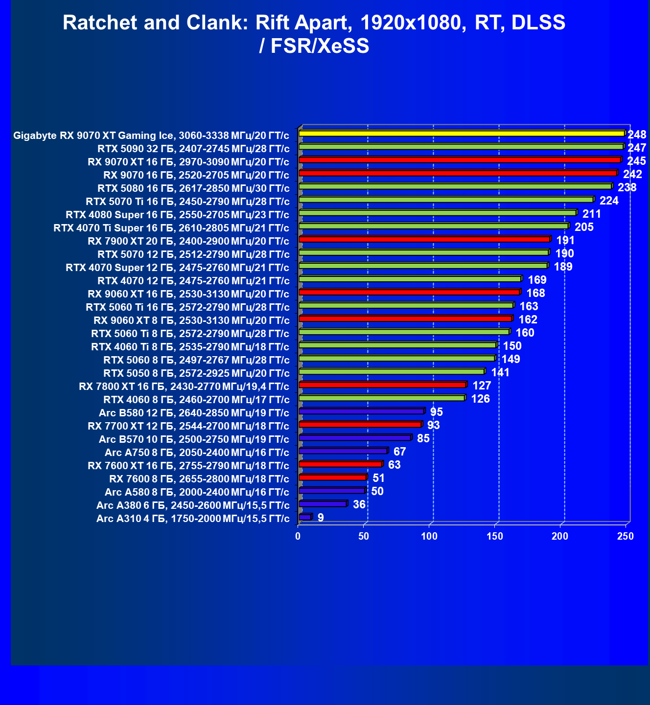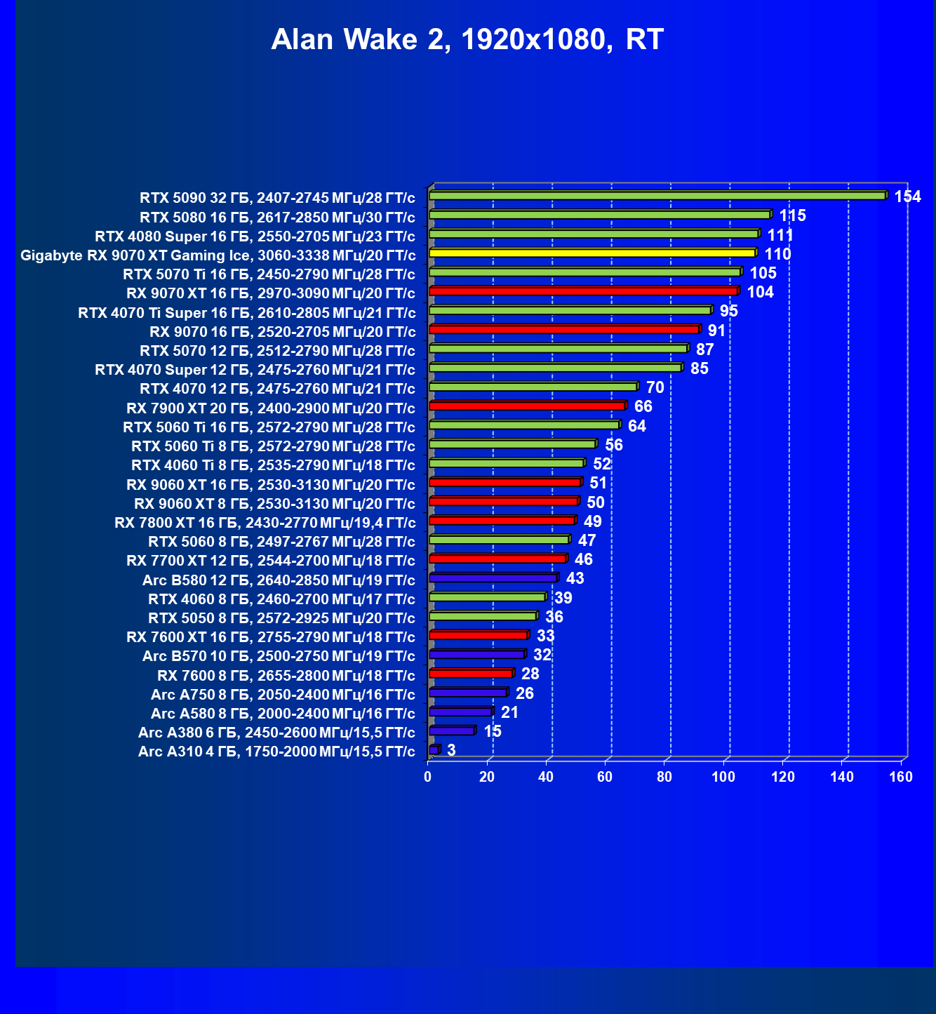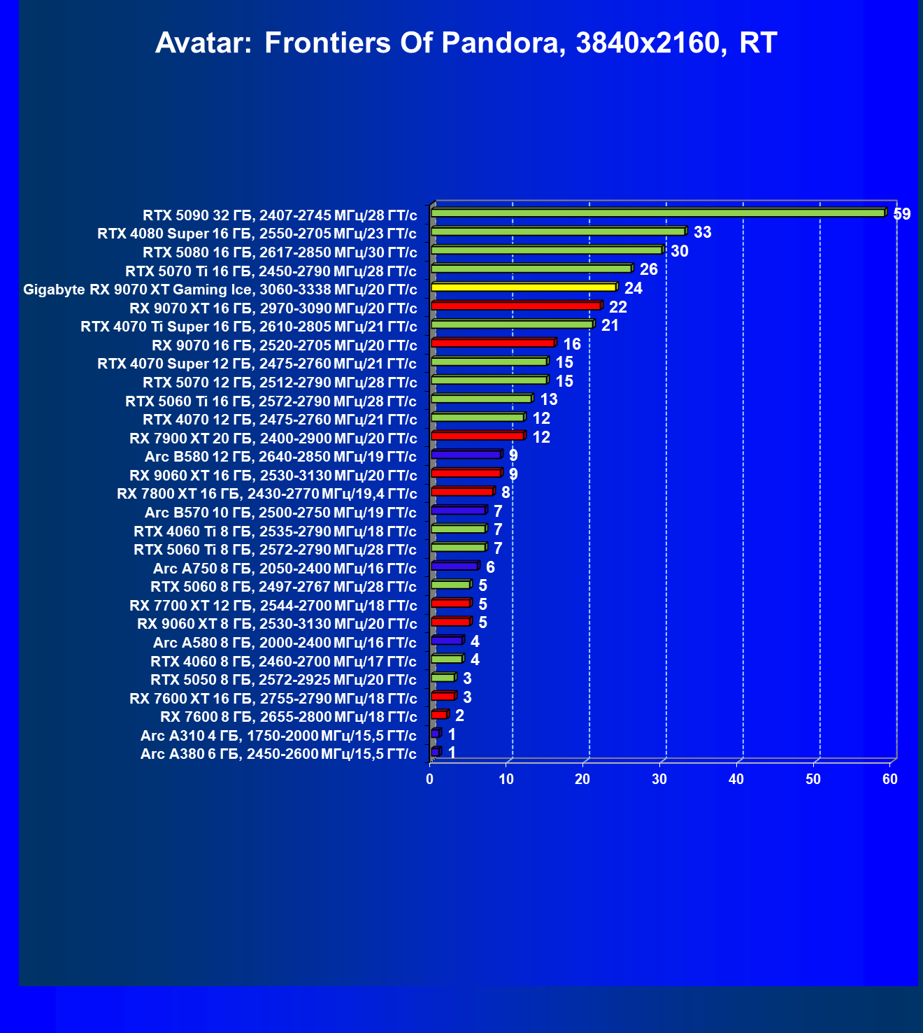 | 08 | Gigabyte RX 9070 XT Gaming Ice, 3060—3338 МГц/20 ГТ/с | 627 | 5333 | 85 000 |