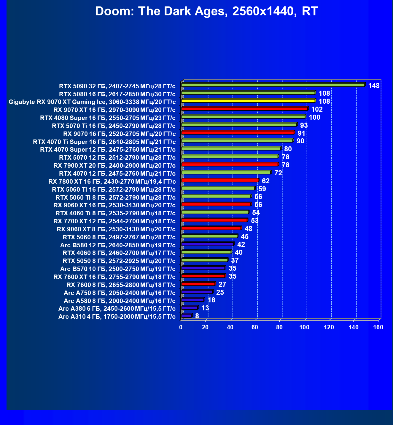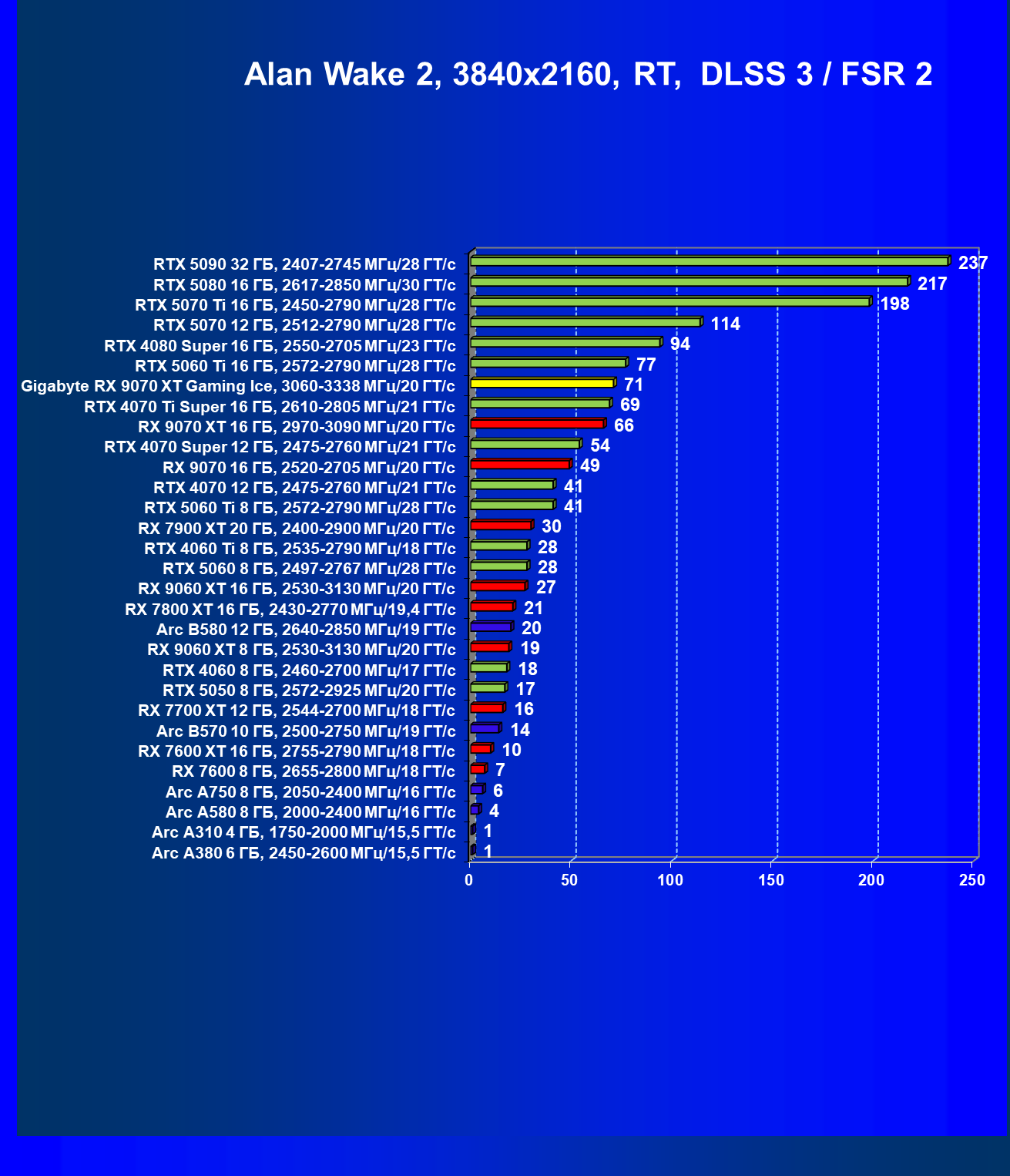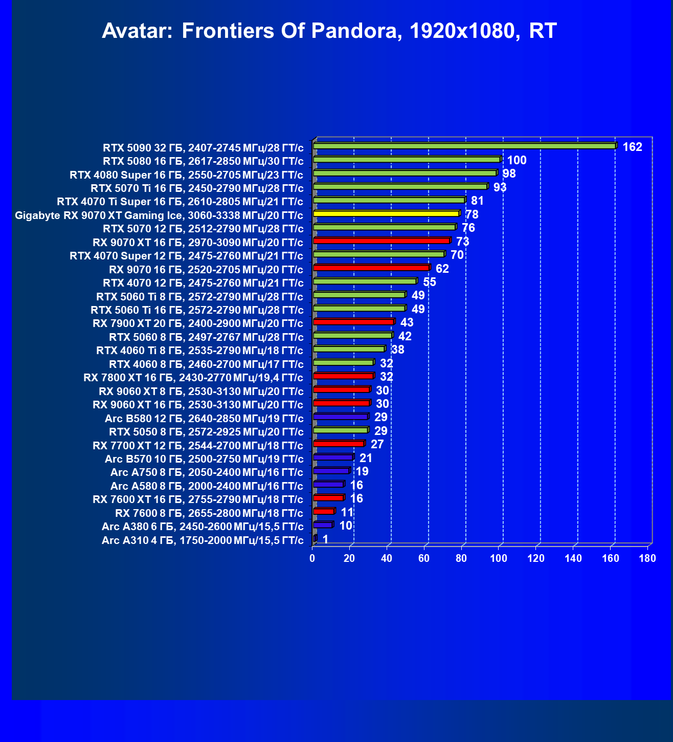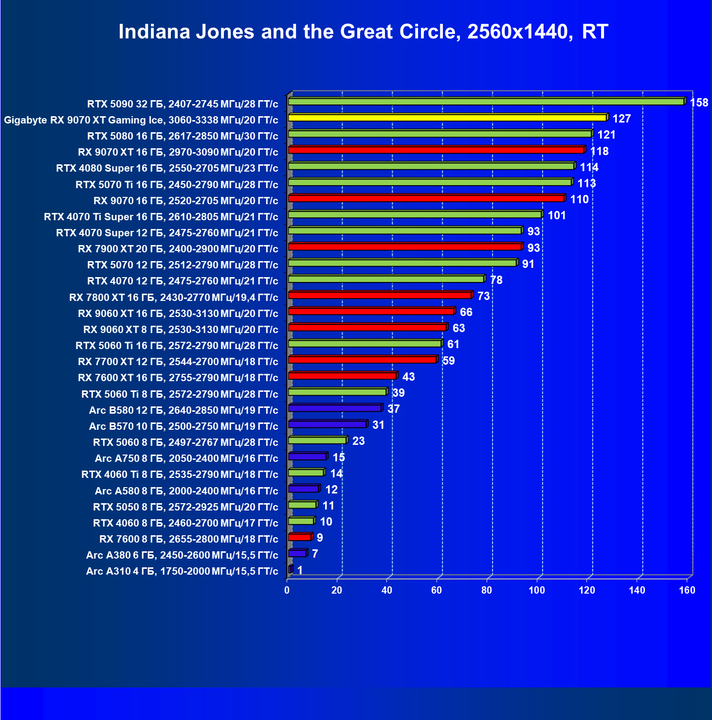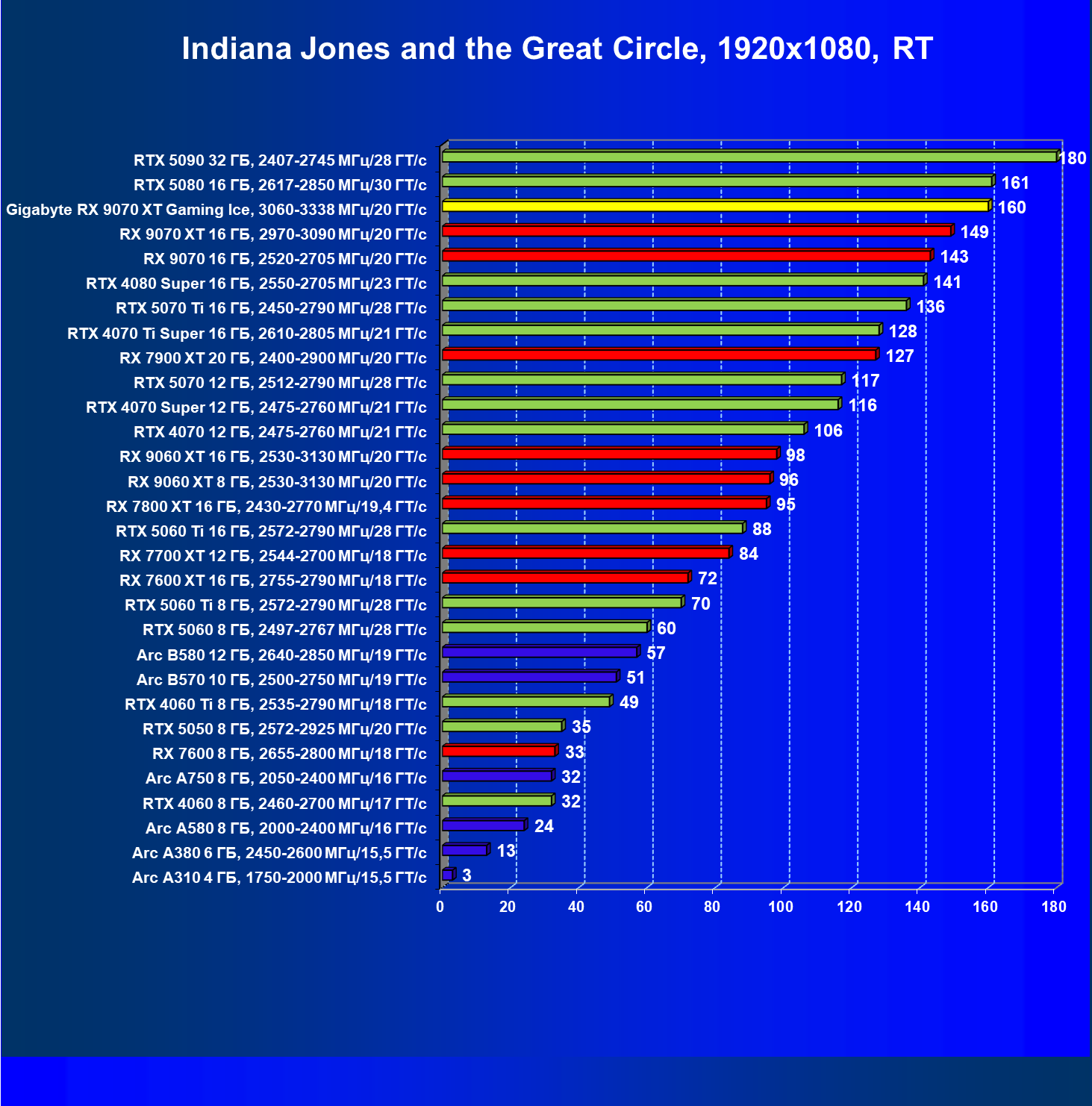 | 08 | Gigabyte RX 9070 XT Gaming Ice, 3060—3338 МГц/20 ГТ/с | 627 | 5333 | 85 000 |