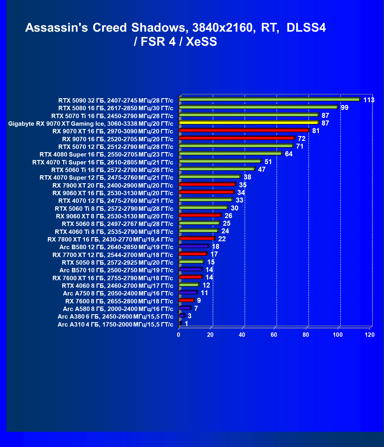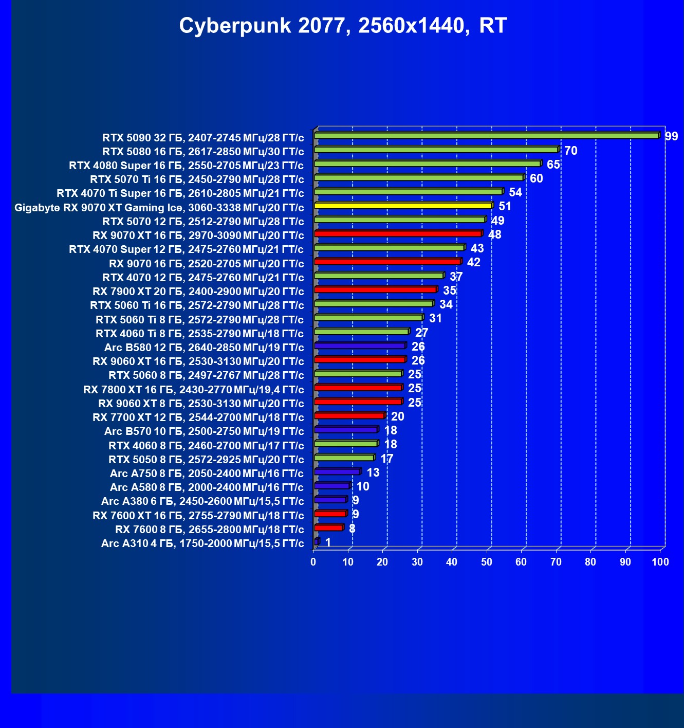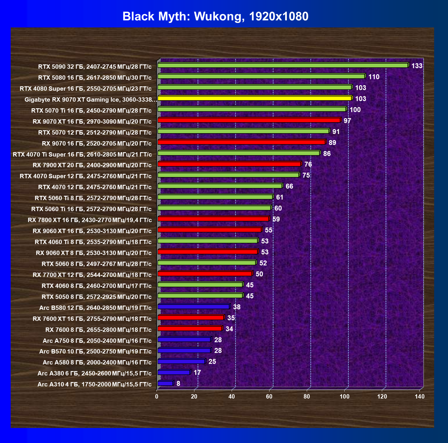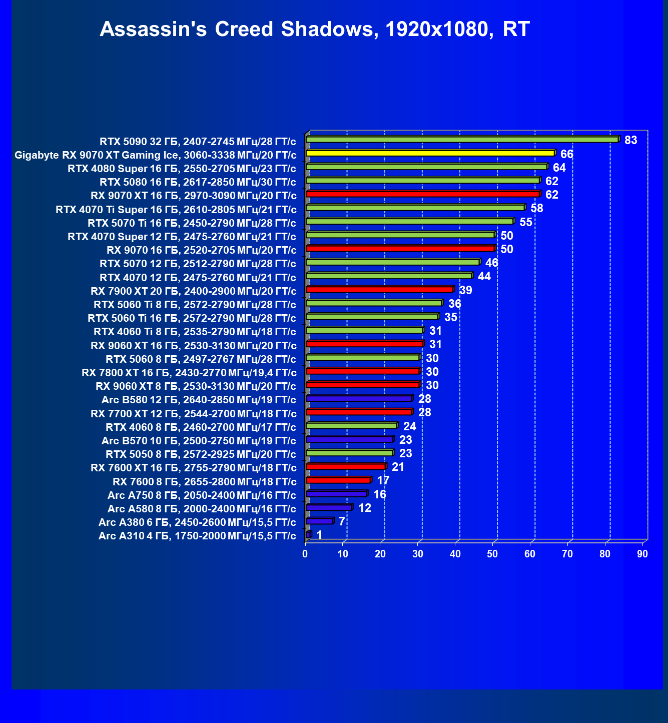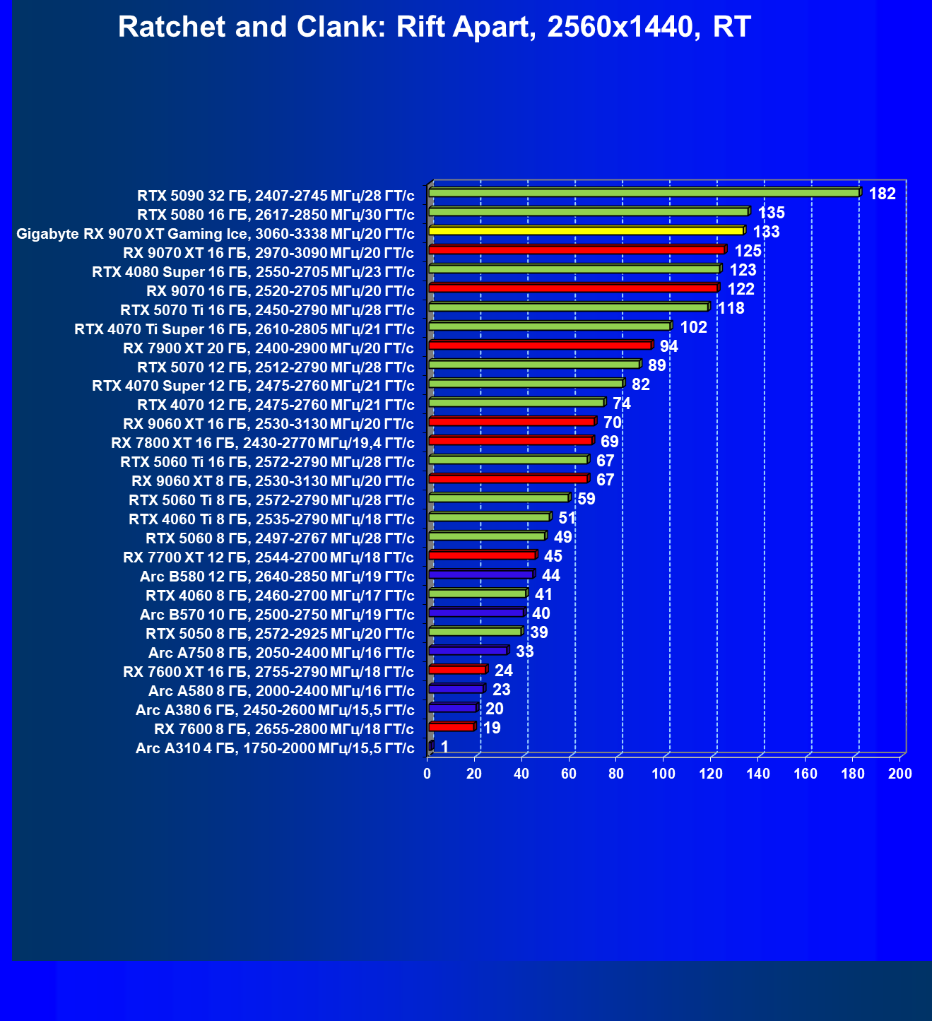 | 08 | Gigabyte RX 9070 XT Gaming Ice, 3060—3338 МГц/20 ГТ/с | 627 | 5333 | 85 000 |