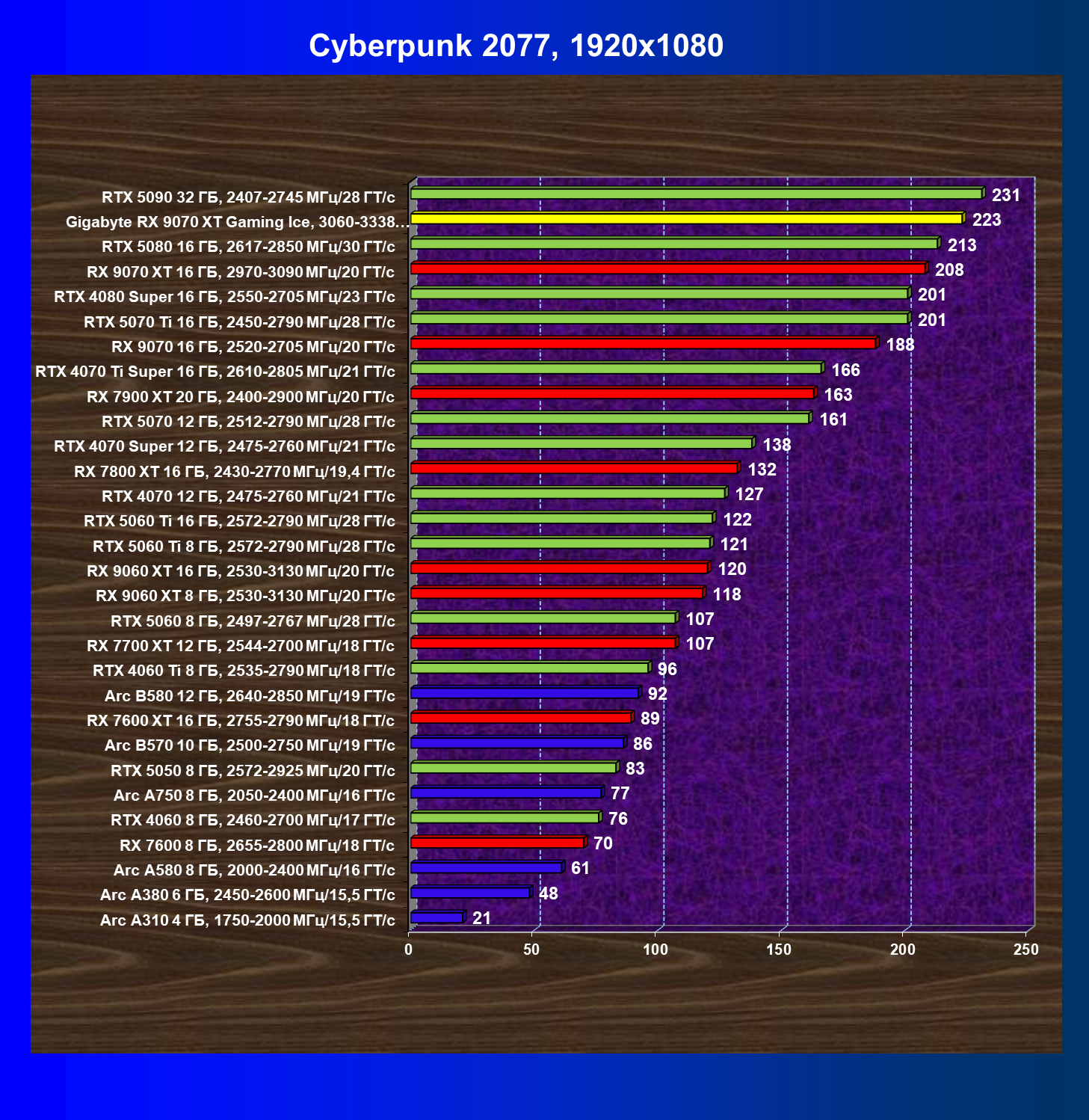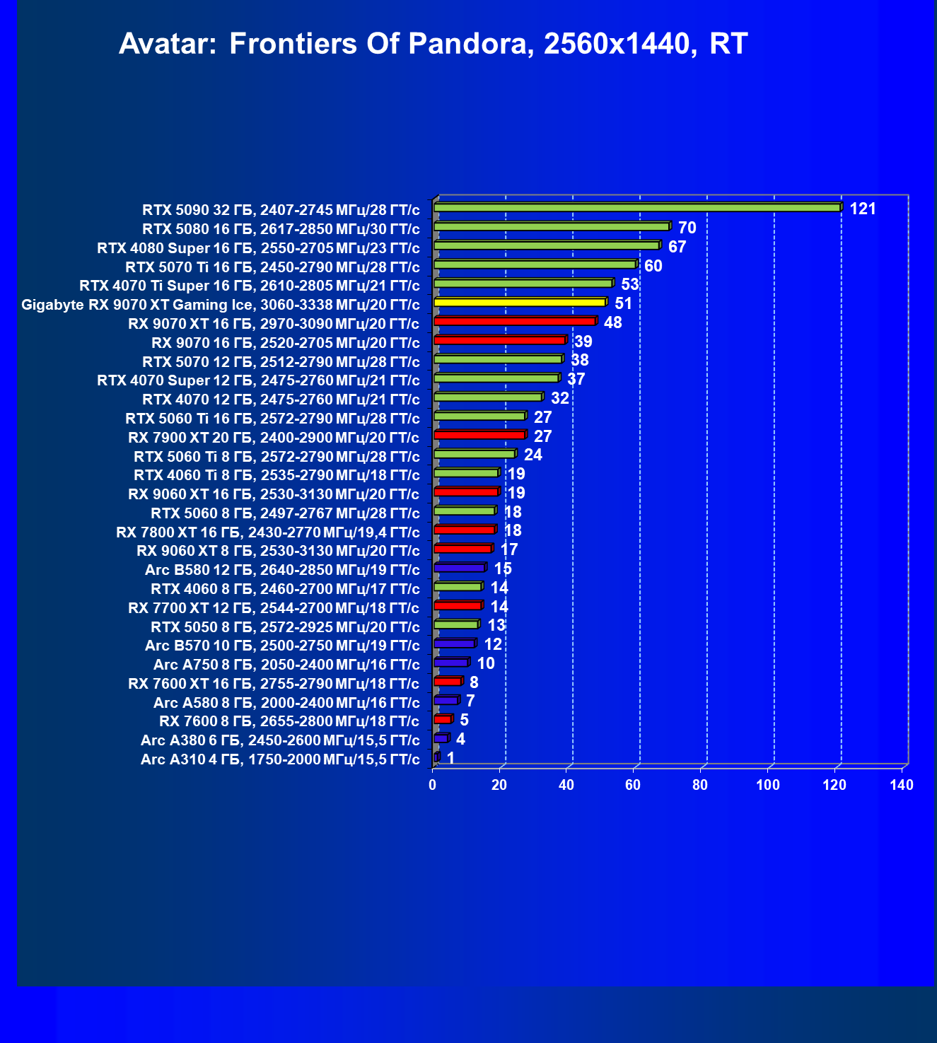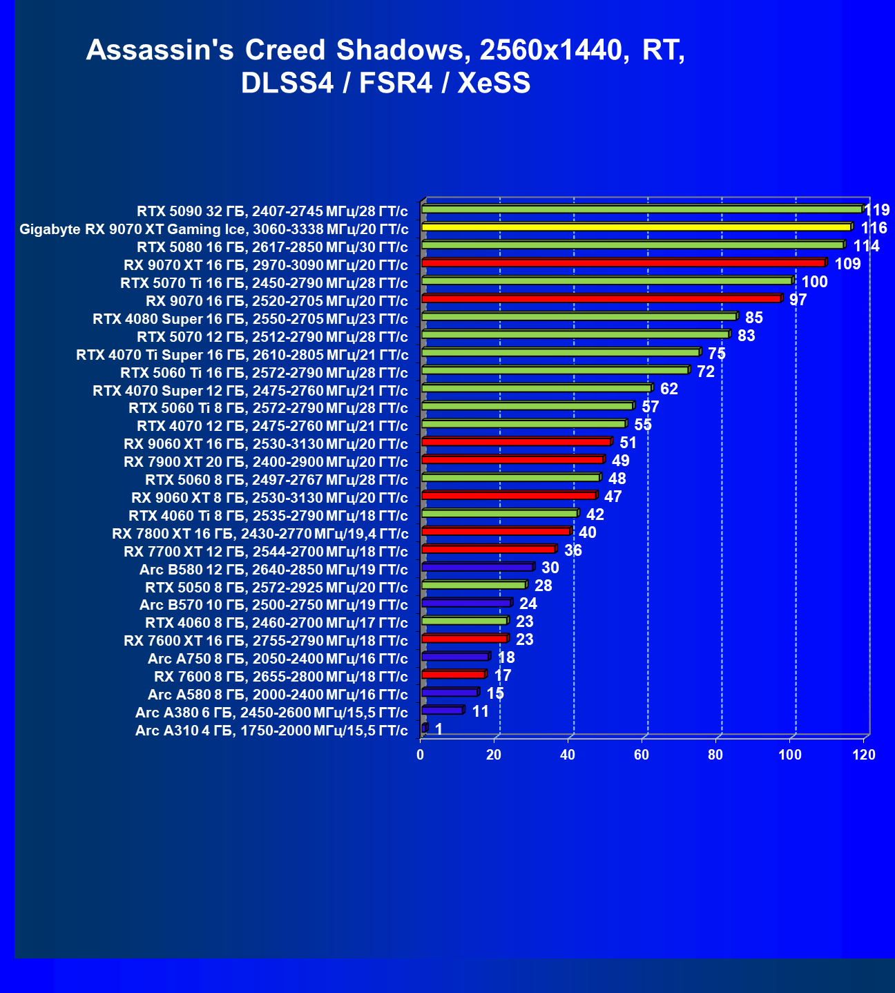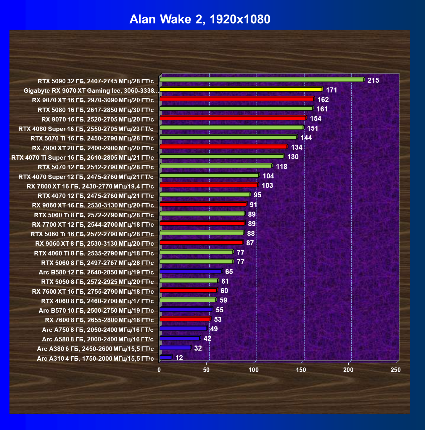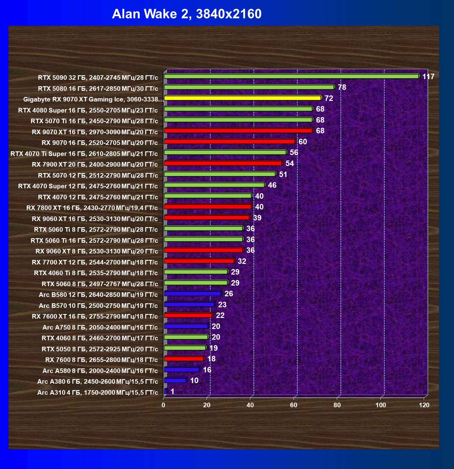 | 08 | Gigabyte RX 9070 XT Gaming Ice, 3060—3338 МГц/20 ГТ/с | 627 | 5333 | 85 000 |