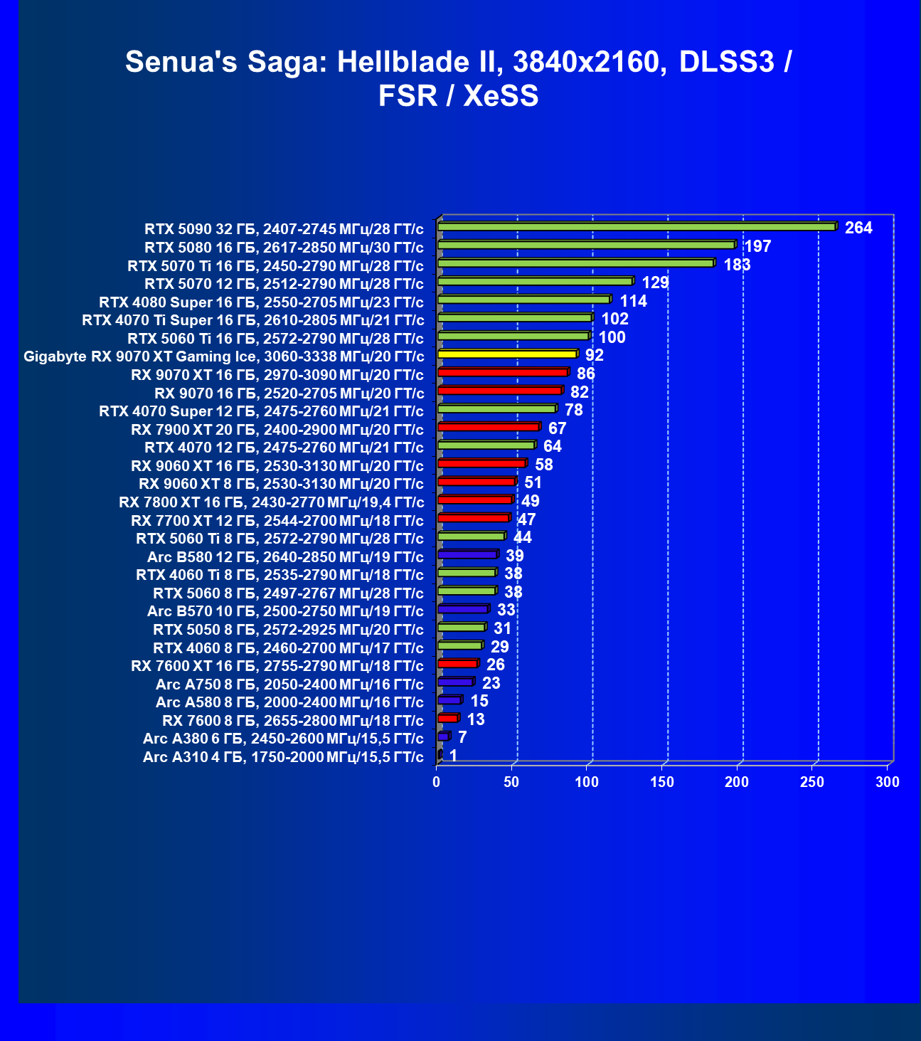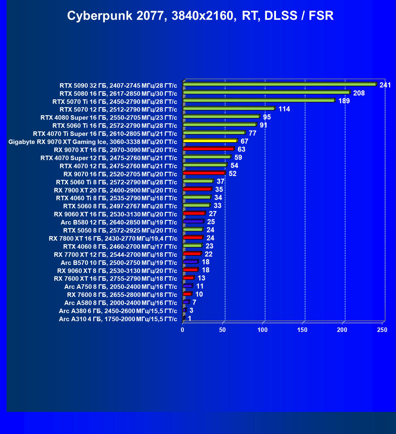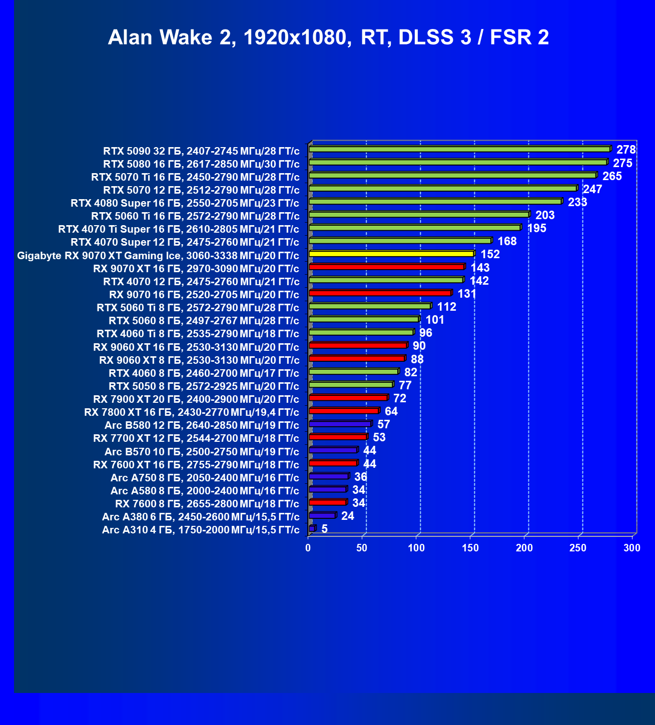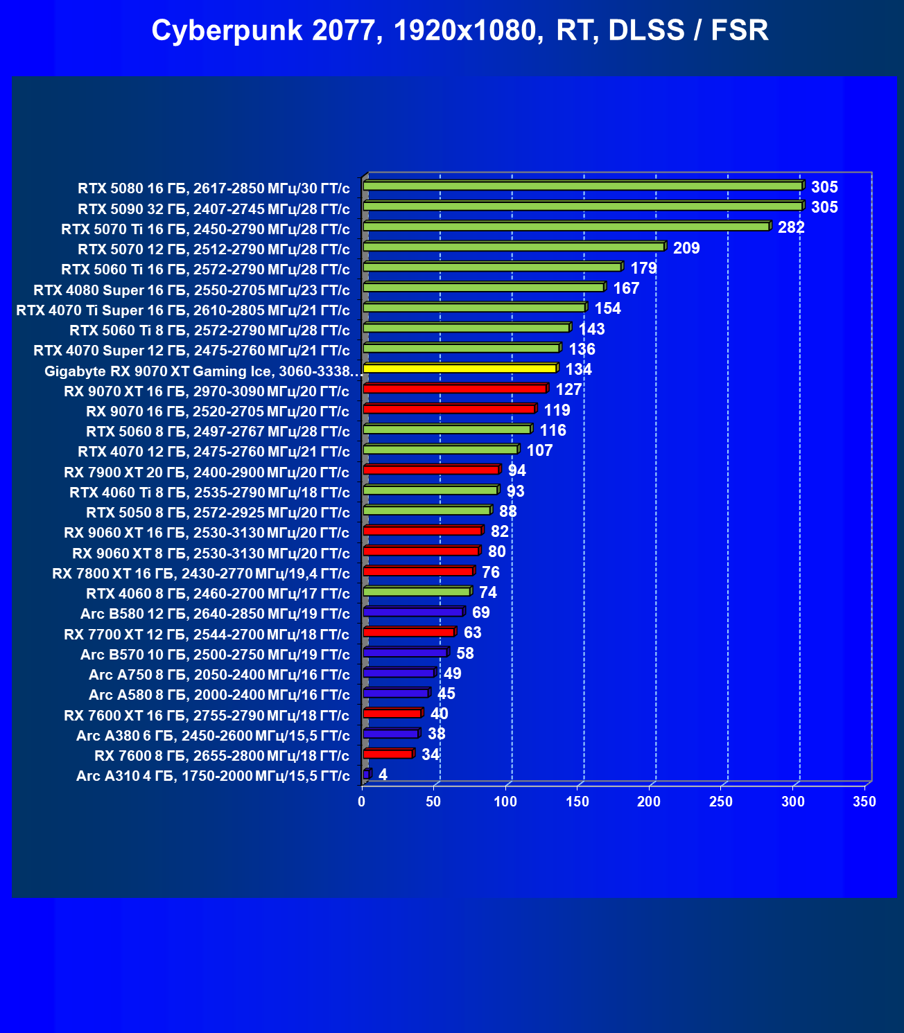 | 04 | Gigabyte RX 9070 XT Gaming Ice, 3060—3338 МГц/20 ГТ/с | 301 | 2563 | 85 000 |