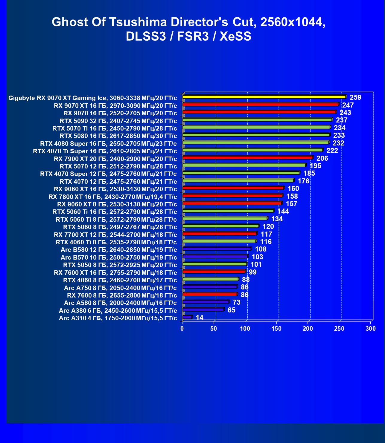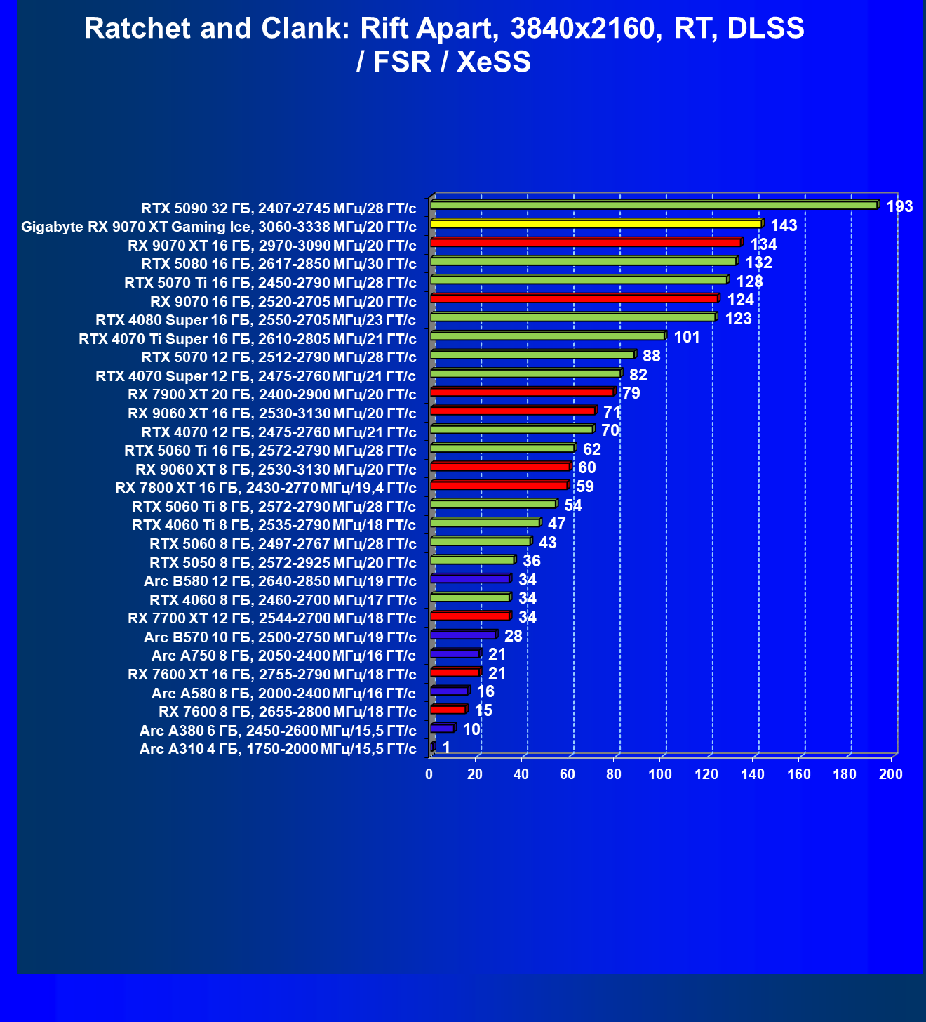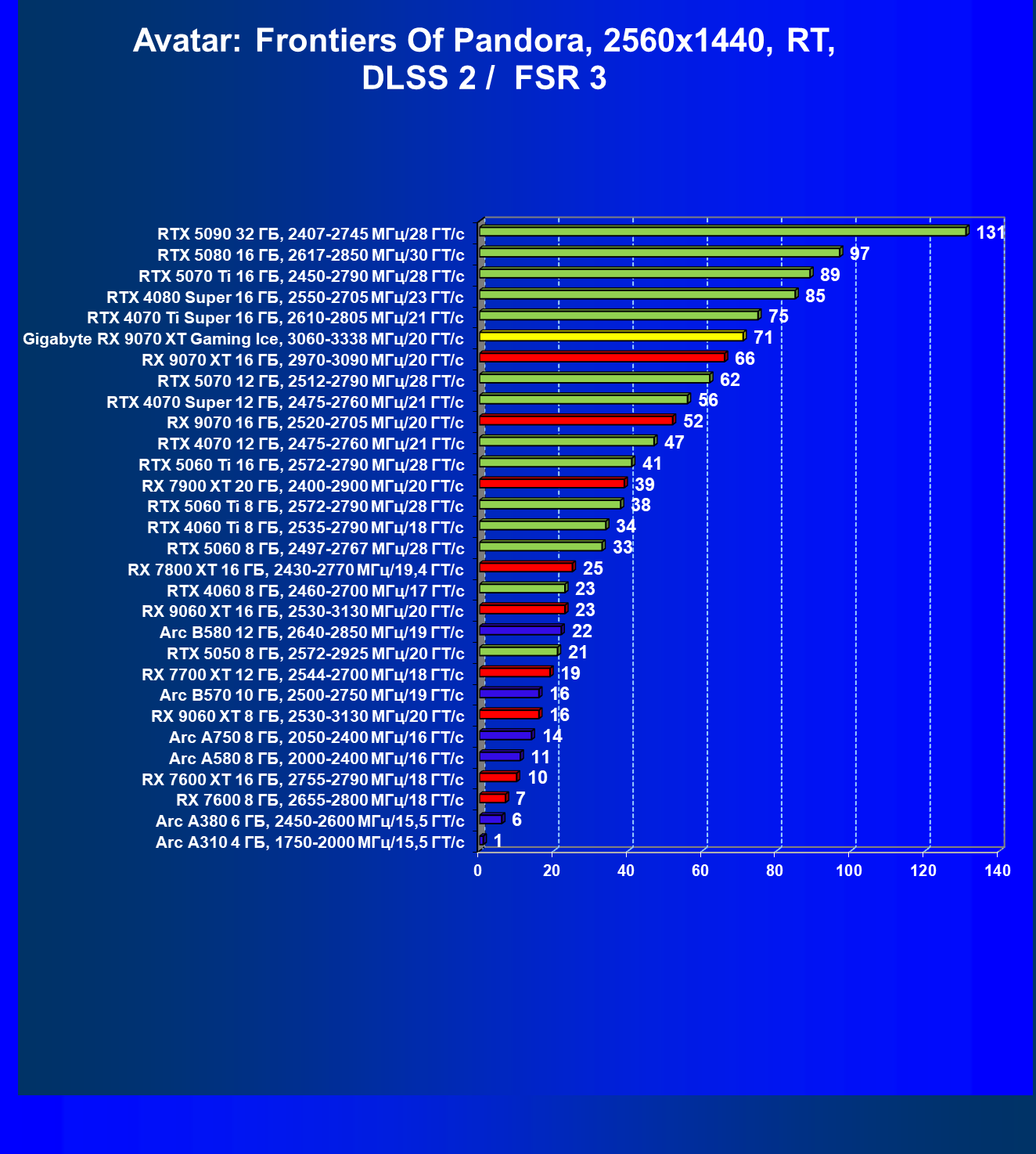 | 04 | Gigabyte RX 9070 XT Gaming Ice, 3060—3338 МГц/20 ГТ/с | 301 | 2563 | 85 000 |