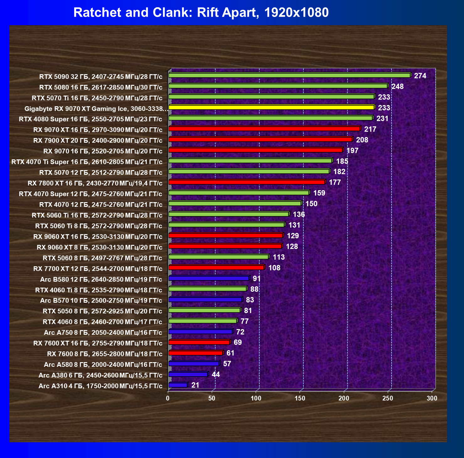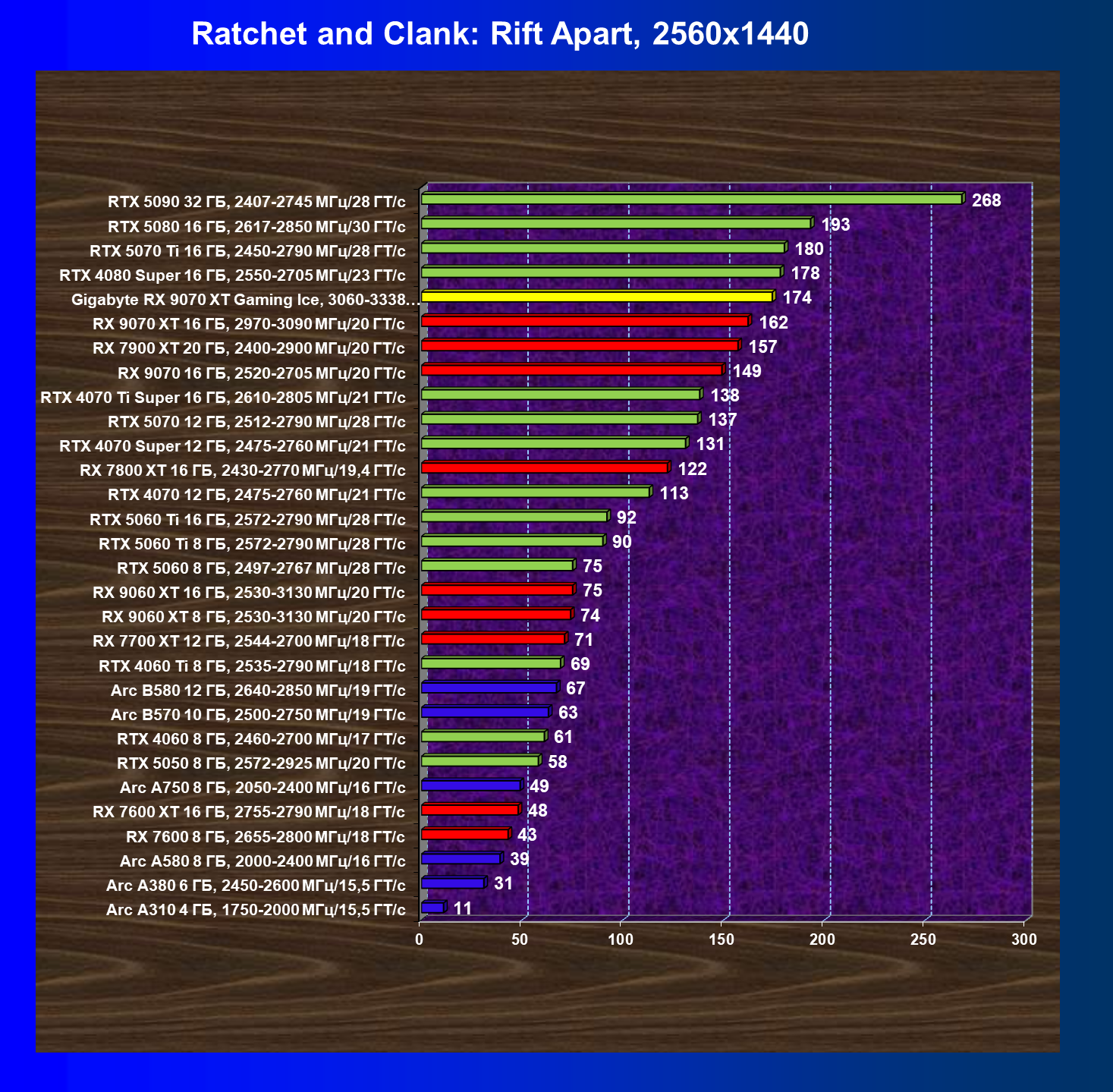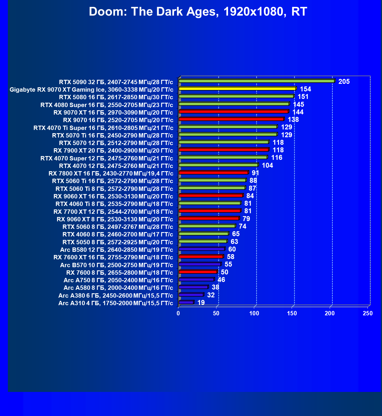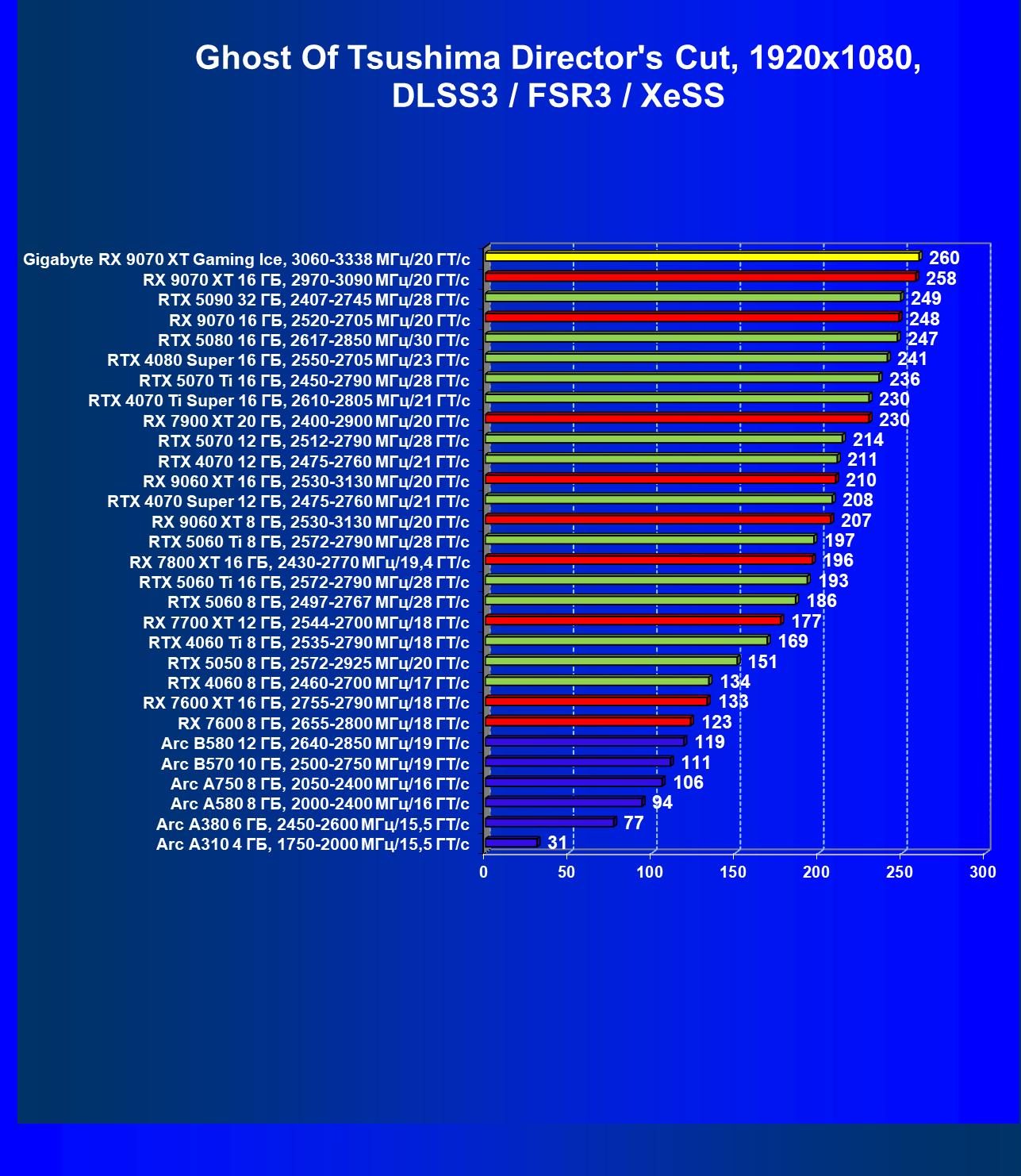 | 04 | Gigabyte RX 9070 XT Gaming Ice, 3060—3338 МГц/20 ГТ/с | 301 | 2563 | 85 000 |