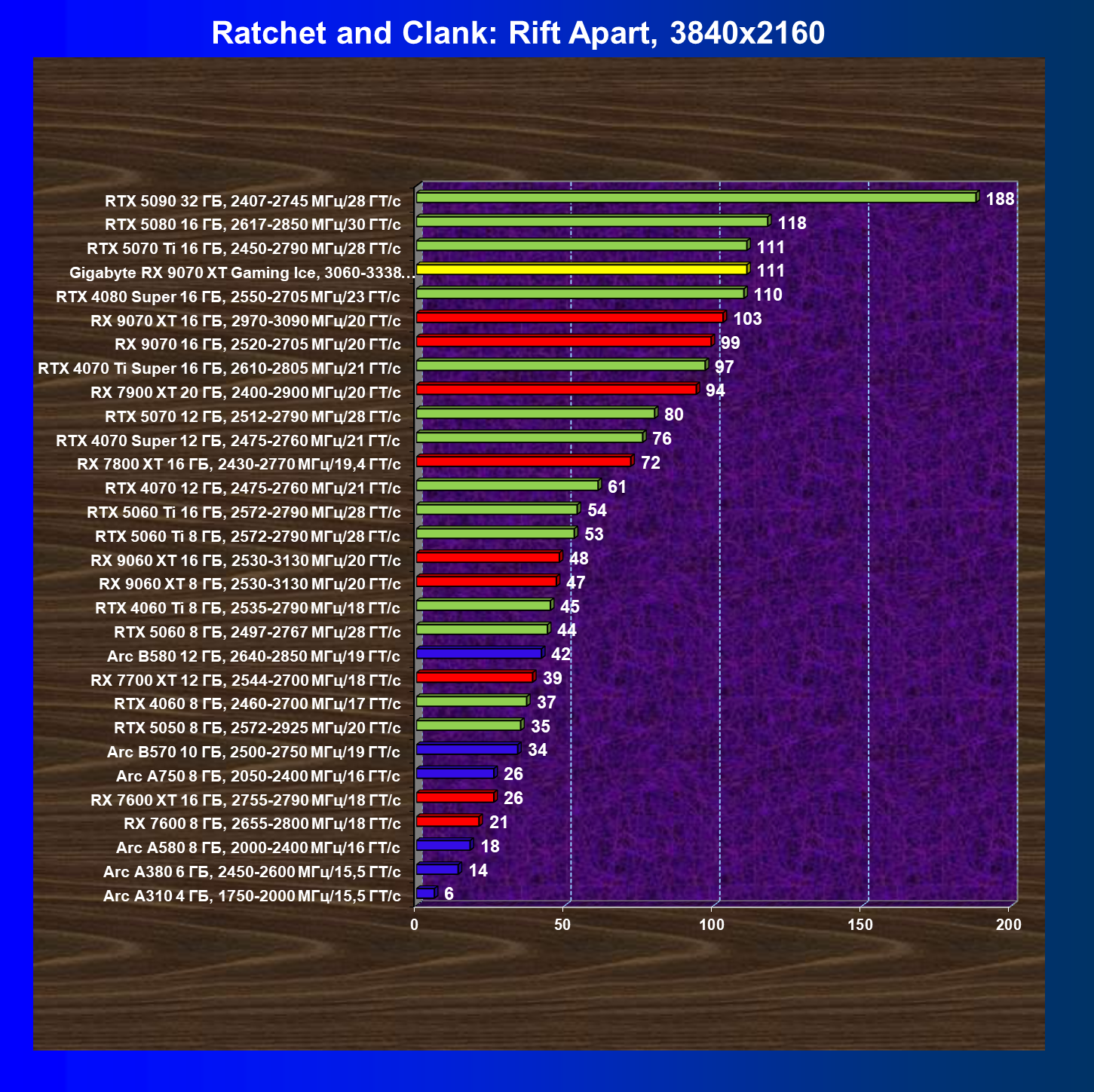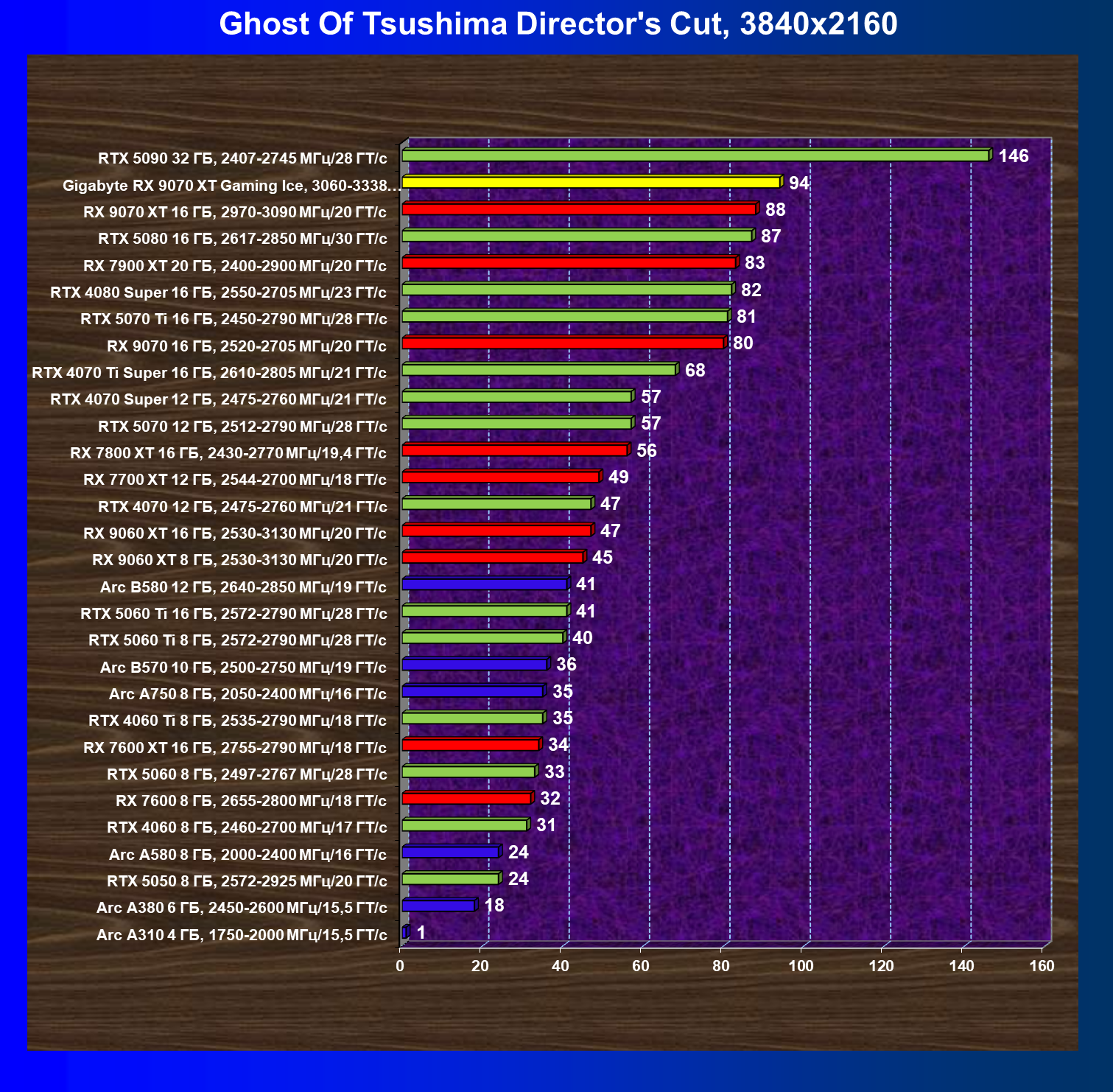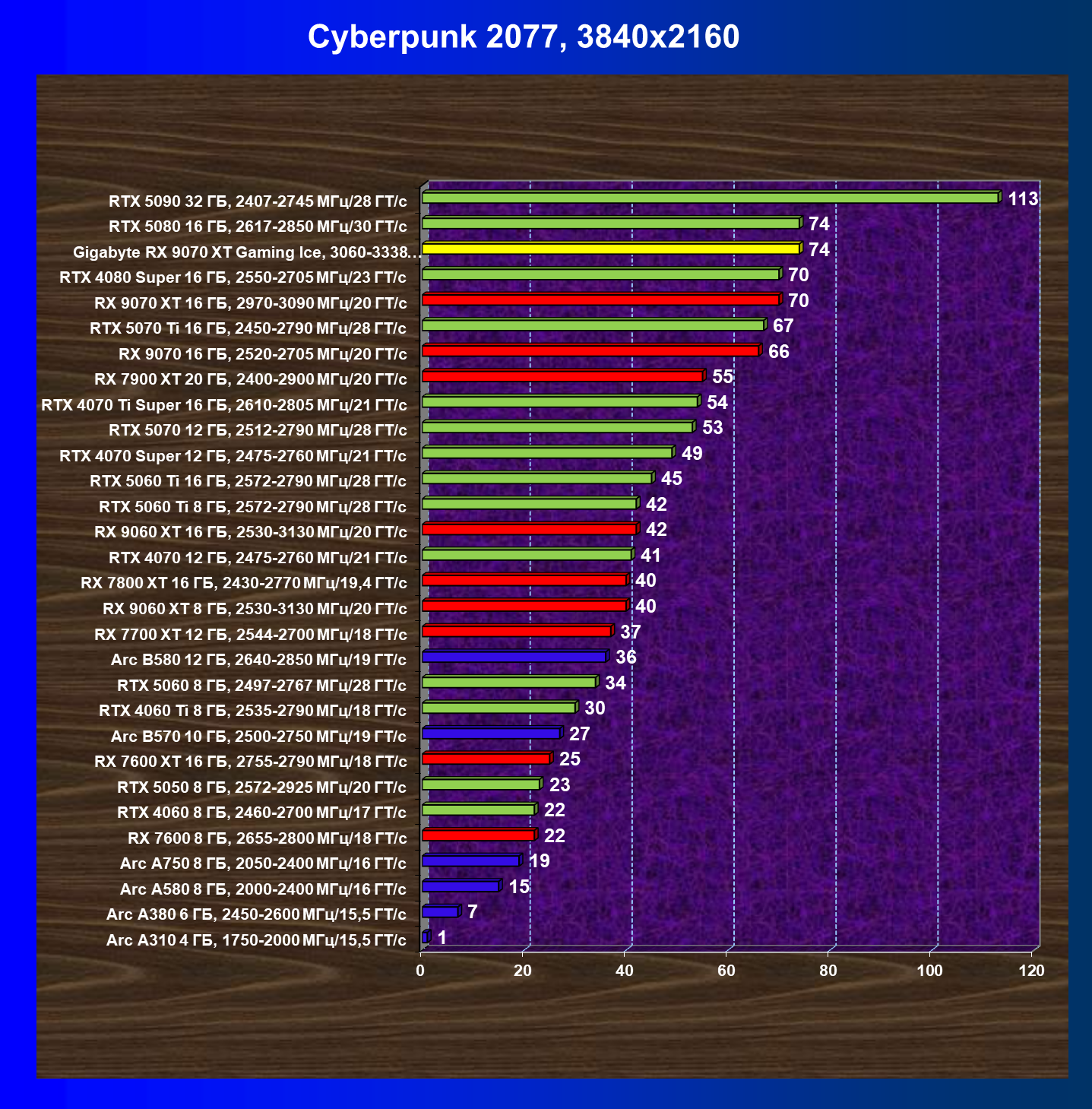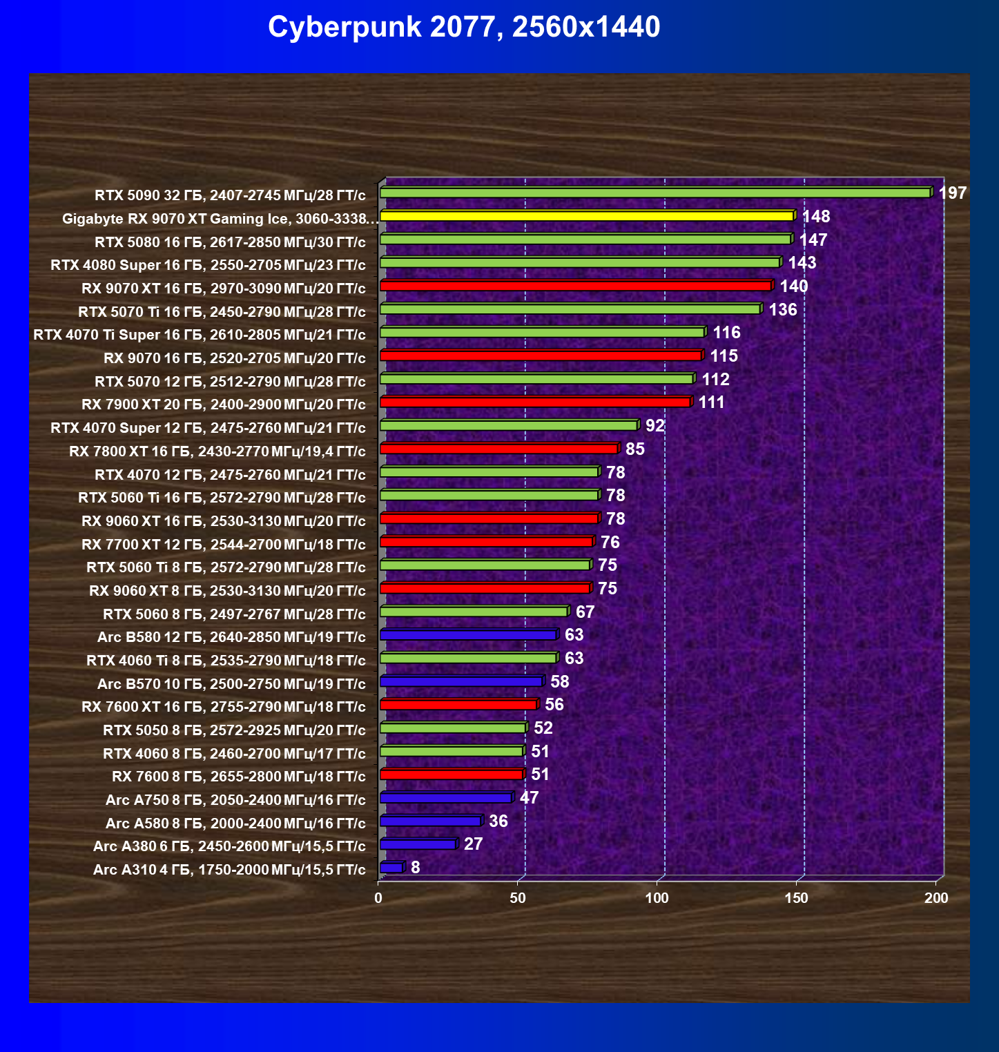 | 08 | RX 9070 XT 16 ГБ, 2970—3090 МГц/20 ГТ/с | 289 | 2400 | 83 000 |