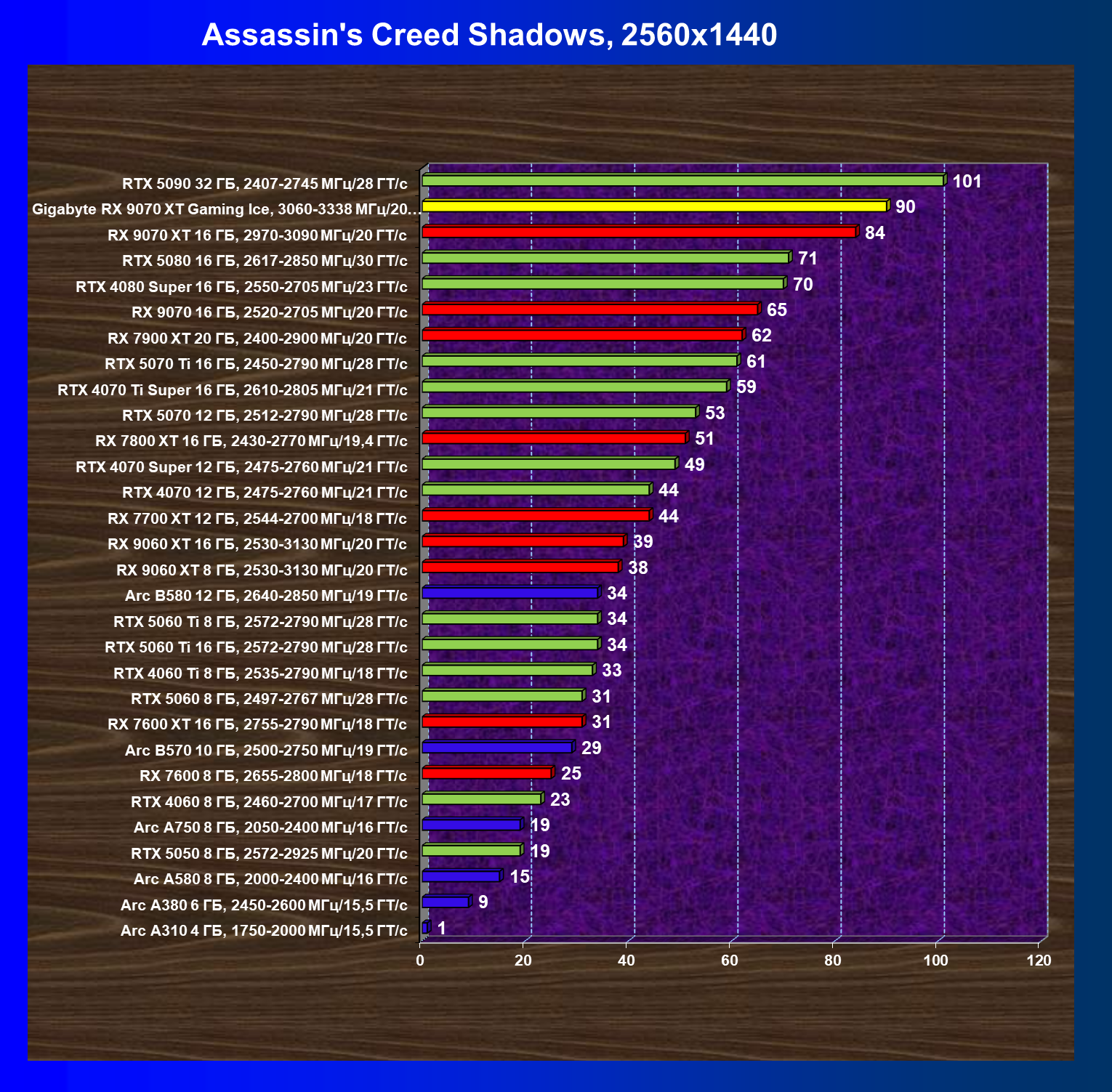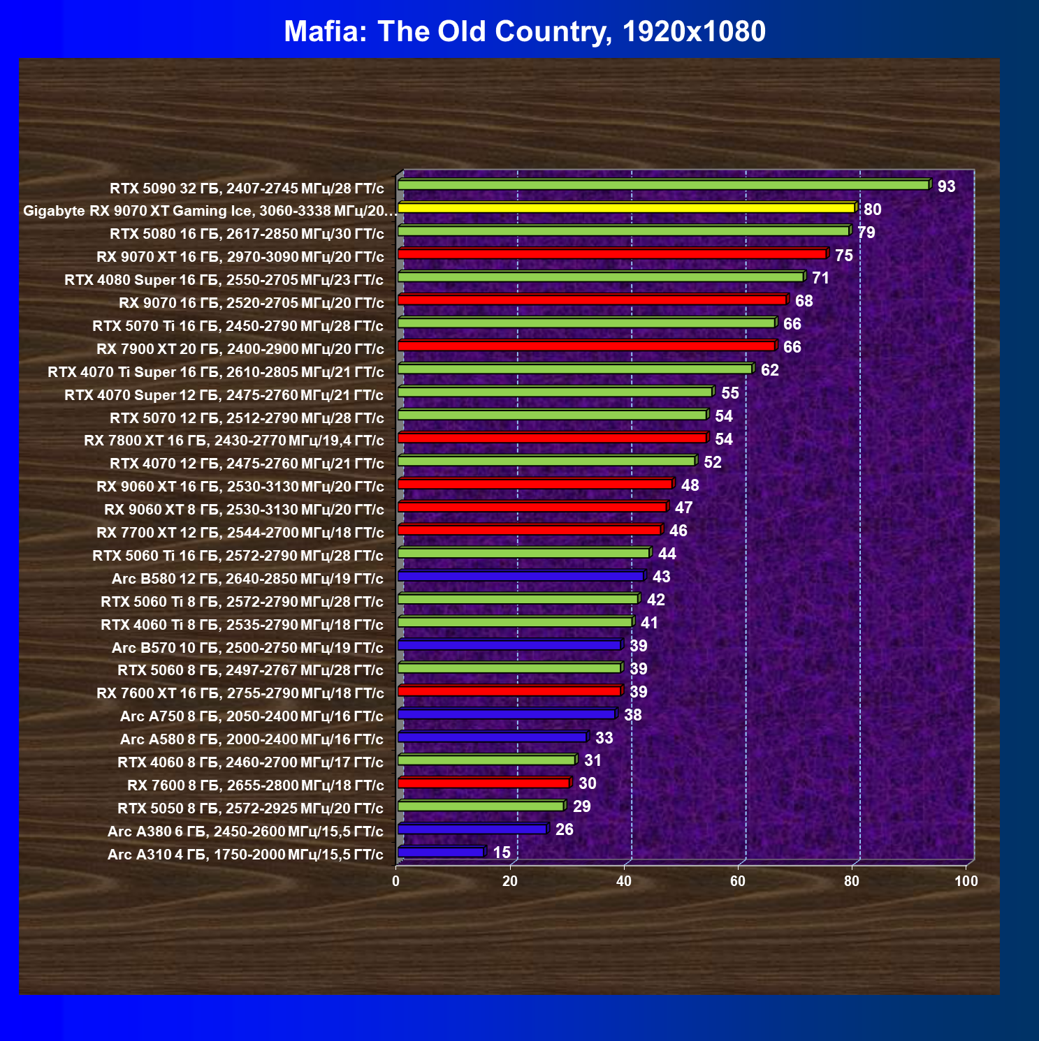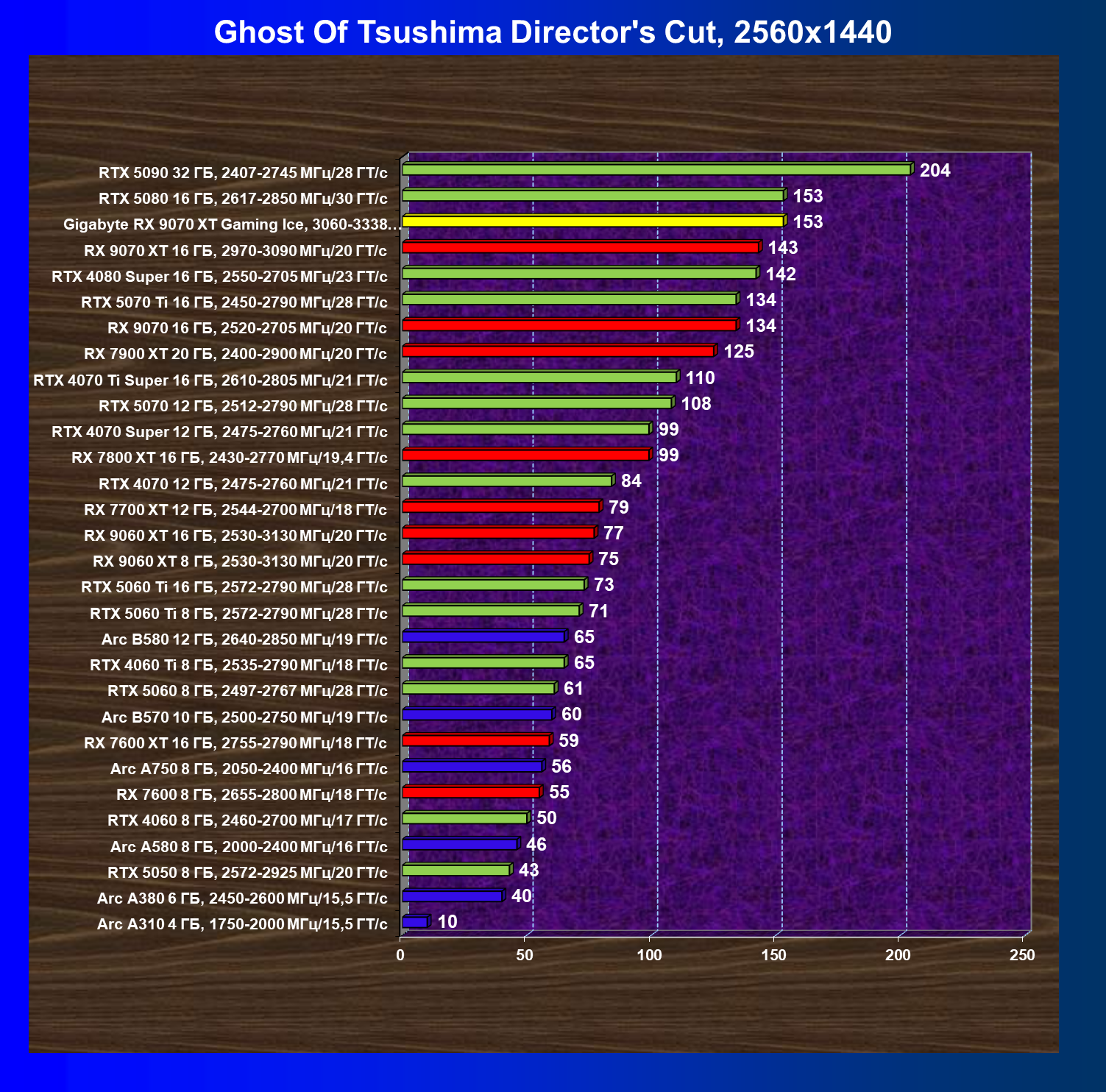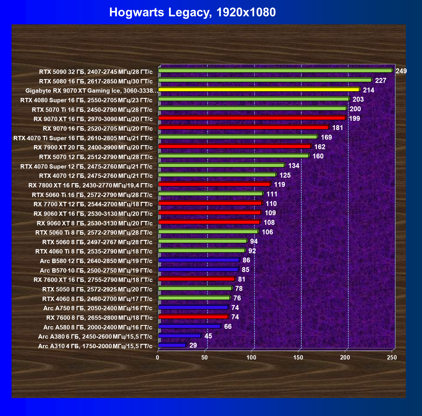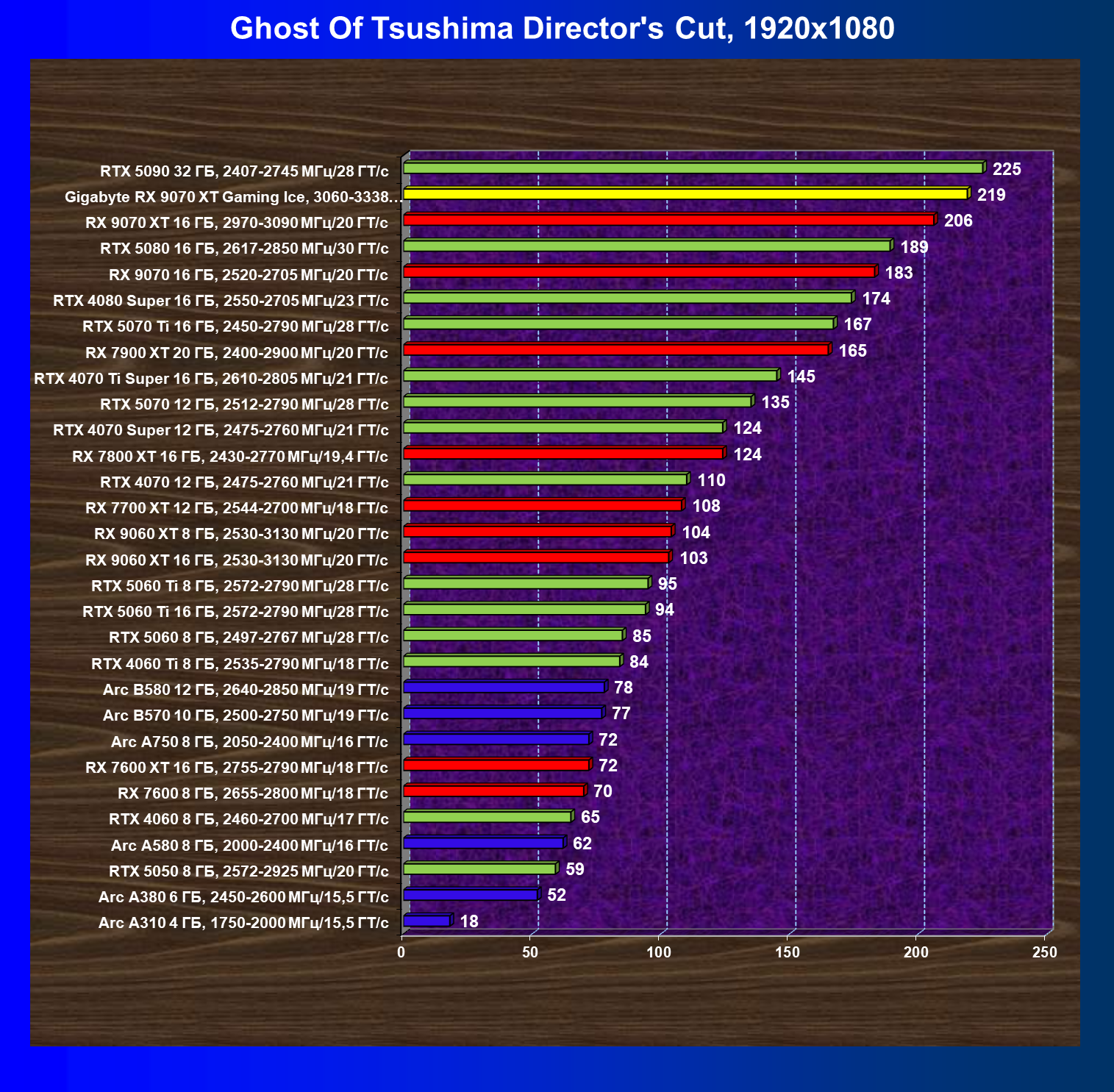 | 08 | RX 9070 XT 16 ГБ, 2970—3090 МГц/20 ГТ/с | 289 | 2400 | 83 000 |