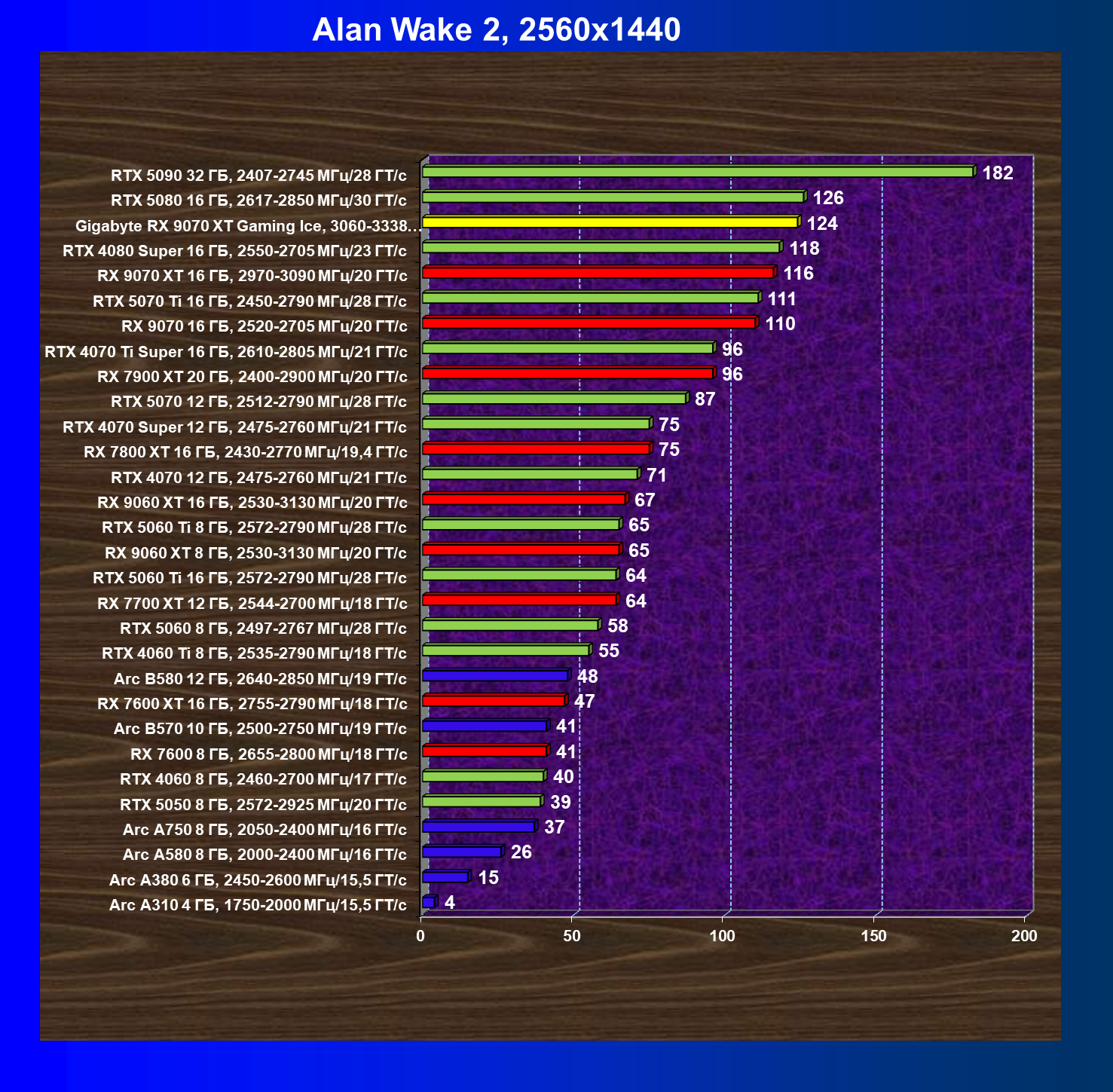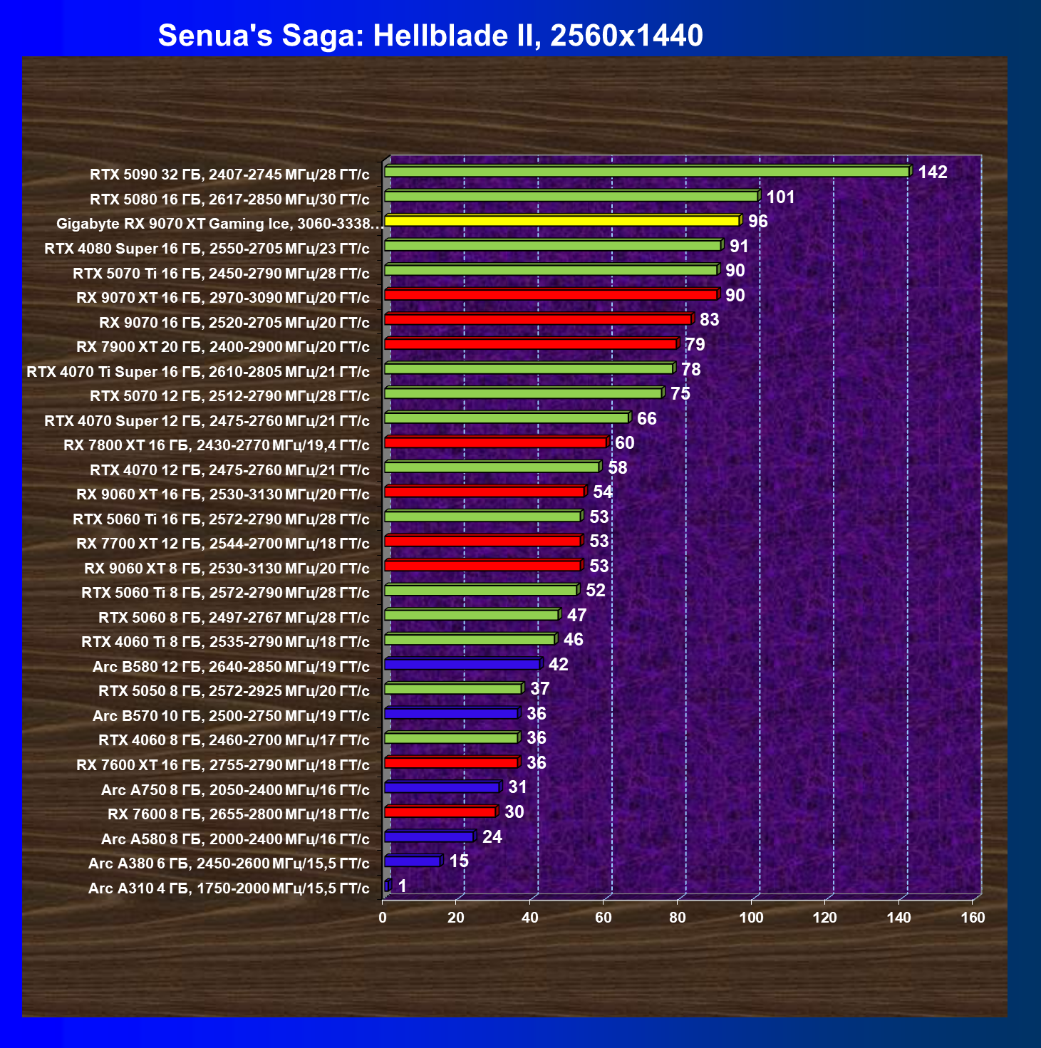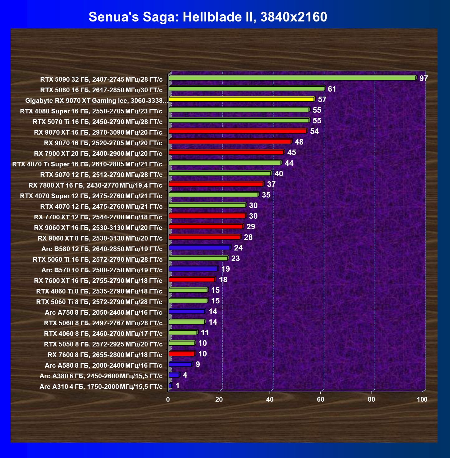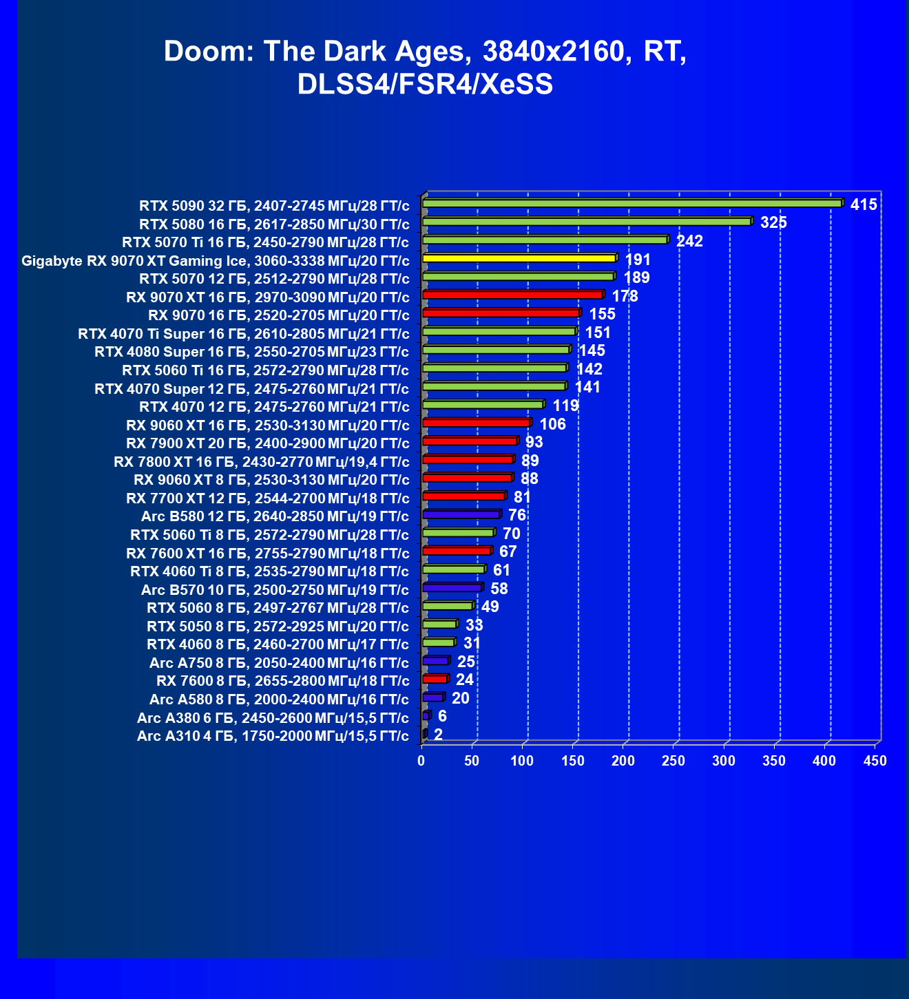 | 05 | RX 9070 XT 16 ГБ, 2970—3090 МГц/20 ГТ/с | 2400 | 289 | 83 000 |