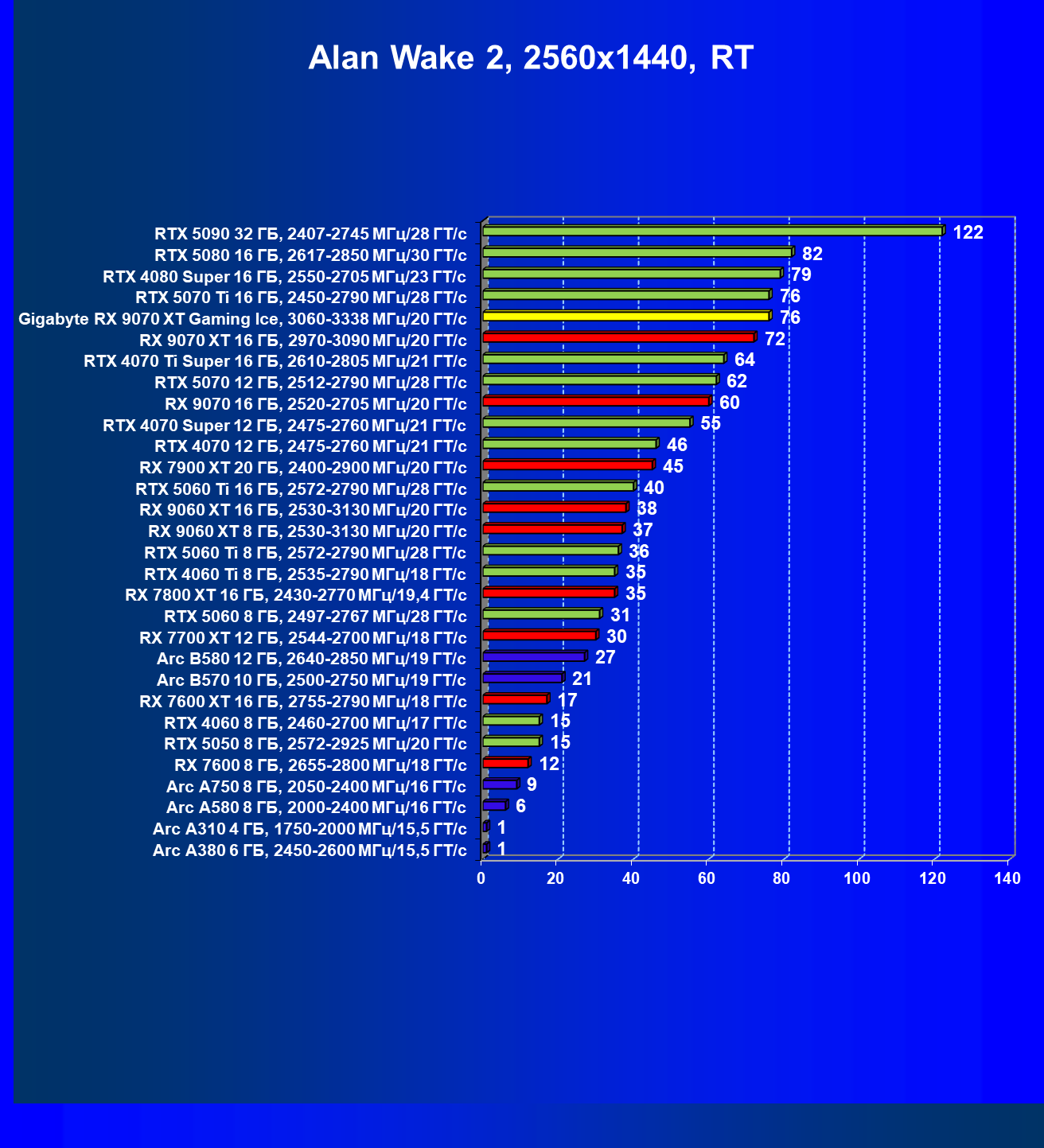 | 05 | Gigabyte RX 9070 XT Gaming Ice, 3060—3338 МГц/20 ГТ/с | 5333 | 627 | 85 000 |