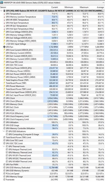 После прогона под нагрузкой максимальная температура ядра не превысила 72 градусов (hot spot — 95 °C), а микросхем памяти — 79 градусов, что также является хорошим результатом. Энергопотребление карты доходило до 331 Вт.