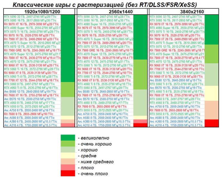 Рейтинг составлен по всем тестам без использования технологий трассировки лучей. Этот рейтинг нормирован по наиболее слабому ускорителю из группы карт — Arc A310 (то есть сочетание скорости и функций Arc A310 приняты за 100%). Рейтинги ведутся по 30 регулярно исследуемым нами акселераторам в рамках проекта Лучшая видеокарта месяца. В данном случае из общего списка выбрана группа карт для анализа, в которую входят Radeon RX 9070 XT и его конкуренты.