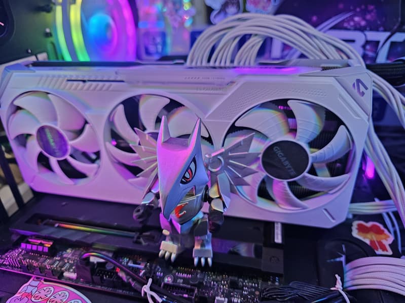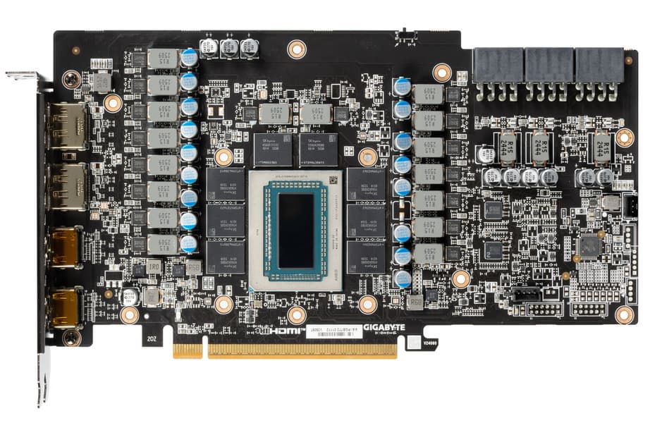Протестированная карта Gigabyte имеет мощную и эффективную СО, которая к тому же достаточно тихая. Карта имеет стандартные размеры: 29 см в длину, 13 см в высоту, де-факто 3 слота по толщине. Набор видеовыходов стандартный: 3 DP 2.1b и 1 HDMI 2.1b. Карта обладает простой подсветкой, которую можно синхронизировать с материнскими платами только производства Gigabyte с помощью утилиты Gigabyte Control Center. Максимальная потребляемая мощность составляет 331 Вт, питание осуществляется через три 8-контактных разъема версии PCIe 2.0.