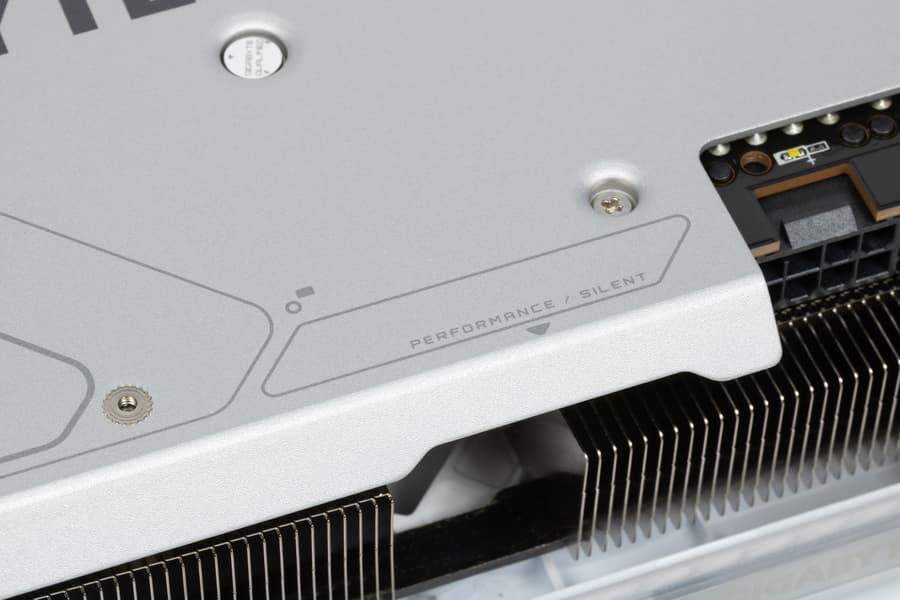 Карта имеет два режима работы, они заложены в двух вариантах BIOS, которые переключаются с помощью переключателя на переднем торце карты: P (performance / производительный) и S (silent / тихий). Разница между режимами заключается, по сути, только в оборотах вентиляторов, предел энергопотребления в обоих случаях составляет 350 Вт.