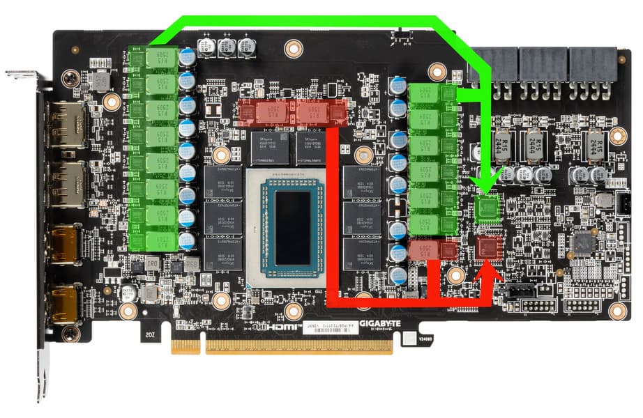 Зеленым цветом отмечена схема питания ядра (14 фаз), красным — памяти (3 фазы).