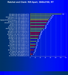 Рейтинг составлен по 10 тестам, в которых используется технология трассировки лучей и одновременно технология Nvidia DLSS, AMD FSR или Intel XeSS. Этот рейтинг нормирован по самому слабому ускорителю в данной группе — Arc A310 (то есть сочетание скорости и функций Arc A310 приняты за 100%).
