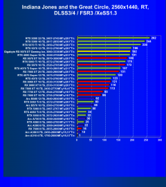 Результаты тестов со включенной аппаратной трассировкой лучей и/или DLSS/FSR/XeSS в разрешениях 1920×1080, 2560×1440 и 3840×2160