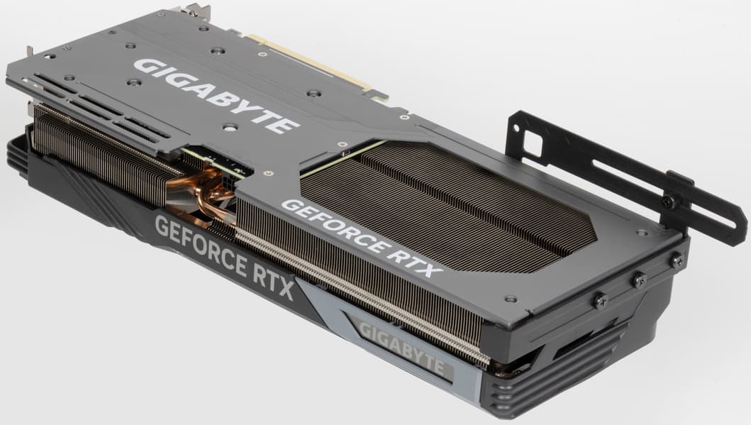 Система охлаждения продувается насквозь крайним вентилятором. У карты Gigabyte основой кулера является огромный многосекционный пластинчатый никелированный радиатор с тепловыми трубками, распределяющими тепло по ребрам радиатора, что на деле демонстрирует высокую эффективность теплоотвода от горячих компонентов. Трубки припаяны к огромной медной подошве, под которой скрывается испарительная камера.