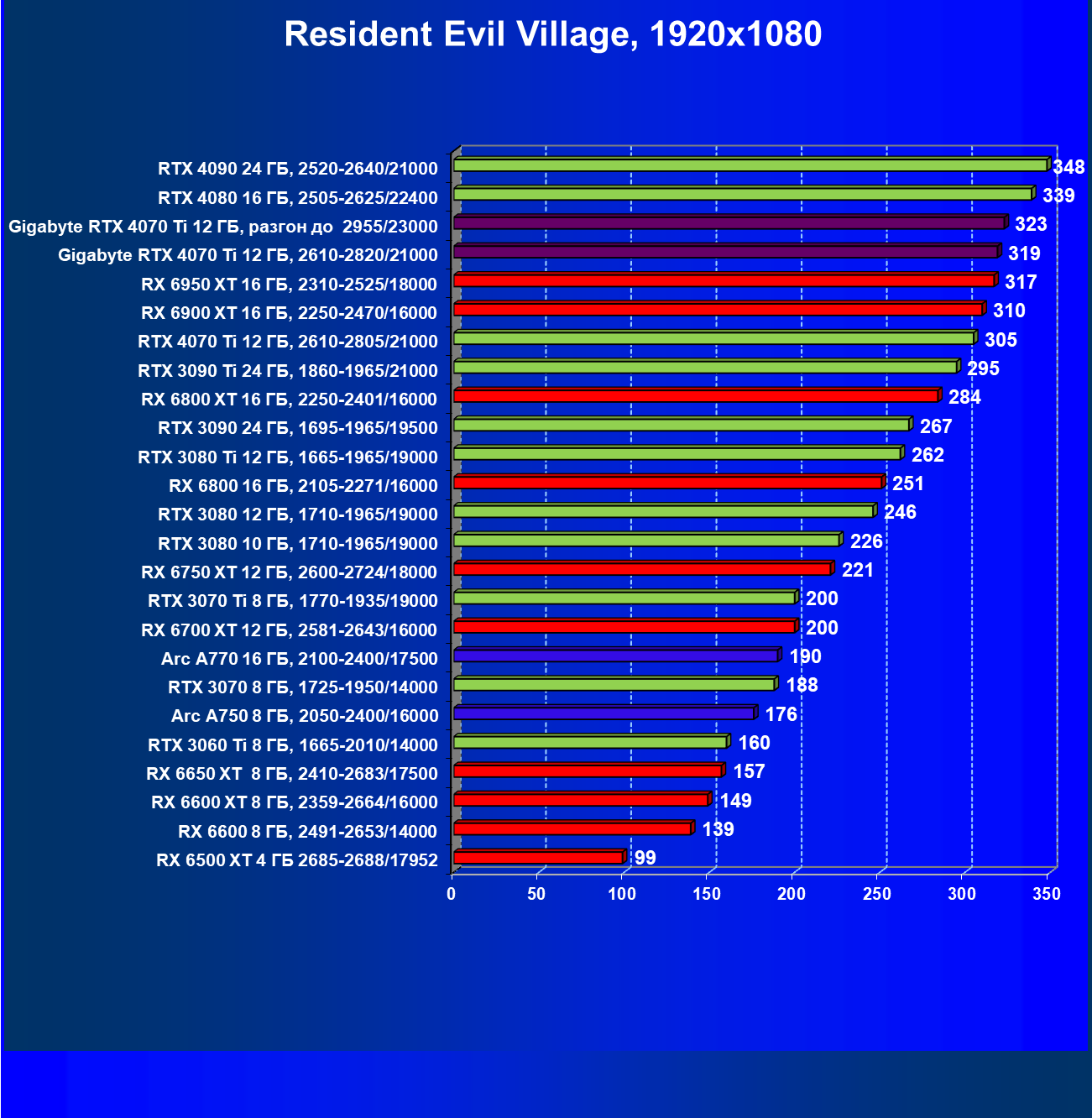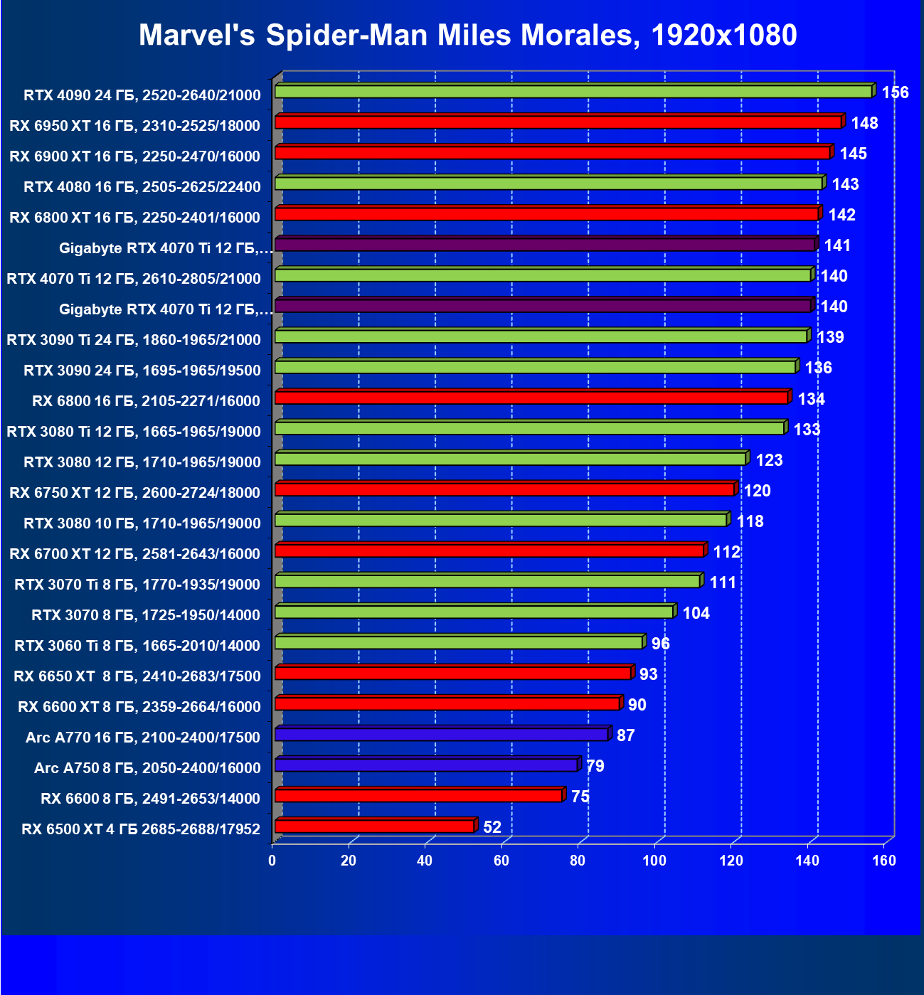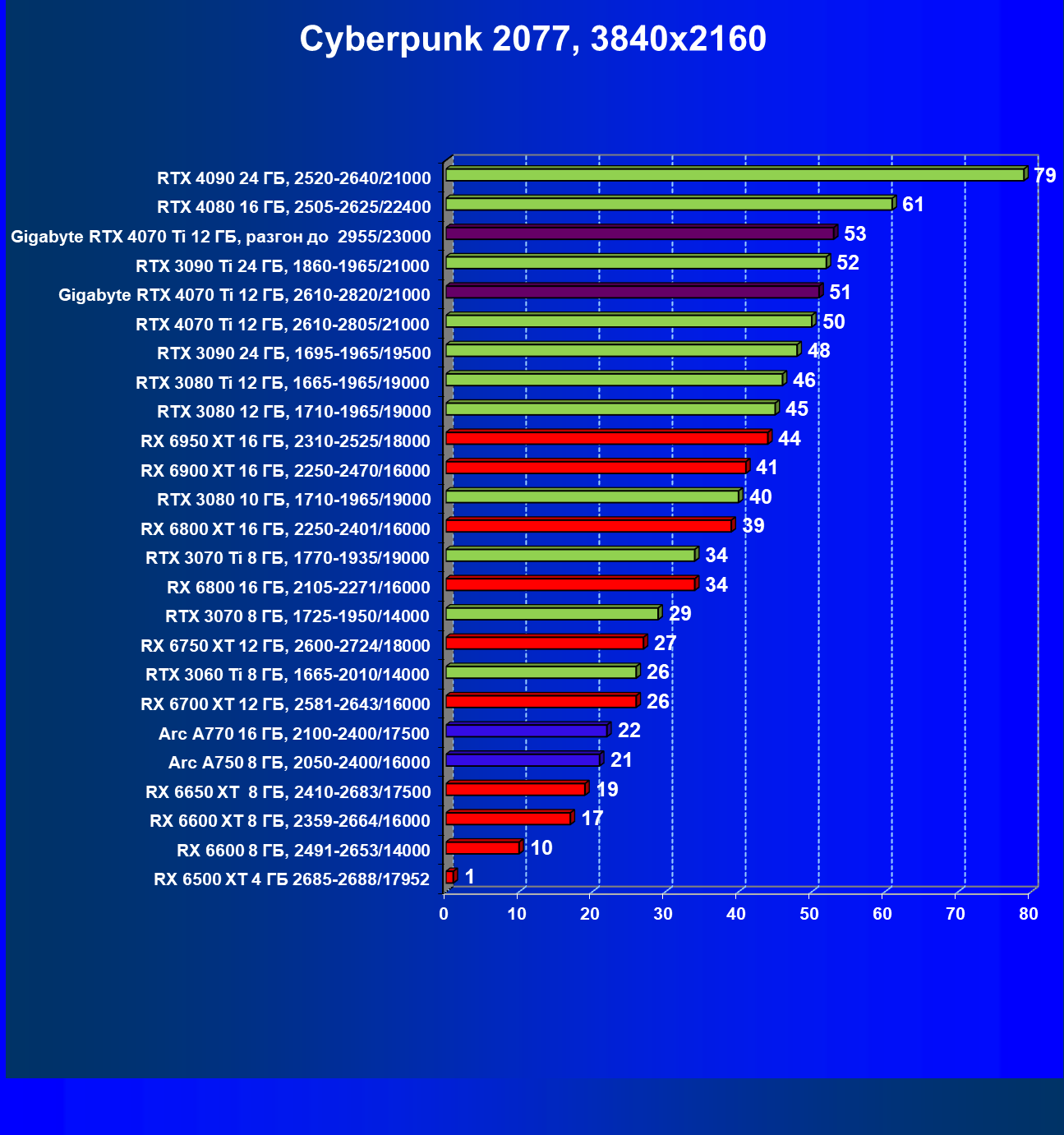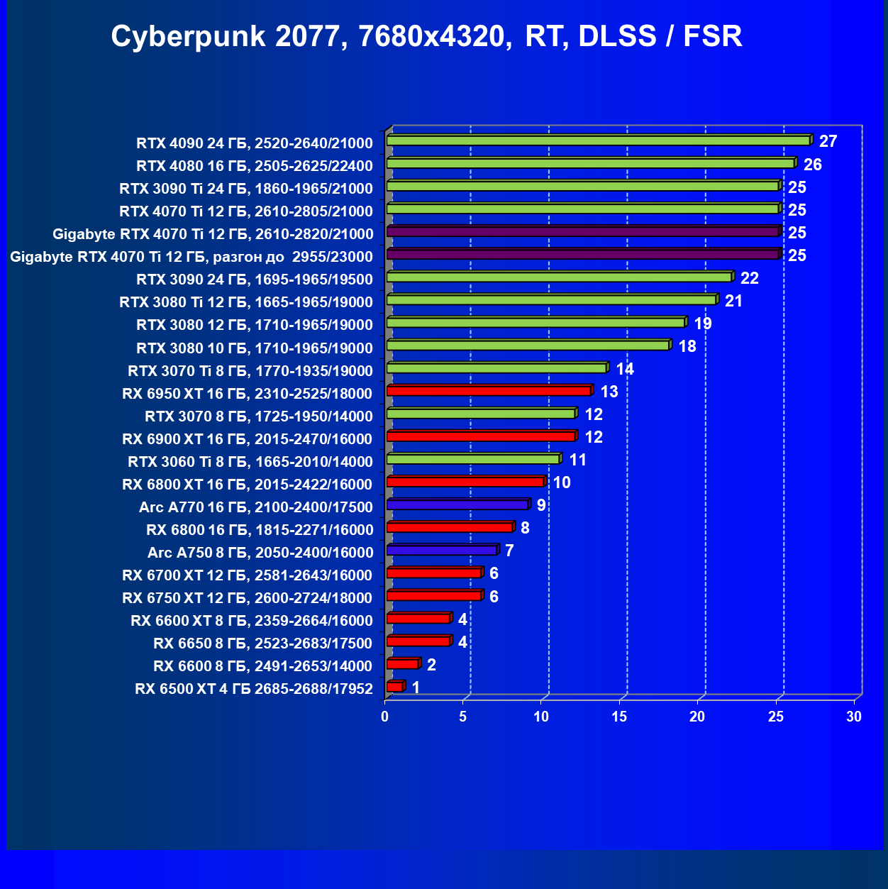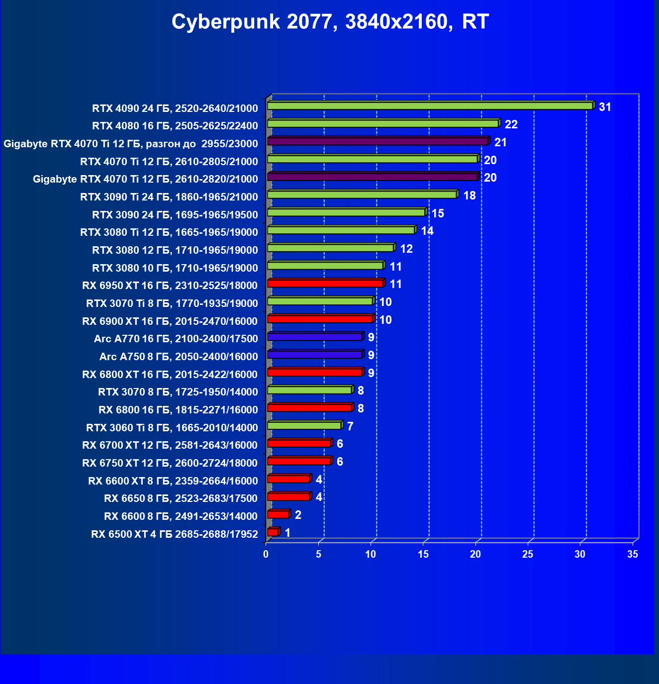 | 03 | Gigabyte RTX 4070 Ti Gaming OC 12 ГБ, 2610—2820/21000 | 151 | 1270 | 84 000 |
