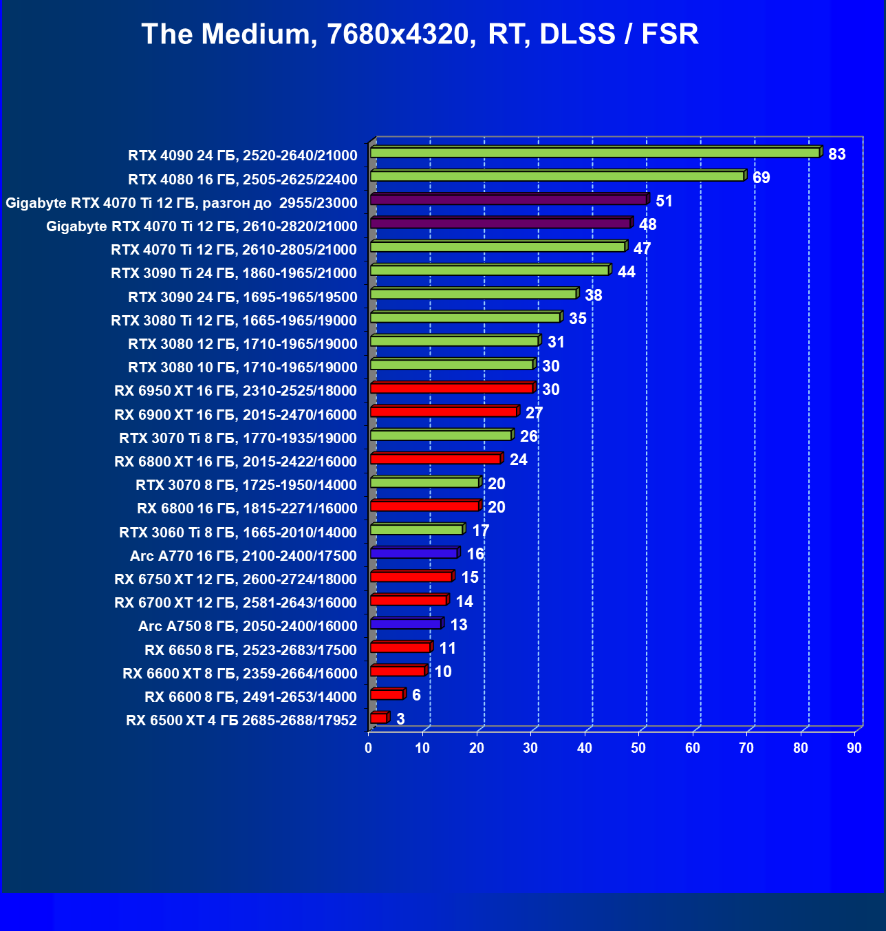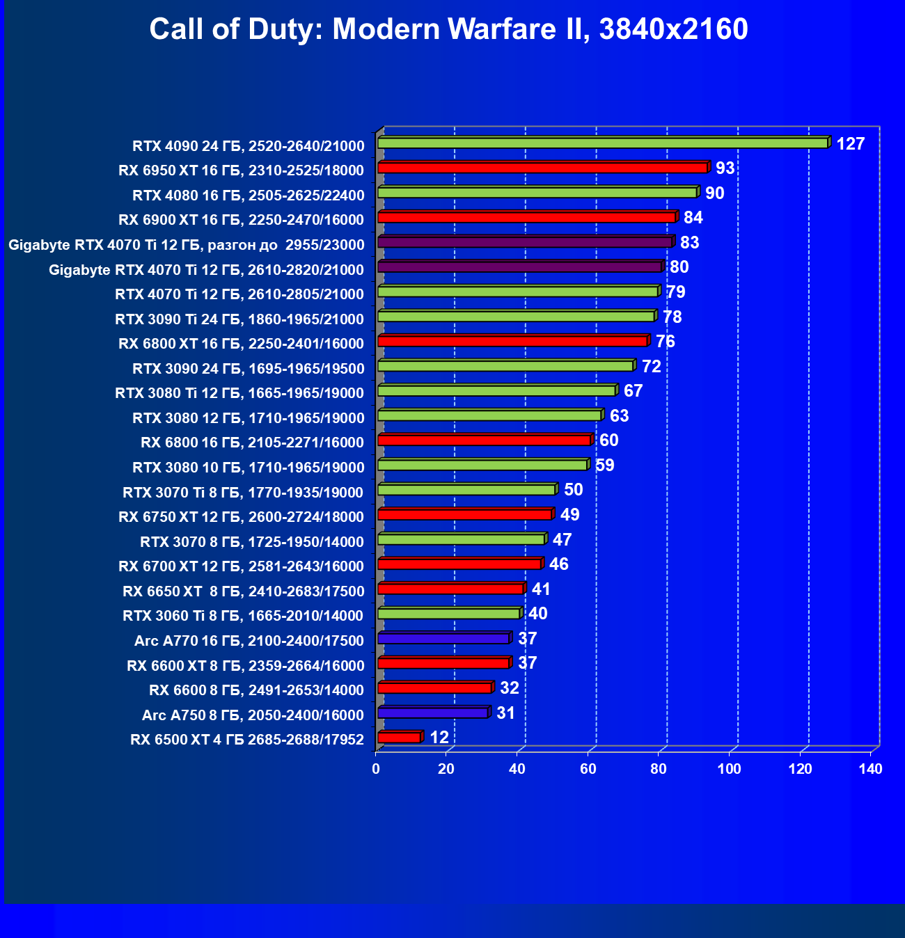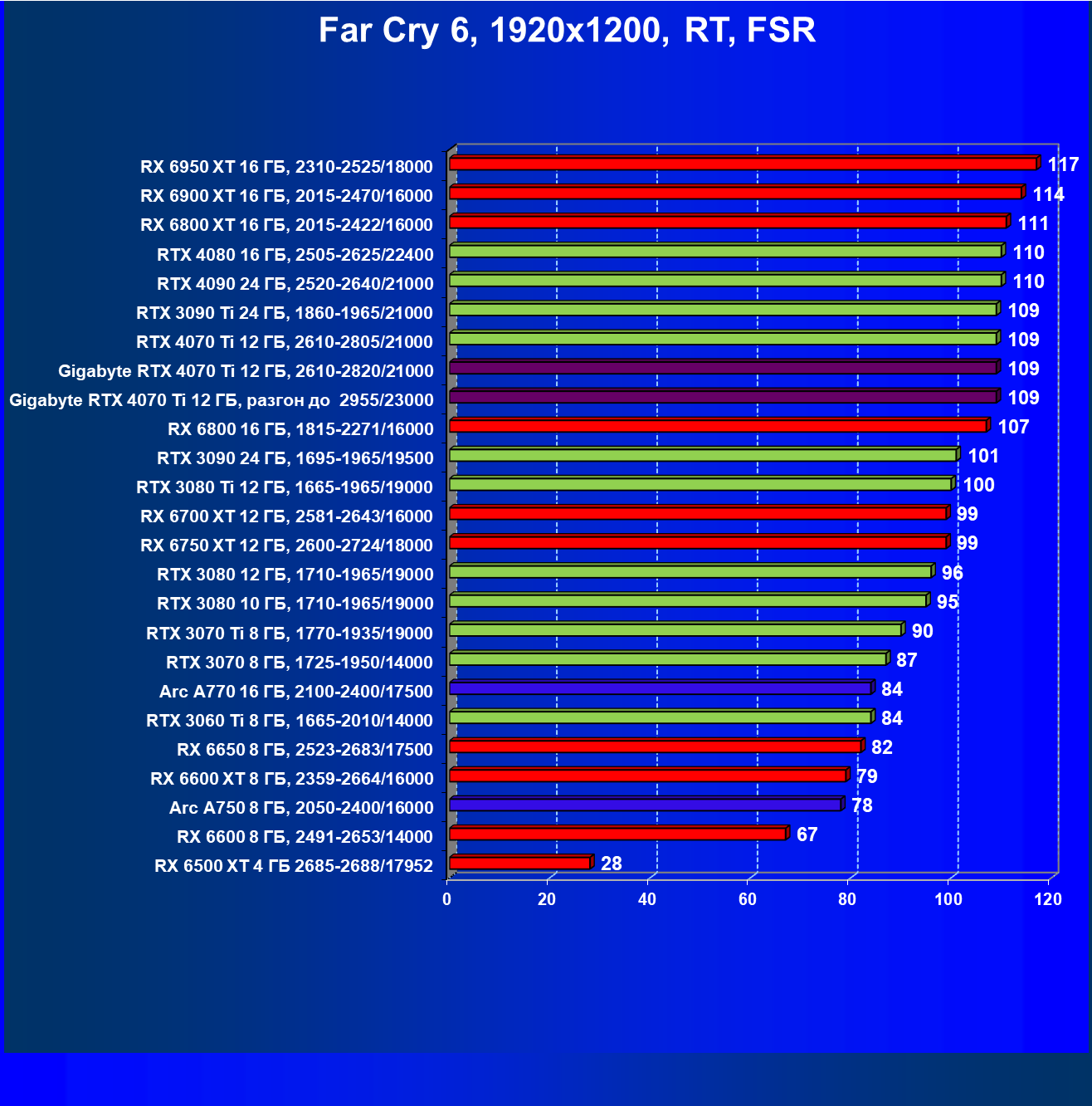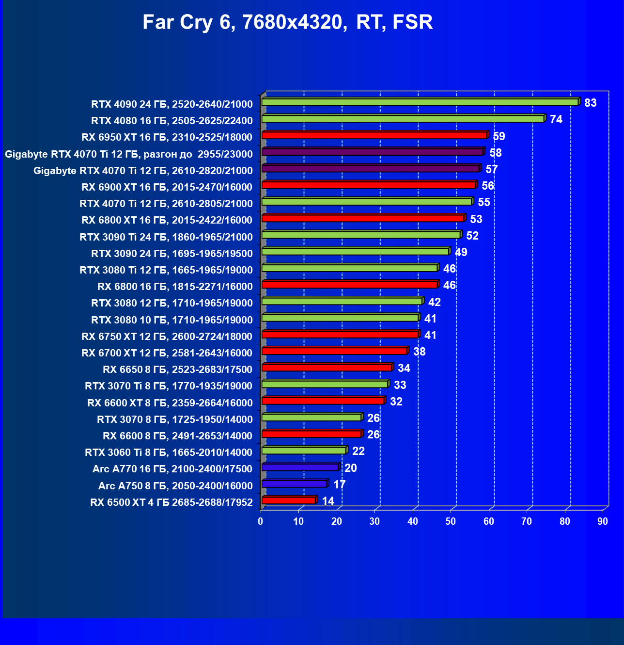 | 23 | RX 6950 XT 16 ГБ, 2310—2525/18000 | 107 | 892 | 83 100 |